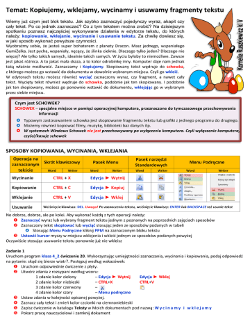 Temat: Kopiujemy, wklejamy, wycinamy i usuwamy fragmenty tekstu Wiemy już czym jest blok tekstu. Jak szybko zaznaczyć pojedynczy wyraz, akapit czy cały tekst. Po co jednak zaznaczać? Co z tym tekstem można zrobić? Na dzisiejszym spotkaniu poznasz najczęściej wykonywane działania w edytorze tekstu, do których należy: kopiowanie, wklejanie, wycinanie i usuwanie tekstu. Za chwilę dowiesz się, w jaki sposób wykonać powyższe czynności. Wyobraźmy sobie, że jesteś super bohaterem z planety Dracon. Masz jednego, wspaniałego GumiŻelka. Jest pycha, wspaniały, nęcący, że ślinka cieknie. Dlaczego tylko jeden? Dlaczego nie więcej? Ale tylko takich samych, idealnie takich samych. W życiu byłoby to niemożliwe. Zawsze jest jakaś różnica. A to jakaś mała skaza, a to kolor odrobinkę inny. Komputer daje nam jednak taką właśnie możliwość. Zaznaczamy i Kopiujemy. Skopiowany tekst wędruje do schowka, z którego możesz go wstawić do dokumentu w dowolnie wybranym miejscu. Czyli go wkleić. W edytorach tekstu możesz również wyciąć zaznaczony wyraz, czy fragment, a nawet cały tekst. Wycięty tekst również wędruje do schowka, podobnie jak ten skopiowany. I podobnie jak ten skopiowany, możesz go ponownie wstawić do dokumentu, wklejając go w wybranym przez siebie miejscu. Czym jest SCHOWEK? SCHOWEK – specjalne miejsce w pamięci operacyjnej komputera, przeznaczone do tymczasowego przechowywania informacji  Typowym zastosowaniem schowka jest skopiowanie fragmentu tekstu lub grafiki z jednego programu do drugiego.  Możemy również kopiować filmy, muzykę, biblioteki baz danych itp.  W systemach Windows Schowek nie jest przechowywany po wyłączeniu komputera. Czyli wyłączenie komputera, czyści/kasuje schowek SPOSOBY KOPIOWANIA, WYCINANIA, WKLEJANIA No dobrze, dobrze, ale po kolei. Aby wykonać każdą z tych operacji należy:  Zaznaczyć wyraz lub wybrany fragment tekstu jednym z poznanych na poprzednich zajęciach sposobów  Zaznaczony tekst skopiować lub wyciąć stosując jeden ze sposobów podanych w tabeli  Stosując Menu Podręczne kliknij PPM na zaznaczonym bloku tekstu  Ustawić kursor myszy w miejscu wklejenia i wkleić jednym ze sposobów podanych powyżej Oczywiście stosując usuwanie tekstu ponownie już nie wkleisz Zadanie 1 Uruchom program klasa 4_2 ćwiczenie 20. Wykorzystując umiejętności zaznaczania, wycinania i kopiowania, podaj odpowiedź na pytanie: skąd się bierze wiatr?. Postępuj według wskazówek:  Uruchom odpowiednie ćwiczenie z płyty.  Utwórz zdania z rozsypani według wzoru: 1 zdanie kolor zielony – Edycja ► Wytnij Edycja ► Wklej 2 zdanie kolor niebieski – CTRL+X CTRL+V 3 zdanie kolor czerwony – 4 zdanie kolor szary – Menu podręczne  Ustaw zdania w kolejności opisanej powyżej.  Zaznacz cały tekst i zmień kolor czcionki na ciemnoniebieski  Zapisz ćwiczenie w katalogu Teksty w Moich dokumentach pod nazwą: W y c i n a m y i w k l e j a m y  Pokarz pracę nauczycielowi i zamknij dokument Zadanie 2 Uruchom program klasa 4_2 ćwiczenie 21. Do tekstu wkradły się złośliwe czerwone wyrazy. Usuń je, zaznacz cały tekst, wyśrodkuj go i zmień kolor czcionki na niebieski. Zastosuj poznane sposoby wycinania (patrz tabelka) lub klawisz DELETE. Zapisz ćwiczenie w katalogu Teksty w Moich dokumentach pod nazwą Z ł o ś l i w y W i l k i pokarz pracę nauczycielowi. Zaznacz i skopiuj Zadanie 3 Uruchom program klasa 4_2 ćwiczenie 22. Uzupełnij tekst, kopiując kolejno w miejsce cyfr wyrazy z ramki. Pamiętaj kopiujesz i wklejasz (nie wycinasz, nie przeciągasz!). Zastosuj wszystkie sposoby kopiowania i wklejania z tabeli według wzoru:  Zaznacz wyraz w ramce oznaczony cyfrą 1  Skopiuj wyraz jednym ze sposobów  Kliknij LPM w wierszu za cyfrą 1 i skasuj ją (pozostaw kursor w miejscu skasowanej cyfry)  Wklej skopiowany wcześniej wyraz ze schowka sposobem odpowiadającym kopiowaniu 1 wyraz – Edycja ► Kopiuj Edycja ► Wklej 2 wyraz – CTRL+C CTRL+V 3 wyraz – 4 wyraz – patrz 1 wyraz 5 wyraz – patrz 2 wyraz 6 wyraz – patrz 3 wyraz 7 wyraz – patrz 1 wyraz itd…  Zapisz ćwiczenie w katalogu Teksty w Moich dokumentach pod nazwą K o p i u j e m y i w k l e j a m y ustaw kursor ► skasuj cyfrę ► wklej wyraz Zadanie 4*** Uruchom program klasa 4_2 ćwiczenie 23. Korzystając z umiejętności przeciągania (wycinanie i wklejanie w jednej operacji), uporządkuj tekst wiersza. Jako wzór posłuży tekst, który jest poniżej. Dwie brzydkie papugi 5  kliknij LPM za tytułem wiersza 1i2  Wstaw kilka Enterów, czyli pustych akapitów (Tu będziesz przesuwać tekst)  Zaznacz 1 linię wiersza blokiem tekstu „Jedna papuga z drugą papugą”  Schwyć zaznaczony blok tekstu i przesuń w odpowiednie miejsce w tekście. Patrz wzór! 3 i 4  puść  postępuj w podobny sposób z resztą tekstu  Zapisz ćwiczenie w katalogu Teksty w Moich dokumentach pod nazwą P r z e c i ą g a n i e b r z y d k i e j p a p u g i  Pokarz pracę nauczycielowi i zamknij dokument Jedna papuga z drugą papugą o trzeciej papudze plotkowały długo. Że ma farbowane piórka, że wygląda jak zmokła kurka, że ma pstro w głowie, że po francusku słowa nie powie, że nie wie, ile jest dwa więcej dwa, że długo śpi i zeza ma, że ma owłosione nóżki, że takie nóżki to wstyd dla papużki... A wiecie. czemu o tamtej mówiły tak papugi dwie? - Bo ona była ładna, a one nie. Tadeusz Śliwak Zadanie 5*** otwórz z serwera dokument: cw24 i wykonaj poniższe polecenia.  Skopiuj wyraz „Kukuryku!”  wklej skopiowany wyraz do teksty wiersza w miejsce znaku zapytanie.  Jeśli będziesz mieć obok siebie 2 znaki zapytania ? ? – To ile razy musisz wkleić skopiowany wyraz?  Zapisz wiersz pod nazwą K u k u r y k u w katalogu Teksty w Moich dokumentach. W domu – wykonaj notatkę w zeszycie     Wklej do zeszytu otrzymana tabelę ze sposobami kopiowania, wycinania, wklejania i usuwania. Dokończ zdanie - Schowek to: ......