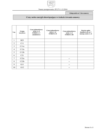 Numer postępowania: ZP.271.1.12.2016 Załącznik nr 2 do umowy Ceny netto energii obowiązujące w trakcie trwania umowy Cena jednostkowa netto w zł STREFA I / całodobowo Cena jednostkowa netto w zł STREFA II L.p. Grupa taryfowa Cena jednostkowa netto w zł STREFA III 1 B23 2 C11 3 C11o 4 C12a 5 C12b 6 C21 7 C22a -- 8 C22b -- 9 G11 -- 10 G12 -- Stawka opłat handlowych za 1 miesiąc netto w zł Strona 1 z 1