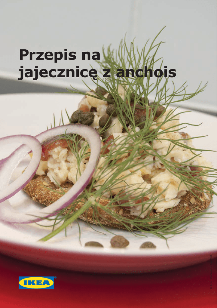 © Inter IKEA Systems B.V. 2009 Przepis na jajecznicę z anchois 30 minut Dla 4 osób Przepis na jajecznicę z anchois Jajecznicę można podawać na wiele sposobów, w zależności od użytych składników. Szprotki w stylu anchois nadają zwyczajnej, ale zawsze smacznej potrawie wyjątkowy aromat! Składniki (porcja dla 4 osób): 8 jajek 5 cl śmietanki 2 łyżeczki masła 100 g (65 g) SKARPSILL (marynowane filety ze szprotek) Szczypiorek Sposób przygotowania: Rozbij jajka do miski i wymieszaj delikatnie trzepaczką. Roztop masło na małym ogniu, najlepiej w rondelku z grubym dnem. Wlej mieszaninę jaj do rondelka i wymieszaj delikatnie drewnianą chochelką, aż do uzyskania kremowej konsystencji. Pokrój filety ze szprotek na kawałki. Dodaj połowę filetów i śmietankę do jajek. Jeśli chcesz uzyskać bardziej wyrazisty smak, dodaj resztę szprotek. Udekoruj szczypiorkiem i podawaj na przykład z ziemniakami i chrupkim pieczywem. Wskazówka: Zamiast dodawać anchois, możesz poeksperymentować z szynką, boczkiem, różnymi ziołami lub serem i stworzyć swój ulubiony przepis na jajecznicę!or cheese to find your personal scrambled egg favourite! SKARPSILL marynowane filety ze szprotek, 100 g KNÄCKEBRÖD FLERKORN pieczywo chrupkie, wieloziarniste, 250 g