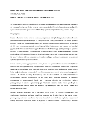 OPINIA O PROJEKCIE PODSTAWY PROGRAMOWEJ DO JĘZYKA POLSKIEGO OPRACOWANA PRZEZ KOMISJĘ EDUKACJI PRZY KOMITECIE NAUK O LITERATURZE PAN 30 listopada 2016 Ministerstwo Edukacji Narodowej opublikowało projekty podstaw programowych do poszczególnych przedmiotów w nowej zreformowanej ośmioletniej szkole podstawowej. Zgodnie z prawem do wyrażenia opinii w ramach konsultacji społecznych przedstawiamy poniższe uwagi. Uwagi ogólne: Projekt dokumentu trudno uznać za podstawę programową, której funkcją powinno być regulowanie procesu kształcenia polonistycznego w nowej strukturze szkoły podstawowej i w całym systemie edukacji. Projekt ten nie spełnia elementarnych wymagań merytoryczno-dydaktycznych, jakie stawia się dziś przed nowoczesną edukacją humanistyczną, której fundamentem jest i zawsze powinien być język ojczysty. Wobec dotychczasowej praktyki dokument obniża rangę języka polskiego w systemie edukacji, o czym świadczą: 1/ zmniejszona liczba godzin nauczania języka polskiego na ostatnim etapie edukacji; 2/ niezhierarchizowane, niespójne i niekompletne cele kształcenia i wychowania oraz 3/ anachroniczne, dobrane przypadkowo i nieodpowiadające naukowym podstawom nowoczesnej dydaktyki polonistycznej treści kształcenia. Z treści projektu podstawy programowej wynika, że jest ona oparta na braku zaufania do ludzi, którzy bezpośrednio pracują z młodzieżą. Zaproponowana podstawa programowa w istocie jest programem zawierającym szczegółowe treści nauczania. Nauczyciel nie tylko został pozbawiony prawa wyboru lektur (co jest najbardziej widoczne), ale również prawa dostosowywania toku nauczania do potrzeb uczniów i do własnej koncepcji dydaktycznej. Treść nauczania została bez reszty dookreślona w szczegółowych zapisach odnoszących się do każdej klasy. Powstaje wrażenie, iż podstawa programowa w proponowanej formie jest napisana głównie dla dyrektorów, nadzoru pedagogicznego i systemu egzaminacyjnego. Większość zapisów można łatwo przełożyć na nieskomplikowane zadania. Jednak nie pojawiają się informacje o tym, jaki kształt będzie miał egzamin po ósmej klasie. Niepokoi również wyłaniający się z dokumentu obraz ucznia. To odtwórca przekazanych mu wiadomości. Kształcenie językowe zasadniczo ogranicza się do abstrakcyjnej dla ucznia wiedzy gramatycznej, natomiast kształcenie literackie nie zakłada samodzielności myślenia, przyjemności lektury, aktywności czytelniczej, opiera się wyłącznie na przymusie. Wiele z proponowanych lektur to 1 pozycje dziś już zdecydowanie przestarzałe i anachroniczne. Nie ma utworów z nowoczesnej literatury dla dzieci i młodzieży, w której podejmowane są bardzo istotne dla młodych ludzi problemy. Sprzeciw budzi zarówno brak utworów z klasyki światowej, jak i rozkład materiału niezgodny z wiedzą o psychologii rozwojowej dziecka. Podstawa programowa w proponowanej wersji ignoruje zalecenia Parlamentu Europejskiego z 2006 roku w sprawie kompetencji kluczowych. Kompetencje kluczowe definiowane są jako „połączenie wiedzy, umiejętności i postaw odpowiednich do sytuacji. Kompetencje kluczowe to te, których wszystkie osoby potrzebują do samorealizacji i rozwoju osobistego, bycia aktywnym obywatelem, integracji społecznej i zatrudnienia.” Projekt przedstawionego dokumentu skupia się na przekazaniu wiedzy, obniża wartość aktywności (np. w komunikacji czy interpretacji). Ma charakter raczej przemocowy i dominacyjny (narzucanie wiedzy), niż emancypacyjny (pomoc w kształtowaniu kompetencji służących samodzielności posługiwania się językiem i uczestnictwa w kulturze). Podstawa programowa obejmuje tylko etap kształcenia w szkole podstawowej, nie pojawia się zatem całościowa wizji edukacji. Nie wiadomo, jak kompetencje uczniów będą rozwijane w różnych typach szkół średnich, a bez tej wiedzy trudno odpowiedzialnie planować proces dydaktyczny. Dokument został przygotowany niestarannie, pojawiają się w nim niezręczności językowe, powtórzenia, w wielu miejscach nie ma korelacji między założeniami ogólnymi a zapisami szczegółowymi (np. mowa jest o kształceniu słuchania, a nie ma żadnego zapisu szczegółowego dotyczącego tego zagadnienia) lub między zapisami szczegółowymi (np. wymagana jest znajomość kategorii estetycznych lub gatunków, których nie można powiązać z pozycjami z listy lektur). Niestaranność ta jest wyrazem braku szacunku dla odbiorców dokumentu, czyli nauczycieli. Projekt został opracowany przez anonimowy zespół. Nie zaproszono do konsultacji ekspertów ze środowisk uniwersyteckich, co ujawnia się choćby w doborze lektur (nieznajomość współczesnej literatury dla dzieci i młodzieży) czy projekcie kształcenia językowego, bardzo odległego od współczesnego językoznawstwa. Uwagi szczegółowe: I. Założenia podstawy programowej 1. Treść zaproponowanej podstawy programowej nie odpowiada wstępnemu, wyrażonemu w preambule założeniu: zamiast sprawności posługiwania się językiem zakłada przekaz rozbudowanej wiedzy, zamiast wprowadzania w świat atrakcyjnej kultury – obowiązek czytania lektur mało interesujących dla ucznia, niejednokrotnie trudnych pod względem 2 językowym lub w zakresie wyrażanych treści: w klasach IV - VI dominuje wprawdzie literatura młodzieżowa, ale niemal wyłącznie klasyczna, sprzed dziesięcioleci, odległa od doświadczeń młodych ludzi i ich potrzeb estetycznych, od IV klasy wprowadzana jest jednak klasyczna literatura dla dorosłych, czego najdobitniejszym przykładem są fragmenty Pana Tadeusza. W VII i VIII klasie mamy wyłącznie literaturę dla dorosłego czytelnika. 2. Podstawa programowa w zaproponowanym kształcie nie spełnia wymagań nowoczesnej wiedzy dydaktycznej, metodycznej, pedagogicznej i psychologicznej. Zaprojektowany jest w niej wizerunek ucznia biernego, przyswajającego gotową wiedzę, czytającego wyłącznie pozycje lite
