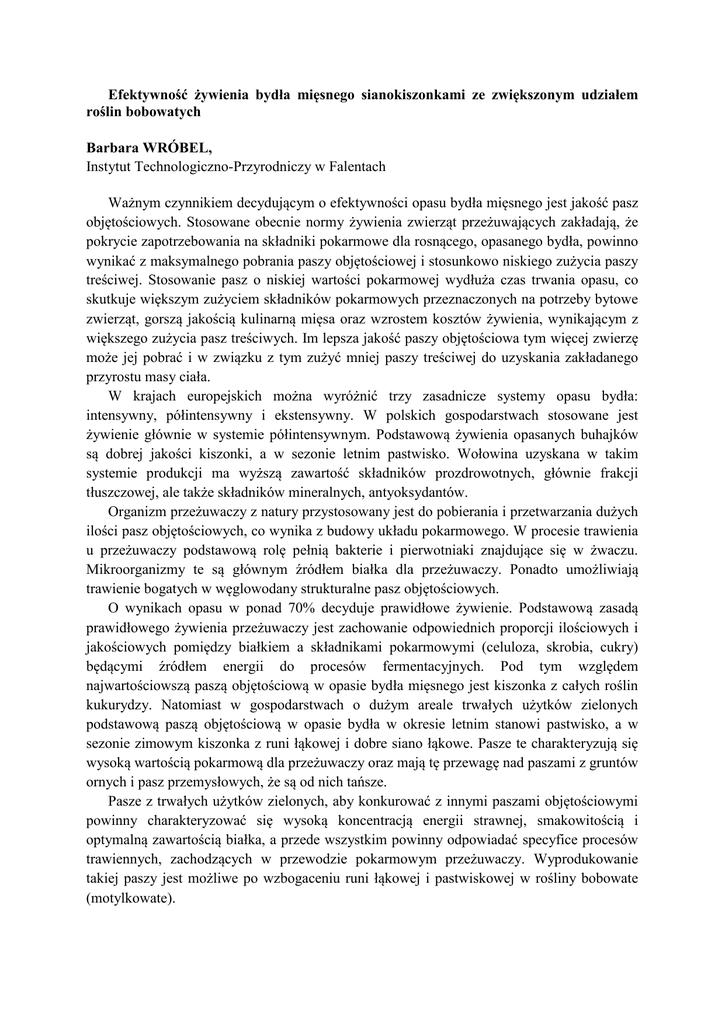 Efektywność żywienia bydła mięsnego sianokiszonkami ze zwiększonym udziałem roślin bobowatych Barbara WRÓBEL, Instytut Technologiczno-Przyrodniczy w Falentach Ważnym czynnikiem decydującym o efektywności opasu bydła mięsnego jest jakość pasz objętościowych. Stosowane obecnie normy żywienia zwierząt przeżuwających zakładają, że pokrycie zapotrzebowania na składniki pokarmowe dla rosnącego, opasanego bydła, powinno wynikać z maksymalnego pobrania paszy objętościowej i stosunkowo niskiego zużycia paszy treściwej. Stosowanie pasz o niskiej wartości pokarmowej wydłuża czas trwania opasu, co skutkuje większym zużyciem składników pokarmowych przeznaczonych na potrzeby bytowe zwierząt, gorszą jakością kulinarną mięsa oraz wzrostem kosztów żywienia, wynikającym z większego zużycia pasz treściwych. Im lepsza jakość paszy objętościowa tym więcej zwierzę może jej pobrać i w związku z tym zużyć mniej paszy treściwej do uzyskania zakładanego przyrostu masy ciała. W krajach europejskich można wyróżnić trzy zasadnicze systemy opasu bydła: intensywny, półintensywny i ekstensywny. W polskich gospodarstwach stosowane jest żywienie głównie w systemie półintensywnym. Podstawową żywienia opasanych buhajków są dobrej jakości kiszonki, a w sezonie letnim pastwisko. Wołowina uzyskana w takim systemie produkcji ma wyższą zawartość składników prozdrowotnych, głównie frakcji tłuszczowej, ale także składników mineralnych, antyoksydantów. Organizm przeżuwaczy z natury przystosowany jest do pobierania i przetwarzania dużych ilości pasz objętościowych, co wynika z budowy układu pokarmowego. W procesie trawienia u przeżuwaczy podstawową rolę pełnią bakterie i pierwotniaki znajdujące się w żwaczu. Mikroorganizmy te są głównym źródłem białka dla przeżuwaczy. Ponadto umożliwiają trawienie bogatych w węglowodany strukturalne pasz objętościowych. O wynikach opasu w ponad 70% decyduje prawidłowe żywienie. Podstawową zasadą prawidłowego żywienia przeżuwaczy jest zachowanie odpowiednich proporcji ilościowych i jakościowych pomiędzy białkiem a składnikami pokarmowymi (celuloza, skrobia, cukry) będącymi źródłem energii do procesów fermentacyjnych. Pod tym względem najwartościowszą paszą objętościową w opasie bydła mięsnego jest kiszonka z całych roślin kukurydzy. Natomiast w gospodarstwach o dużym areale trwałych użytków zielonych podstawową paszą objętościową w opasie bydła w okresie letnim stanowi pastwisko, a w sezonie zimowym kiszonka z runi łąkowej i dobre siano łąkowe. Pasze te charakteryzują się wysoką wartością pokarmową dla przeżuwaczy oraz mają tę przewagę nad paszami z gruntów ornych i pasz przemysłowych, że są od nich tańsze. Pasze z trwałych użytków zielonych, aby konkurować z innymi paszami objętościowymi powinny charakteryzować się wysoką koncentracją energii strawnej, smakowitością i optymalną zawartością białka, a przede wszystkim powinny odpowiadać specyfice procesów trawiennych, zachodzących w przewodzie pokarmowym przeżuwaczy. Wyprodukowanie takiej paszy jest możliwe po wzbogaceniu runi łąkowej i pastwiskowej w rośliny bobowate (motylkowate). 350 80 300 70 250 60 50 200 40 150 30 100 20 50 0 strawność [%] zawartość [g/kg sm.] Do roślin bobowatych o dużym znaczeniu gospodarczym na trwałych użytkach zielonych można zaliczyć: koniczynę łąkową, koniczynę białą, koniczynę białoróżową i komonicę zwyczajną. Na łąkach, czyli użytkach kośnych, największe znaczenie odgrywa koniczyna łąkowa (Trifolium pratense L), a zwłaszcza jej odmiany tetraploidalne, które są bardziej trwałe niż odmiany diploidalne. Innym wartościowym gatunkiem, który budzi coraz większe zainteresowanie jest komonica zwyczajna (Lotus corniculatus L.). Gatunek ten może występować w warunkach ekstremalnych, gdzie inne gatunki zawodzą. Ponadto komonica zwyczajna zawiera skondensowane taniny, które spowalniają proces rozkładu białka w żwaczu i tym samym zwiększają jego trawienie w jelicie cienkim. Obecności tanin przypisuje się również ograniczenie wydzielania do atmosfery metanu przez żywione nią zwierzęta. Opas bydła mięsnego często jest prowadzony w oparciu o żywienie pastwiskowe. Gatunkiem szczególnie predestynowanym do użytkowania pastwiskowego jest koniczyna biała (Trifolium repens L.). Roślina ta, w porównaniu z innymi gatunkami roślin bobowatych, wyróżnia się wysoką zawartością białka oraz mniejszą włókna. Zawiera znaczne ilości makro- i mikroelementów. Cechuje ją także duża smakowitość, dzięki czemu jest chętnie pobierana przez zwierzęta. W trwałych zbiorowiskach łąkowych udział roślin motylkowatych jest zazwyczaj bardzo niewielki. Ze względu na liczne korzyści związane z obecnością tej grupy roślin w runi łąkowej i pastwiskowej zaleca się regularne (co 3-4 lata) zwiększanie jej udziału. Stosunkowo tanią i efektywną metodą poprawy stanu runi jest podsiew, polegający na wprowadzeniu do runi mieszanek nasion składających się z wartościowych gatunków i odmian traw oraz roślin bobowatych dostosowanych do warunków siedliskowych i sposobu użytkowania. Korzyści wynikające ze zwiększenie udziału w runi roślin bobowatych to wyższe i stabilniejsze plonowanie, większa koncentracja energii oraz korzystny zrównoważony stosunek energetyczno-białkowy. 10 0% 15% 30% 45% 60% 100% 0 Udział koniczyny łąkowej w runi Białko ogólne Włókno surowe Strawność masy organicznej Rys. 1. Wpływ udziału koniczyny łąkowej w runi łąkowej na strawność i zawartość składników pokarmowych w paszy Najlepsze efekty uzyskuje się przy 50% udziale roślin bobowatych w runi. Ze względu na wpływ różnych czynników klimatycznych i glebowych trudno jest osiągnąć taki zrównoważony udział, dlatego uważa się, że udział bobowatych w run