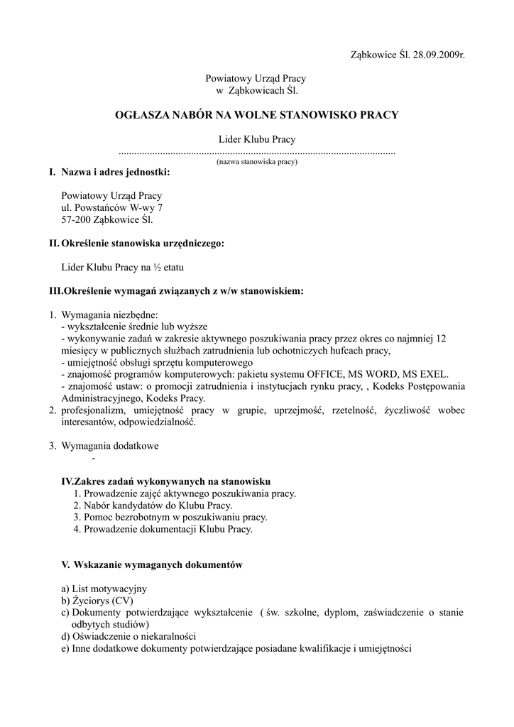 Ząbkowice Śl. 28.09.2009r. Powiatowy Urząd Pracy w Ząbkowicach Śl. OGŁASZA NABÓR NA WOLNE STANOWISKO PRACY Lider Klubu Pracy ........................................................................................................... (nazwa stanowiska pracy) I. Nazwa i adres jednostki: Powiatowy Urząd Pracy ul. Powstańców W-wy 7 57-200 Ząbkowice Śl. II. Określenie stanowiska urzędniczego: Lider Klubu Pracy na ½ etatu III.Określenie wymagań związanych z w/w stanowiskiem: 1. Wymagania niezbędne: - wykształcenie średnie lub wyższe - wykonywanie zadań w zakresie aktywnego poszukiwania pracy przez okres co najmniej 12 miesięcy w publicznych służbach zatrudnienia lub ochotniczych hufcach pracy, - umiejętność obsługi sprzętu komputerowego - znajomość programów komputerowych: pakietu systemu OFFICE, MS WORD, MS EXEL. - znajomość ustaw: o promocji zatrudnienia i instytucjach rynku pracy, , Kodeks Postępowania Administracyjnego, Kodeks Pracy. 2. profesjonalizm, umiejętność pracy w grupie, uprzejmość, rzetelność, życzliwość wobec interesantów, odpowiedzialność. 3. Wymagania dodatkowe IV.Zakres zadań wykonywanych na stanowisku 1. Prowadzenie zajęć aktywnego poszukiwania pracy. 2. Nabór kandydatów do Klubu Pracy. 3. Pomoc bezrobotnym w poszukiwaniu pracy. 4. Prowadzenie dokumentacji Klubu Pracy. V. Wskazanie wymaganych dokumentów a) List motywacyjny b) Życiorys (CV) c) Dokumenty potwierdzające wykształcenie ( św. szkolne, dyplom, zaświadczenie o stanie odbytych studiów) d) Oświadczenie o niekaralności e) Inne dodatkowe dokumenty potwierdzające posiadane kwalifikacje i umiejętności VI.Termin i miejsce składania dokumentów Wymagane dokumenty aplikacyjne należy składać w zamkniętych kopertach z dopiskiem (Nabór na stanowisko Lider Klubu Pracy) w terminie do dnia 12 października 2009r. do godz. 15.30 – w siedzibie Powiatowego Urzędu Pracy w Ząbkowicach Śl.(kancelaria ogólna- pok. Nr 10) – listownie (pocztą) na adres urzędu Aplikacje, które wpłyną do urzędu po wyżej określonym terminie nie będą rozpatrywane. Po upływie terminu do złożenia dokumentów zostanie umieszczona na stronie internetowej BIP http://pup.zabkowice.slaskie.sisco.info lista kandydatów, którzy spełniają wymagania formalne. Informacja o wyniku naboru zostanie umieszczona na stronie internetowej BIP http://pup.zabkowice.slaskie.sisco.info oraz na tablicy ogłoszeń Powiatowego Urzędu Pracy w Ząbkowicach Śl. i Filii PUP w Ziębicach Śl. w terminie 14 dni od dnia zatrudnienia wybranego kandydata. UWAGA: Wymagane dokumenty aplikacyjne(list motywacyjny, Życiorys), powinny być opatrzone klauzulą: Wyrażam zgodę na przetwarzanie moich danych osobowych zawartych w ofercie pracy dla potrzeb niezbędnych do przeprowadzenia procesu rekrutacji zgodnie z ustawą z dnia 29 sierpnia 1977r. O ochronie danych osobowych (Dz. U. Z 2002r. Nr 101, poz. 926 z późn. zm.)