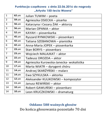Artysta 150-lecia - wyniki cząstkowe na dzień 22 czerwca 2016 r.