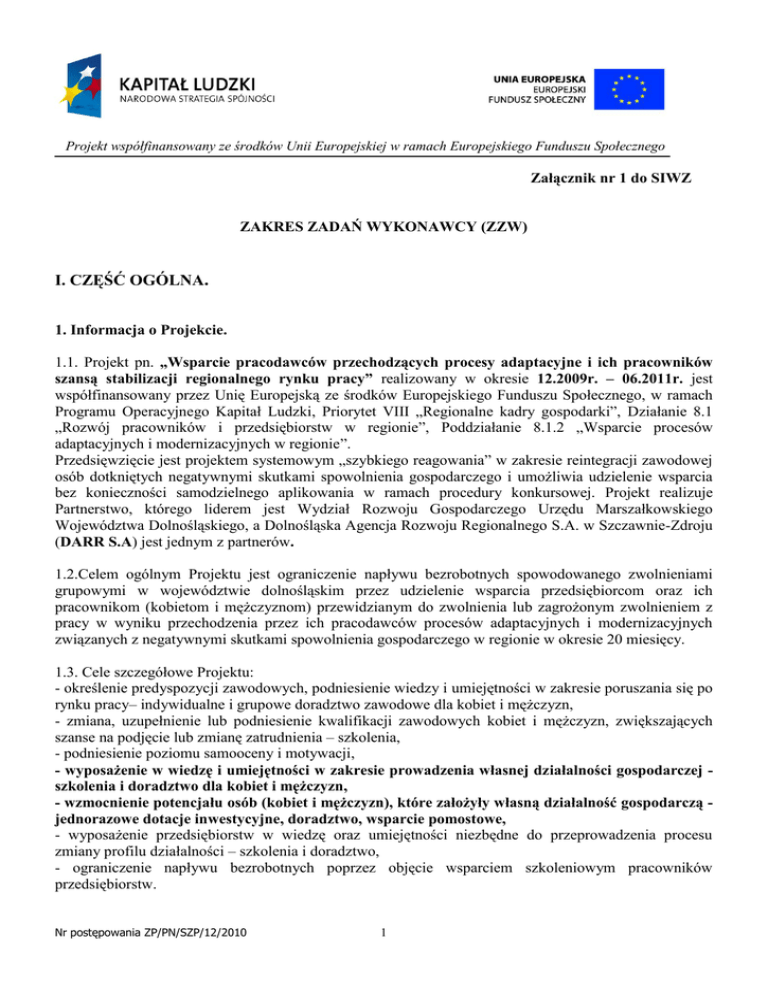 Projekt współfinansowany ze środków Unii Europejskiej w ramach Europejskiego Funduszu Społecznego Załącznik nr 1 do SIWZ ZAKRES ZADAŃ WYKONAWCY (ZZW) I. CZĘŚĆ OGÓLNA. 1. Informacja o Projekcie. 1.1. Projekt pn. „Wsparcie pracodawców przechodzących procesy adaptacyjne i ich pracowników szansą stabilizacji regionalnego rynku pracy” realizowany w okresie 12.2009r. – 06.2011r. jest współfinansowany przez Unię Europejską ze środków Europejskiego Funduszu Społecznego, w ramach Programu Operacyjnego Kapitał Ludzki, Priorytet VIII „Regionalne kadry gospodarki”, Działanie 8.1 „Rozwój pracowników i przedsiębiorstw w regionie”, Poddziałanie 8.1.2 „Wsparcie procesów adaptacyjnych i modernizacyjnych w regionie”. Przedsięwzięcie jest projektem systemowym „szybkiego reagowania” w zakresie reintegracji zawodowej osób dotkniętych negatywnymi skutkami spowolnienia gospodarczego i umożliwia udzielenie wsparcia bez konieczności samodzielnego aplikowania w ramach procedury konkursowej. Projekt realizuje Partnerstwo, którego liderem jest Wydział Rozwoju Gospodarczego Urzędu Marszałkowskiego Województwa Dolnośląskiego, a Dolnośląska Agencja Rozwoju Regionalnego S.A. w Szczawnie-Zdroju (DARR S.A) jest jednym z partnerów. 1.2.Celem ogólnym Projektu jest ograniczenie napływu bezrobotnych spowodowanego zwolnieniami grupowymi w województwie dolnośląskim przez udzielenie wsparcia przedsiębiorcom oraz ich pracownikom (kobietom i mężczyznom) przewidzianym do zwolnienia lub zagrożonym zwolnieniem z pracy w wyniku przechodzenia przez ich pracodawców procesów adaptacyjnych i modernizacyjnych związanych z negatywnymi skutkami spowolnienia gospodarczego w regionie w okresie 20 miesięcy. 1.3. Cele szczegółowe Projektu: - określenie predyspozycji zawodowych, podniesienie wiedzy i umiejętności w zakresie poruszania się po rynku pracy– indywidualne i grupowe doradztwo zawodowe dla kobiet i mężczyzn, - zmiana, uzupełnienie lub podniesienie kwalifikacji zawodowych kobiet i mężczyzn, zwiększających szanse na podjęcie lub zmianę zatrudnienia – szkolenia, - podniesienie poziomu samooceny i motywacji, - wyposażenie w wiedzę i umiejętności w zakresie prowadzenia własnej działalności gospodarczej szkolenia i doradztwo dla kobiet i mężczyzn, - wzmocnienie potencjału osób (kobiet i mężczyzn), które założyły własną działalność gospodarczą jednorazowe dotacje inwestycyjne, doradztwo, wsparcie pomostowe, - wyposażenie przedsiębiorstw w wiedzę oraz umiejętności niezbędne do przeprowadzenia procesu zmiany profilu działalności – szkolenia i doradztwo, - ograniczenie napływu bezrobotnych poprzez objęcie wsparciem szkoleniowym pracowników przedsiębiorstw. Nr postępowania ZP/PN/SZP/12/2010 1 1.4. Projekt skierowany jest do: a) pracowników (kobiet i mężczyzn) przewidzianych do zwolnienia lub zagrożonych utratą zatrudnienia, z przyczyn niedotyczących pracowników, zatrudnionych w przedsiębiorstwach wymienionych w lit. b, których miejsce pracy jest zlokalizowane w województwie dolnośląskim, b) przedsiębiorstw przechodzących procesy adaptacyjne i modernizacyjne, które prowadzą działalność gospodarczą na terenie województwa dolnośląskiego i zgłosili do PUP zamiar przeprowadzenia zwolnień grupowych. 1.5 Wsparcie realizowane w ramach Projektu. Typ.1 Wsparcie dla pracowników w ramach outplacementu, w postaci: - poradnictwa zawodowego, - poradnictwa psychologicznego, - jednorazowego dodatku relokacyjnego (mobilnościowego), - jednorazowego dodatku motywacyjnego, - szkoleń zawodowych, - programów kompleksowego wsparcia, - szkoleń z zakresu zakładania i prowadzenia działalności gospodarczej, - doradztwa indywidualnego związanego z zakładaniem działalności gospodarczej, - doradztwa w zakresie efektywnego wykorzystania dotacji i prowadzenia działalności gospodarczej, - dotacji na uruchomienie działalności gospodarczej, - podstawowego wsparcia pomostowego, - wydłużonego wsparcia pomostowego. Typ. 2 Wsparcie dla pracowników delegowanych przez pracodawcę, w postaci: - szkoleń przekwalifikowujących, - doradztwa w zakresie wyboru nowego zawodu i poszukiwania zatrudnienia (spotkania indywidualne i grupowe). Typ. 3 Wsparcie dla pracodawców (wsparcie skierowane bezpośrednio do przedsiębiorców), w postaci: - szkolenia wspomagające proces zmiany profilu działalności przedsiębiorstwa, - doradztwo wspomagające proces zmiany profilu działalności przedsiębiorstwa. 2. Przedmiot zamówienia i zakres usługi. 2.1. Przedmiotem zamówienia jest realizacja usługi polegającej na udzieleniu kompleksowego wsparcia szkoleniowo-doradczego z zakresu zakładania i prowadzenia działalności gospodarczej oraz efektywnego wykorzystania dotacji w ramach projektu pn. „Wsparcie pracodawców przechodzących procesy adaptacyjne i ich pracowników szansą stabilizacji regionalnego rynku pracy”. Szkolenia i doradztwo z zakresu zakładania i prowadzenia działalności gospodarczej oraz efektywnego wykorzystania dotacji udzielane będzie w ramach Typu wsparcia 1 pn. Wsparcie dla pracowników w ramach outplacementu, w części przypadającej na Dolnośląską Agencję Rozwoju Regionalnego S.A. w Szczawnie-Zdroju. 2.2. Okres realizacji przedmiotu zamówienia ustala się następująco: - data rozpoczęcia: dzień podpisania umowy, - data zakończenia realizacji szkoleń i doradztwa: 31 grudnia 2010r., - data zakończenia realizacji usługi: 31 stycznia 2011 r. Nr postępowania ZP/PN/SZP/12/2010 2 2.3. Usługa obejmuje realizację następujących zadań: - zorganizowanie i przeprowadzenie szkoleń (pakietów szkoleniowych) z zakresu zakładania i prowadzenia działalności gospodarczej, - zorganizowanie i przeprowadzenie indywidualnego doradztwa związanego z zakładaniem działalności gospodarczej, - zorganizowanie i przeprowadzenie indywidualnego doradztwa w zakresie efektywnego wykorzystania dotacj