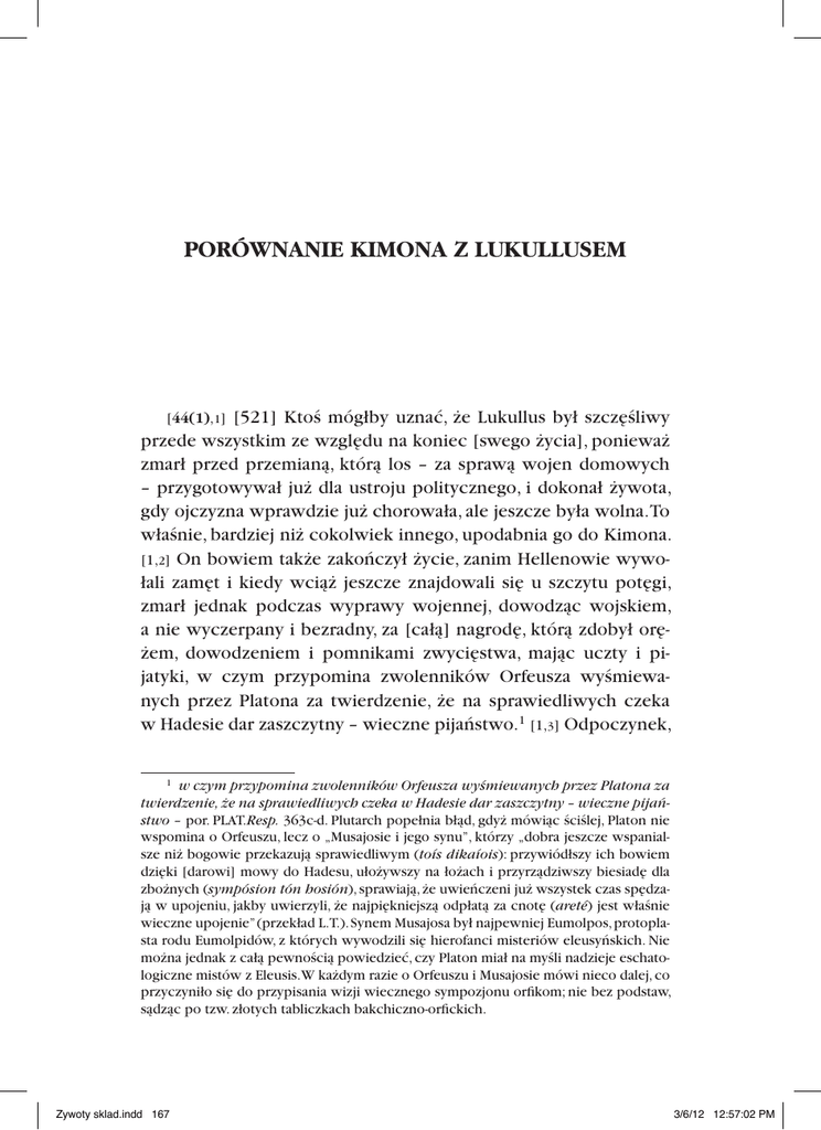 PORÓWNANIE KIMONA Z LUKULLUSEM [44(1),1] [521] Ktoś mógłby uznać, że Lukullus był szczęśliwy przede wszystkim ze względu na koniec [swego życia], ponieważ zmarł przed przemianą, którą los – za sprawą wojen domowych – przygotowywał już dla ustroju politycznego, i dokonał żywota, gdy ojczyzna wprawdzie już chorowała, ale jeszcze była wolna. To właśnie, bardziej niż cokolwiek innego, upodabnia go do Kimona. [1,2] On bowiem także zakończył życie, zanim Hellenowie wywołali zamęt i kiedy wciąż jeszcze znajdowali się u szczytu potęgi, zmarł jednak podczas wyprawy wojennej, dowodząc wojskiem, a nie wyczerpany i bezradny, za [całą] nagrodę, którą zdobył orężem, dowodzeniem i pomnikami zwycięstwa, mając uczty i pijatyki, w czym przypomina zwolenników Orfeusza wyśmiewanych przez Platona za twierdzenie, że na sprawiedliwych czeka w Hadesie dar zaszczytny – wieczne pijaństwo.1 [1,3] Odpoczynek, 1 w czym przypomina zwolenników Orfeusza wyśmiewanych przez Platona za twierdzenie, że na sprawiedliwych czeka w Hadesie dar zaszczytny – wieczne pijaństwo – por. Plat.Resp. 363c-d. Plutarch popełnia błąd, gdyż mówiąc ściślej, Platon nie wspomina o Orfeuszu, lecz o „Musajosie i jego synu”, którzy „dobra jeszcze wspanialsze niż bogowie przekazują sprawiedliwym (toís dikaíois): przywiódłszy ich bowiem dzięki [darowi] mowy do Hadesu, ułożywszy na łożach i przyrządziwszy biesiadę dla zbożnych (sympósion tón hosión), sprawiają, że uwieńczeni już wszystek czas spędzają w upojeniu, jakby uwierzyli, że najpiękniejszą odpłatą za cnotę (areté) jest właśnie wieczne upojenie” (przekład L.T.). Synem Musajosa był najpewniej Eumolpos, protoplasta rodu Eumolpidów, z których wywodzili się hierofanci misteriów eleusyńskich. Nie można jednak z całą pewnością powiedzieć, czy Platon miał na myśli nadzieje eschatologiczne mistów z Eleusis.W każdym razie o Orfeuszu i Musajosie mówi nieco dalej, co przyczyniło się do przypisania wizji wiecznego sympozjonu orfikom; nie bez podstaw, sądząc po tzw. złotych tabliczkach bakchiczno-orfickich. Zywoty sklad.indd 167 3/6/12 12:57:02 PM 168 Plutarch • Żywoty równoległe spokój i spędzanie czasu na rozmowach o przyjemności i nauce są najstosowniejszym pocieszeniem dla starego człowieka, który zaprzestał działań wojennych i politycznych. Lecz zwrócenie się ku przyjemności jako zwieńczeniu pięknych czynów oraz spędzanie reszty życia na przyjemnych igraszkach podczas świętowania Afrodyzjów, choć wcześniej prowadziło się wojny i sprawowało dowództwo, nie przystoi zwolennikowi szlachetnej Akademii lub Ksenokratesa, lecz komuś, kto skłania się ku [naukom] Epikura.2 [1,4] Zdumiewa i to, że młodość [Kimona] zdaje się naganna i nieposkromiona, [Lukullusa] natomiast wzorcowa i roztropna. Jednak lepszy jest ten, kto zmienia się na lepsze, ponieważ zdrowsza bywa ta natura, której wady na starość słabną, a cnota wzrasta. [1,5] Chociaż byli jednakowo bogaci, niejednakowo korzystali z bogactwa, nie godzi się bowiem porównywać południowego muru Akropolu, który ukończono dzięki pieniądzom dostarczonym przez Kimona, z sypialniami i otoczonymi przez morze tarasami widokowymi w Neapolu, jakie wzniósł Lukullus dzięki barbarzyńskim łupom; ani zestawiać stołu Kimona z Lukullusowym, bo pierwszy [można by określić] jako „demokratyczny” i przyjazny dla ludzi, a drugi – kosztowny i godny satrapy. [1,6] Tamten małym kosztem żywił codziennie wielu, ten był zastawiony dla owych nielicznych, którzy żyją w zbytku, wydając ogromne sumy. [1,7] Lecz, na Zeusa, być może to czas przyczynił się do powstania tej różnicy. Trudno wszak powiedzieć, czy gdyby Kimon pod koniec [swojej] działalności i wojowania wkroczył w starość upływającą z dala od wojen i życia politycznego, nie korzystałby jeszcze chętniej z życia wystawnego i otwartego na przyjemności. W istocie przejawiał skłonności do picia i pohulanek, 2 na świątecznych zabawach podczas Afrodyzjów – tj. świąt ku czci Afrodyty; por. XENOPHON.Hist.Graec. 5,4,4. • Ksenokratesa – Ksenokrates z Chalcedonu (396/5-315/4) był uczniem Platona i scholarchą (rektorem) Akademii od 339 do 314 r.; por.Apollod. FGrHist 244 F 345. Plutarch wspomina go kilkakrotnie także w żywocie Focjona z uwagi na zaangażowanie w sprawy polityczne.W roku 322 Ksenokratesa wysłano do Antypatra z misją wynegocjowania uwolnienia jeńców ateńskich pojmanych w czasie wojny lamijskiej; por. PLUT.Phoc. 27,1-6. W Atenach miał status metojka, lecz nie przyjął ofiarowanego mu obywatelstwa; por. tamże 29,6. Ponieważ nie mógł zapłacić podatku (Diog.LAERT. 4,14), uwięziono go (Plut.Tit.Flam. 12,7) lub sprzedano w niewolę (Diog.Laert. 4,14).Wkrótce po tym, jak kupił go Demetrios z Faleronu, został wyzwolony przez niego lub przez mówcę i polityka, Likurga; por. PLUT.Phoc. 12,7. Zywoty sklad.indd 168 3/6/12 12:57:02 PM Porównanie Kimona z Lukullusem [1,3–2,5] 169 a także ganiono go – jak już wspomnieliśmy3 – za słabość do kobiet. [1,8] Sukcesy w działaniu i zmaganiach, które dostarczają innego rodzaju przyjemności, uwalniają ludzi z natury lubiących politykę i ambitnych od pragnień niższego rzędu, odwracając od nich uwagę. Gdyby zatem również Lukullus zmarł, walcząc i dowodząc wojskiem, nawet osoba najbardziej skłonna do stawiania zarzutów nie znalazłaby powodów do oskarżania go.Tyle o trybie życia. [45(2),1] To, że podczas zmagań wojennych obydwaj byli dobrymi zawodnikami na morzu i na lądzie, nie ulega wątpliwości. Jak zapaśnicy, których jednego dnia uwieńczono za zwycięstwo w boksie i w pankrationie, tradycyjnie noszą miano „cudownie zwycięskich”,4 tak i Kimon, który tego samego dnia uwieńczył Helladę, wystawiając pomnik zwycięstwa po bitwie lądowej i bitwie morskiej, jak najsłuszniej ma prawo do 