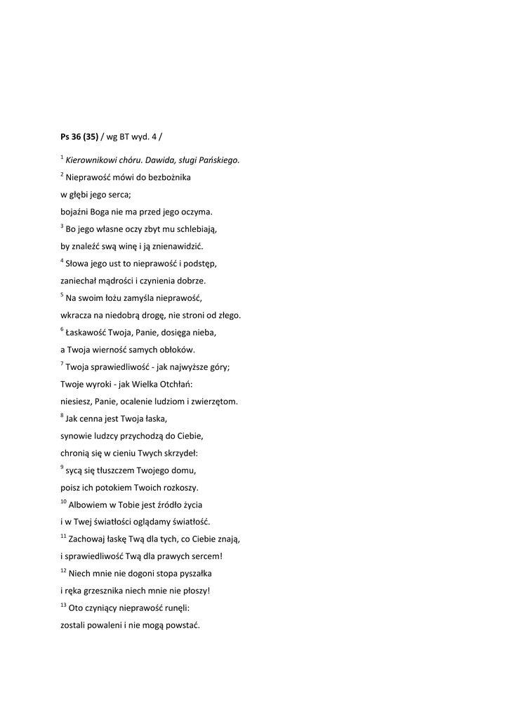 Ps 36 (35) / wg BT wyd. 4 / 1 Kierownikowi chóru. Dawida, sługi Pańskiego. 2 Nieprawość mówi do bezbożnika w głębi jego serca; bojaźni Boga nie ma przed jego oczyma. 3 Bo jego własne oczy zbyt mu schlebiają, by znaleźć swą winę i ją znienawidzić. 4 Słowa jego ust to nieprawość i podstęp, zaniechał mądrości i czynienia dobrze. 5 Na swoim łożu zamyśla nieprawość, wkracza na niedobrą drogę, nie stroni od złego. 6 Łaskawość Twoja, Panie, dosięga nieba, a Twoja wierność samych obłoków. 7 Twoja sprawiedliwość - jak najwyższe góry; Twoje wyroki - jak Wielka Otchłań: niesiesz, Panie, ocalenie ludziom i zwierzętom. 8 Jak cenna jest Twoja łaska, synowie ludzcy przychodzą do Ciebie, chronią się w cieniu Twych skrzydeł: 9 sycą się tłuszczem Twojego domu, poisz ich potokiem Twoich rozkoszy. 10 Albowiem w Tobie jest źródło życia i w Twej światłości oglądamy światłość. 11 Zachowaj łaskę Twą dla tych, co Ciebie znają, i sprawiedliwość Twą dla prawych sercem! 12 Niech mnie nie dogoni stopa pyszałka i ręka grzesznika niech mnie nie płoszy! 13 Oto czyniący nieprawość runęli: zostali powaleni i nie mogą powstać. Nieprawość bezbożnika. Pierwsza część psalmu 36 opisuje życie bez Boga, zamknięte na Jego głos, nie uznające Jego autorytetu i mądrości, lecz dające posłuch nieprawości w sercu, w myślach, w działaniu. Tę dominację zła podkreślają też powtórzenia słowa „nieprawość” (3x). A zaślepiająca pycha nie pozwala tego zobaczyć i uznać błędu i winy. Łaskawość Pana. W drugiej części oczekiwałoby się – na zasadzie przeciwstawienia – opisu człowieka sprawiedliwego (por. Ps 1), natomiast znajdujemy tu wysławianie Pana w Jego łaskawości (hesed), pełnej dobra, życzliwości i miłosierdzia dla wszystkich ludzi, a zwłaszcza – na mocy zawartego Przymierza – wobec Izraela. Łaskawość, kilkakrotnie wymieniona w tym psalmie, łączy się z Bożą wiernością, sprawiedliwością i Jego wyrokami, które obejmują cały świat. Od nieba, wysokich gór, aż po wielką otchłań (= świat podziemny). Pan zapewnia życie wszystkich stworzeń. Udziela łaski tym, którzy uciekają się do Niego, tak jak czynił to wobec ludu Izraela, gromadzącego się w jerozolimskiej świątyni na modlitwie i składającego ofiary. Ta pochwała Boga kończy się wyznaniem: „w Tobie jest źródło życia i w Twej światłości oglądamy światłość” (w.10). Jedynie w Bogu człowiek może znaleźć życie, być uzdrowionym ze swego zaślepienia, poznać prawdę, zdobyć mądrość, osiągnąć szczęście, pokój, zbawienie. Prolog Czwartej Ewangelii wskaże tak na Jezusa: „W Nim było życie, a życie było światłością ludzi” (J 1,4). A On sam o sobie powiedział: „Ja jestem światłością świata. Kto idzie za mną, nie będzie chodził w ciemności, lecz będzie miał światło życia” (J 8,12). Ręka grzesznika niech mnie nie płoszy. Modlitwa Psalmisty potwierdza jego życiowy wybór, by kroczyć drogą sprawiedliwości. Prosi Boga o łaskę wytrwania, odwagę wobec ataków i gróźb ludzi nieprawych. Ich los jest przecież przesądzony, nieprawość zostanie pozbawiona swej siły. Panie Jezu, oświeć nasze serca i udziel nam łaski wiernego kroczenia drogą wiary. Który żyjesz i królujesz na wieki wieków. Amen. o. Michał Baranowski OFMConv
