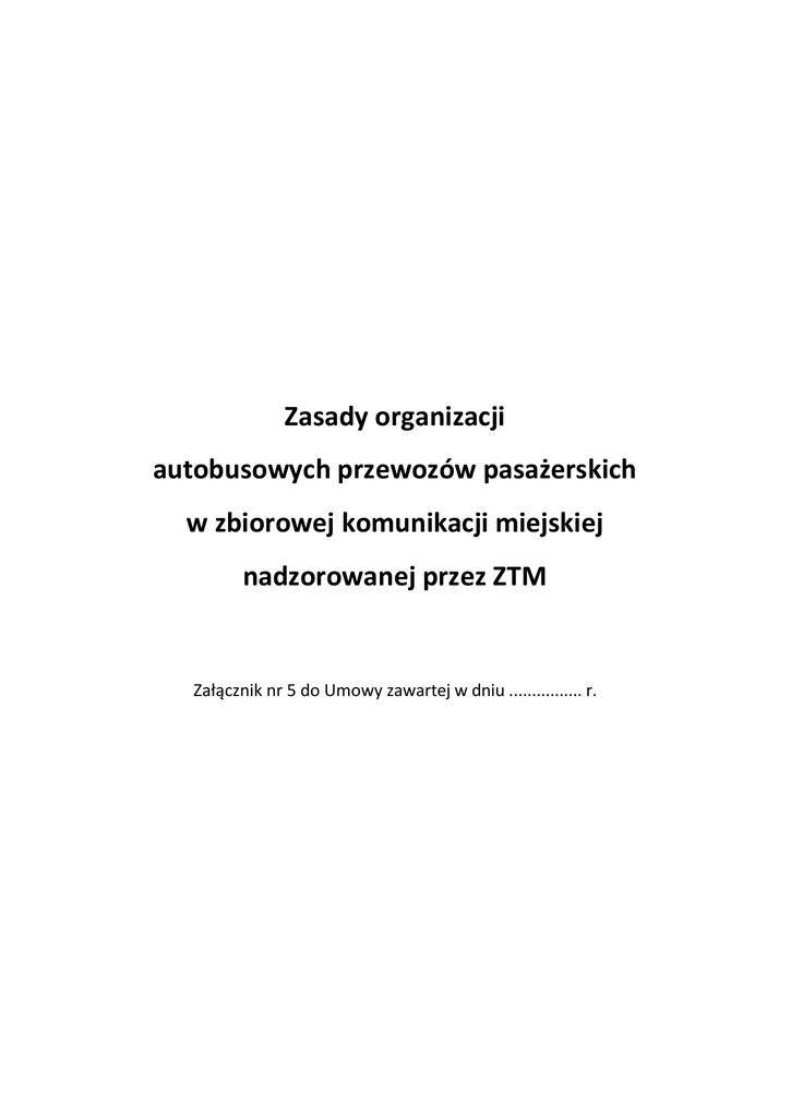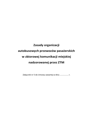 Zasady organizacji autobusowych przewozów pasażerskich w zbiorowej komunikacji miejskiej nadzorowanej przez ZTM Załącznik nr 5 do Umowy zawartej w dniu ................ r. Zasady organizacji autobusowych przewozów pasażerskich w zbiorowej komunikacji miejskiej nadzorowanej przez ZTM 1. Zasady ustalania zadań szczegółowych 1.1. Ilekroć w załączniku jest mowa o: a) „kursie” – należy przez to rozumieć przejazd autobusu pomiędzy określonym w rozkładzie jazdy krańcem linii po jej trasie do wyznaczonego punktu (np. drugi kraniec, przystanek) lub od wyznaczonego w rozkładzie jazdy punktu po trasie linii do jej krańca (np. od drugiego krańca, przystanku). Za kurs uważa się: przejazd pomiędzy krańcami linii po jej trasie, dojazd do krańca po wyznaczonej trasie na odcinku płatnym od wyznaczonego przystanku, zjazd z krańca po wyznaczonej trasie na odcinku płatnym do wyznaczonego przystanku, b) „brygadzie” – należy przez to rozumieć określone przez ZTM zadanie przewozowe powstałe z połączenia kursów. Operator może kursy brygady łączyć w inne zadania przewozowe zachowując ich cechy zgodnie z określonymi przez ZTM dla brygady (w tym numer brygady i typ taboru), c) „przejeździe technicznym” – należy przez to rozumieć nieodpłatny przejazd bez pasażerów, d) „przejeździe technicznym rozkładowym” (PTR) – należy przez to rozumieć przejazd bez pasażerów, zaliczany decyzją ZTM do wozokilometrów płatnych, e) „rezerwie czynnej” – należy przez to rozumieć kierowcę wraz z autobusem, dyżurującego w wyznaczonym miejscu i realizującego przewozy wg oddzielnych wskazań ZTM, f) „trybie sterowania bezpośredniego” (TSB) – należy przez to rozumieć odstąpienie od realizacji rozkładu jazdy obowiązującego na linii i podjęcie działań zmierzających do jak najszybszego przywrócenia możliwości jego realizacji, przy jednoczesnym dążeniu do zapewnienia jak największej liczby odjazdów z krańca zbliżonych czasowo do przewidzianych rozkładem jazdy, g) „Umowie” – należy przez to rozumieć Umowę, której integralną częścią jest niniejszy załącznik. 1.2. Rozkład jazdy linii autobusowej zawiera: a) przebieg trasy linii i jej długość mierzoną od krańca do krańca oraz, o ile występują, odcinki dojazdu i zjazdu, b) wykaz przystanków, c) liczbę brygad obsługujących jednocześnie linię i ich kolejność, d) godziny odjazdów z przystanków i przyjazdów na kraniec w poszczególnych kursach, e) rodzaj taboru określony w § 1 Umowy. 1.2.1. Dopuszcza się możliwość przejazdów trasami alternatywnymi w stosunku do wyznaczonych przez ZTM pod warunkiem utrzymania obsługi wszystkich obowiązujących na danej linii przystanków zgodnie z rozkładem jazdy (punktualny odjazd oraz nie pominięcie żadnego przystanku). 1.2.1.1. Wyboru trasy alternatywnej dokonuje kierowca w zależności od warunków drogowych. Wozokilometry liczone są według trasy wyznaczonej przez rozkład jazdy. Zamawiający zastrzega możliwość ograniczenia powyższej zasady w ramach zmian doraźnych, okresowych lub stałych. 1.2.2. W rozkładach jazdy lub trybie sterowania bezpośredniego może być stosowany przejazd techniczny rozkładowy (PTR). 1.3. Klasyfikacja zmian rozkładu jazdy: a) zmiany stałe – wynikające z bieżącej analizy potrzeb, wprowadzane na czas nieokreślony, b) zmiany okresowe – wprowadzane na czas określony, wynikające z planowanych zmian w organizacji ruchu, c) zmiany doraźne – wynikające z nagłych przyczyn losowych. 1.3.1. W ramach decyzji, o których mowa w punkcie 1.3, ZTM ustala szczegółowe zasady wykonywania przewozów, a w szczególności: a) wyznacza rozkłady jazdy linii oraz trasy objazdów i skrótów, b) decyduje o uruchomieniu komunikacji zastępczej, linii specjalnych lub cmentarnych, c) wydaje dyspozycje dotyczące zmiany przydziału autobusów do linii, d) wydaje dyspozycje dotyczące uruchomienia autobusu w ramach realizacji zadań związanych z wydarzeniem nadzwyczajnym, e) wydaje dyspozycje o uruchomieniu autobusu w celu wykonania zadań własnych ZTM, f) wydaje decyzje o zmianie czasu funkcjonowania linii lub poszczególnych brygad, g) wydaje dyspozycje w zakresie ustawiania niezbędnych posterunków pogotowia wypadkowego Operatora, h) wydaje dyspozycje w zakresie oznakowania autobusów oraz dodatkowych informacji dla pasażerów, i) wydaje dyspozycje w zakresie wykorzystania autobusów jako tzw. rezerwy czynnej. Załącznik nr 5 do Umowy zawartej w dniu ................ r. strona 2 Zasady organizacji autobusowych przewozów pasażerskich w zbiorowej komunikacji miejskiej nadzorowanej przez ZTM 1.3.2. W przypadku, gdy średnia odległość przejechana przez autobus uruchomiony do obsługi zdarzeń opisanych w punkcie 1.3.1 d), e), i) jest mniejsza niż 16 km w ciągu godziny, Operatorowi przysługuje wynagrodzenie za każdą wozogodzinę podstawionego autobusu w wysokości stanowiącej szesnastokrotność (16×) stawki określonej w Umowie za 1 wkm; w takim przypadku Operatorowi nie przysługuje wynagrodzenie obliczane za wykonane wkm. 1.3.2.1. Jeżeli dyżurujący w wyznaczonym miejscu autobus tzw. rezerwy czynnej nie zostanie uruchomiony do realizacji przewozów wg oddzielnych wskazań ZTM, Operatorowi przysługuje wynagrodzenie za każdą wozogodzinę w wysokości dziesięciokrotności (10×) stawki określona w Umowie za 1 wkm podstawionego autobusu. 1.3.3. Doraźna zmiana rozkładu jazdy trwająca krócej niż 24 godziny może zostać wprowadzona na podstawie dyspozycji Dyżurnego ZTM przekazanej Operatorowi i potwierdzonej adnotacją na sporządzonym przez ZTM dziennym wykazie zdarzeń w komunikacji autobusowej, bez konieczności wystawiania dodatkowego zlecenia zmiany doraźnej. Kwalifikacja „ZTM” oznacza decyzję o zmianie zbiorczego rozkładu jazdy. 1.3.3.1. Dzienny wykaz zdarzeń w komunikacji autobusowej ZTM przekazuje do Operatora za pośrednictwem poczty 