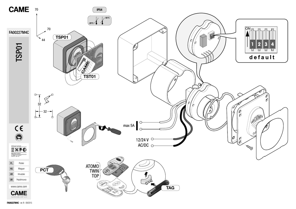 IP54 70 # # 70 FA00227M4C TSP01 TSP01 44 ME CA TST01 32 32 PL Polski HU Magyar HR Hrvatski UK Українська PCT ATOMO TWIN TOP E M A C www.came.com FA00227M4C - ver. 1 - 09/2015 TAG POLSKI Opis Czytnik urządzeń z transponderem (karty TST01, breloki PCT lub owalne transpondery TAG instalowane w pilotach CAME), zasilany napięciem 12 lub 24 V AC/DC. Aktywuje styk z możliwością wyboru funkcjonowania w trybie monostabilnym lub bistabilnym. Maksymalna pojemność TSP01 to 250 pozycji w pamięci (urządzenia). W stykach przekaźników nie jest dozwolone sterowanie urządzeniami zasilanymi napięciem 230 V. Połączenia Połączyć przewody czerwony (+) i czarny (-) zasilania oraz przewody białe styków przekaźnikowych (NO, 5 A maks). Funkcje przełączników DIP DIP1 - Zasilanie: OFF = 24 V / ON = 12 V. DIP2 i 4 - patrz “Usuwanie kart”. DIP3 = Przekaźnik: OFF = monostabilny (impuls) / ON = bistabilny (krok po kroku). Programowanie Prosimy o uważne przeczytanie instrukcji przed przystąpieniem do programowania. Definicje KARTA: urządzenie z transponderem zbliżeniowym (karta, brelok lub owalny transponder) z wbudowaną kartą chipową. MAGYAR MASTER: karta niezbędna przy zapamiętywaniu nowych kart. QUIT: procedura automatyczna zakończenia zapamiętywania: 10” mignięcia czerwonej diody LED , 2” pauza i 4 mignięcia końcowe: TSP01 powraca do trybu normalnego. Inicjalizacja Master Podłączyć zasilanie TSP01, wybrać kartę, którą zamierza się zapamiętać jako MASTER i utrzymywać ją w pobliżu TSP01: czerwona dioda LED będzie migać przez 10”, po czym pozostanie zapalona, sygnalizując wykonanie inicjalizacji Master. Po wyjęciu karty Master, TSP01 rozpoczyna procedurę automatyczną QUIT, jednakże podczas migania diody LED jest możliwe przejście do punktu “Zapamiętywanie karty” Jeśli dioda LED miga w trybie ciągłym, oznacza to, że karta Master nie była utrzymana przez odpowiedni czas w pobliżu czujnika: ponowić próbę lub zresetować TSP01, odłączając zasilanie. Zapamiętywanie karty Szybko przesunąć dwa razy kartę Master przez TSP01; przy pierwszym przesunięciu zaświecą się obie diody LED czerwona i zielona (rozpoznanie master), a po drugim przesunięciu czerwona dioda LED zacznie migać; TSP01 przechodzi do trybu zapamiętywania. W ciągu 10” zbliżyć kartę, którą zamierza się zapamiętać i zaczekać, aż dioda LED czerwona pozostanie zapalona (~2”); wyjąć kartę z czujnika i powtórzyć sekwencję, aż do ostatniej karty do zapamiętania, po czym zaczekać na zakończenie procedury QUIT. Usuwanie karty Przełączyć przełącznik Dip 2 na ON: po 10” zielona dioda LED zacznie migać. Przełączyć przełącznik Dip 4 na ON, po 4 mignięciach czerwonej diody LED, WSZYSTKIE karty włożone, włącznie z kartą master, zostaną usunięte. Przełączyć przełączniki Dip 2 i 4 na OFF, aby zakończyć procedurę usuwania (czerwona dioda LED zgaśnie). TSP01 nie pozwala na usuwanie tylko jednej karty! Produkt będący przedmiotem niniejszych instrukcji jest zgodny z następującymi przepisami prawnymi cytowanymi w Deklaracji Zgodności. Złomowanie - Utylizować produkt zgodnie z obowiązującymi przepisami. PRODUCENT ZASTRZEGA SOBIE PRAWO WPROWADZANIA ZMIAN W TREŚCI INSTRUKCJI W KAŻDEJ CHWILI BEZ WCZEŚNIEJSZEGO POWIADOMIENIA. WSZYSTKIE WYMIARY SĄ PODANE W MILIMETRACH, Z WYJĄTKIEM INACZEJ OZNACZONYCH. HRVATSKI Opis Čitač transponder uređaja (kartica TST01, privjesaka PCT ili staklenih transpondera TAG ugradivih u daljinske upravljače CAME) napajan na 12 ili 24 V AC/DC. Aktivira kontakte uz mogućnost odabira između funkcije monostabila ili bistabila. Maksimalan kapacitet TSP01 je 250 pozicija u memoriji (uređaja). Na relejnim kontaktima nije dopušteno upravljanje uređajima na 230 V. Spajanje Spojiti crveni kabel (+) i crni kabel (-) za napajanje, a bijele kablove za relejni kontakt (N.O., max. 5 A). Funkcije DIP prekidača DIP1 - Napajanje: OFF = 24 V / ON = 12 V. DIP2 i 4 - vidi "Brisanje kartice (CARD)". DIP3 - Relej: OFF = monostabil (impuls) / ON = bistabil (korak po korak). Programiranje Prije početka programiranja, pažljivo pročitati upute. Definicije CARD: beskontaktni transponder uređaj (kartica, privjesak za ključeve ili stakleni transponder) s ugrađenim mikročipom. FA00227M4C - ver. 1 - 09/2015 Leírás Transzponder eszköz (TST01 kártya, PCT kulcstartó vagy CAME távkapcsolókra felszerelhető TAG transzponder) olvasó, tápfeszültsége 12 vagy 24 V AC/DC. Kapcsol egy érintkezőt, választható a monostabil vagy bistabil üzemmód. A TSP01 maximális kapacitása 250 memóriapozíció (eszköz). A relé érintkezőknél nem megengedett 230 V-os készülékek vezérlése. Bekötések Kösse be a piros (+) és fekete (-) tápvezetékeket és a fehér vezetékeket a relé érintkezőhöz (NO, max. 5 A). DIP funkciók eljárása: 10” -ig villog a piros LED, 2” szünet és 4 befejező villogás: TSP01 visszatér normál üzemmódba. Master inicializálása Kapcsolja be a TSP01 tápellátását, válassza ki a MASTER-ként memorizálandó Card-ot és helyezze a TSP01 közelébe: a piros LED 10”-ig villog, ezután folyamatosan világít, ez jelzi, hogy a Master inicializálása megtörtént. Amikor elveszi a Master-t a készüléktől, a TSP01 megkezdi az automatikus QUIT eljárást, de a LED villogása alatt áttérhet a "Card memorizálása" pontra. Ha a LED továbbra is villog, ez azt jelenti, hogy a nem tartotta elegendő ideig a Mastert az érzékelő közelében: próbálkozzon újra vagy nullázza le a TSP01 készüléket a DIP1 - Tápellátás: OFF = 24 V / ON = 12 V. tápellátás megszakításával. DIP2 és 4 - lásd “Card törlése”. Card memorizálása DIP3 - Relé: OFF = monostabil (impulzus) / Gyors egymásutánban kétszer húzza át ON = bistabil (léptető). a Master-t a TSP01 készülék előtt, az első Programozás áthúzáskor mindkét - piros és zöld - LED ki