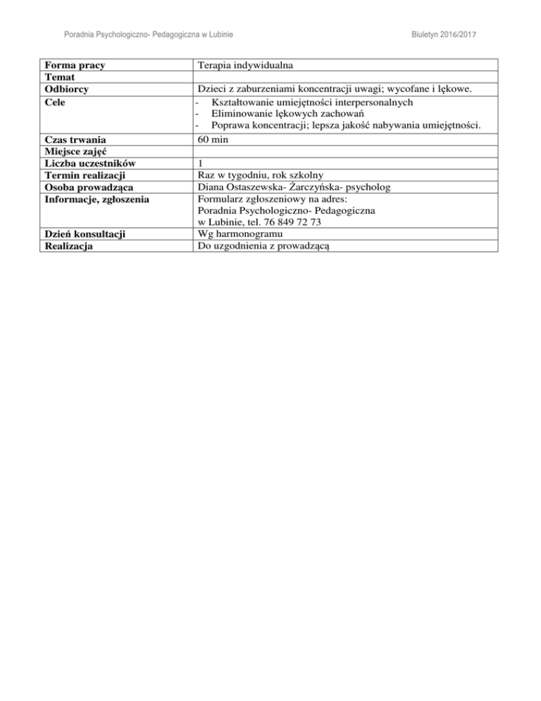 Poradnia Psychologiczno- Pedagogiczna w Lubinie Forma pracy Temat Odbiorcy Cele Czas trwania Miejsce zajęć Liczba uczestników Termin realizacji Osoba prowadząca Informacje, zgłoszenia Dzień konsultacji Realizacja Biuletyn 2016/2017 Terapia indywidualna Dzieci z zaburzeniami koncentracji uwagi; wycofane i lękowe. - Kształtowanie umiejętności interpersonalnych - Eliminowanie lękowych zachowań - Poprawa koncentracji; lepsza jakość nabywania umiejętności. 60 min 1 Raz w tygodniu, rok szkolny Diana Ostaszewska- Żarczyńska- psycholog Formularz zgłoszeniowy na adres: Poradnia Psychologiczno- Pedagogiczna w Lubinie, tel. 76 849 72 73 Wg harmonogramu Do uzgodnienia z prowadzącą