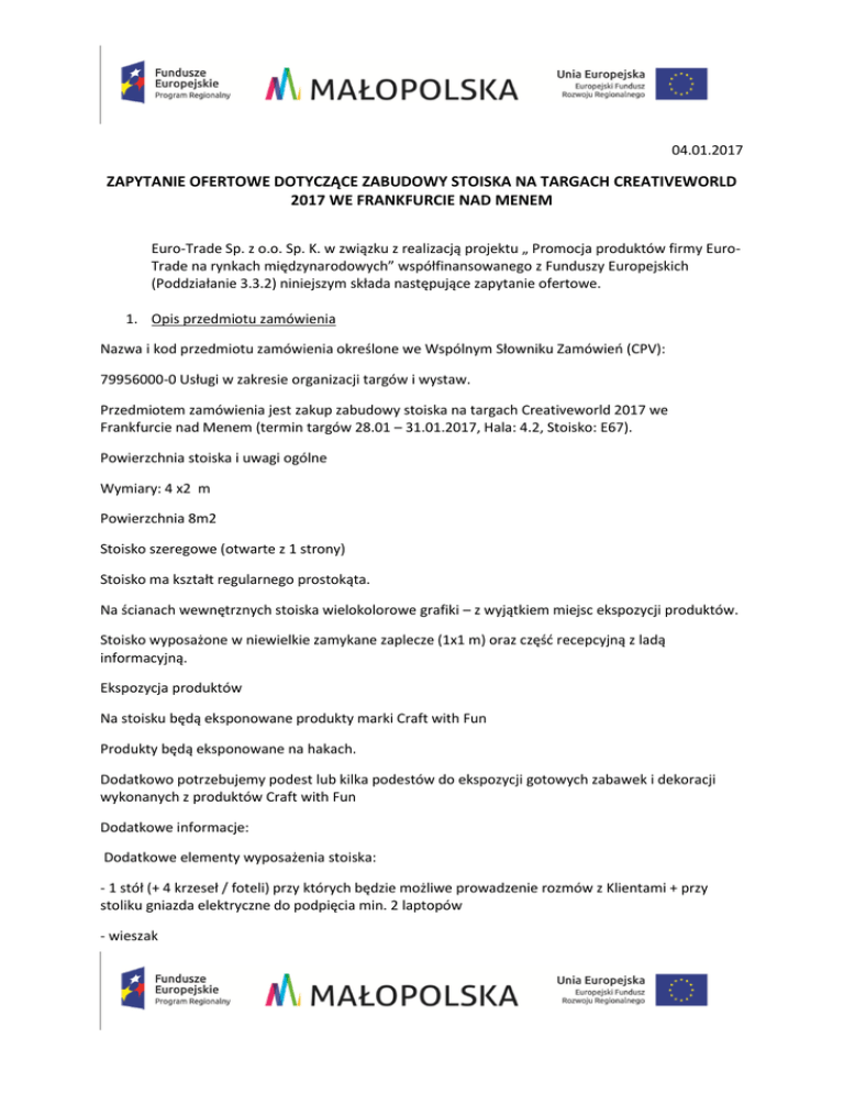 04.01.2017 ZAPYTANIE OFERTOWE DOTYCZĄCE ZABUDOWY STOISKA NA TARGACH CREATIVEWORLD 2017 WE FRANKFURCIE NAD MENEM Euro-Trade Sp. z o.o. Sp. K. w związku z realizacją projektu „ Promocja produktów firmy EuroTrade na rynkach międzynarodowych” współfinansowanego z Funduszy Europejskich (Poddziałanie 3.3.2) niniejszym składa następujące zapytanie ofertowe. 1. Opis przedmiotu zamówienia Nazwa i kod przedmiotu zamówienia określone we Wspólnym Słowniku Zamówień (CPV): 79956000-0 Usługi w zakresie organizacji targów i wystaw. Przedmiotem zamówienia jest zakup zabudowy stoiska na targach Creativeworld 2017 we Frankfurcie nad Menem (termin targów 28.01 – 31.01.2017, Hala: 4.2, Stoisko: E67). Powierzchnia stoiska i uwagi ogólne Wymiary: 4 x2 m Powierzchnia 8m2 Stoisko szeregowe (otwarte z 1 strony) Stoisko ma kształt regularnego prostokąta. Na ścianach wewnętrznych stoiska wielokolorowe grafiki – z wyjątkiem miejsc ekspozycji produktów. Stoisko wyposażone w niewielkie zamykane zaplecze (1x1 m) oraz część recepcyjną z ladą informacyjną. Ekspozycja produktów Na stoisku będą eksponowane produkty marki Craft with Fun Produkty będą eksponowane na hakach. Dodatkowo potrzebujemy podest lub kilka podestów do ekspozycji gotowych zabawek i dekoracji wykonanych z produktów Craft with Fun Dodatkowe informacje: Dodatkowe elementy wyposażenia stoiska: - 1 stół (+ 4 krzeseł / foteli) przy których będzie możliwe prowadzenie rozmów z Klientami + przy stoliku gniazda elektryczne do podpięcia min. 2 laptopów - wieszak - kosz na śmieci Prosimy o przesłanie oferty zawierającej: - projekt i wizualizację stoiska - pełny koszt oferty - listę i zdjęcia wykonanych przez Państwa do tej pory stoisk - listy referencyjne - prezentację Państwa firmy Euro-Trade nie ponosi kosztów przygotowania i przesłania oferty. 2. Warunki udziału w postępowaniu dot. wyboru wykonawcy: brak warunków 3. Kryteria oceny oferty: Ustala się cztery kryteria oceny ofert składanych w ramach niniejszego zapytania ofertowego: 1. innowacyjność i estetyka 2. cena 3. funkcjonalność 4. jakość zastosowanych materiałów 4. Wagi procentowe poszczególnych kryteriów: 1. Innowacyjność i estetyka – 40% 2. Cena – 30% 3. Funkcjonalność – 20% 4. Jakość zastosowanych materiałów – 10% 5. Opis sposobu przyznawania punktacji za spełnienie danego kryterium oceny oferty: 1. Innowacyjność i estetyka – stoisko powinno być atrakcyjne, kolorowe i nowoczesne. Zastosowana technologia oraz sposoby ekspozycji produktów powinny przyciągać uwagę potencjalnych Klientów i zachęcać ich do odwiedzenia stoiska. Im bardziej spełnione zostaną w/w oczekiwania tym więcej punktów oferta dostanie (skala punktów od 1 do 5). 2. Cena – cena wykonania stoiska powinna być dostosowana do realiów rynkowych i zapewnić realizację stoiska na optymalnym poziomie cenowym. Im bardziej spełnione zostaną w/w oczekiwanie tym więcej punktów oferta dostanie (skala punktów od 1 do 5). 3. Funkcjonalność – układ stoiska powinien zapewnić możliwość ekspozycji produktów w taki sposób, aby dostęp Klientów do tych produktów był jak najłatwiejszy, a poruszanie się w obrębie stoiska maksymalnie łatwe. Klienci muszą mieć łatwy dostęp do barku. Układ funkcjonalny powinien pozwolić obsłudze stoiska łatwo kontrolować kto wchodzi na stoisko. Im bardziej spełnione zostaną w/w oczekiwania tym więcej punktów oferta dostanie (skala punktów od 1 do 5). 4. Jakość zastosowanych materiałów – zastosowane materiały muszą zapewnić wykonanie stoiska, które będzie estetyczne, łatwe w utrzymaniu oraz trwałe przez cały okres trwania imprezy targowej. Im bardziej spełnione zostaną w/w oczekiwania tym więcej punktów oferta dostanie (skala punktów od 1 do 5). 6. Termin składania ofert: a. Termin składania ofert wynosi 7 dni od publikacji zapytania ofertowego. Ostatnim dniem składania ofert jest więc dzień 11.01.2017 r. (środa). b. Oferty prosimy przesyłać na adres: [email protected] 7. Termin realizacji umowy: Zabudowa musi zostać udostępniona najpóźniej 27.01.2017 o godz. 15:00. Zabudowa będzie wykorzystywana przez cały okres trwania imprezy targowej. 8. Informujemy, iż zamówienia w ramach niniejszego zapytania ofertowego nie mogą być udzielane podmiotom powiązanym kapitałowo lub osobowo z Euro-Trade Spółka z ograniczoną odpowiedzialnością Sp. K..