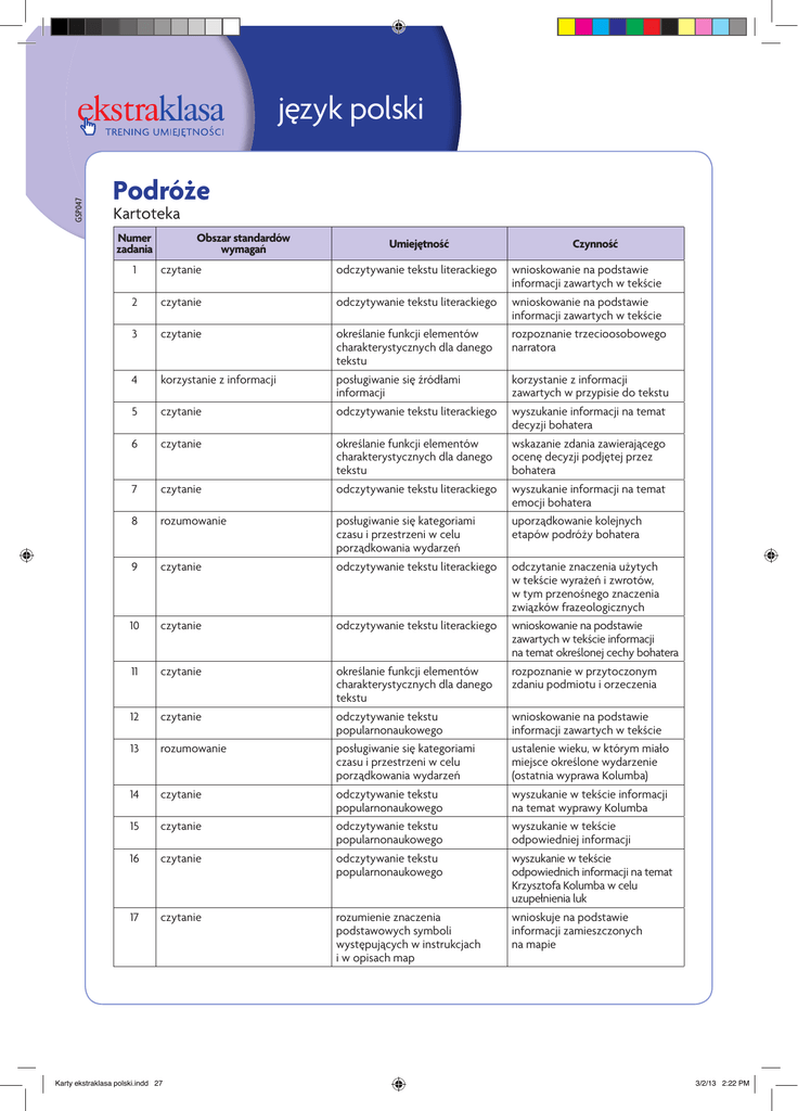 GSP047 język polski Podróże Kartoteka Numer zadania Obszar standardów wymagań Umiejętność Czynność 1 czytanie odczytywanie tekstu literackiego wnioskowanie na podstawie informacji zawartych w tekście 2 czytanie odczytywanie tekstu literackiego wnioskowanie na podstawie informacji zawartych w tekście 3 czytanie określanie funkcji elementów charakterystycznych dla danego tekstu rozpoznanie trzecioosobowego narratora 4 korzystanie z informacji posługiwanie się źródłami informacji korzystanie z informacji zawartych w przypisie do tekstu 5 czytanie odczytywanie tekstu literackiego wyszukanie informacji na temat decyzji bohatera 6 czytanie określanie funkcji elementów charakterystycznych dla danego tekstu wskazanie zdania zawierającego ocenę decyzji podjętej przez bohatera 7 czytanie odczytywanie tekstu literackiego wyszukanie informacji na temat emocji bohatera 8 rozumowanie posługiwanie się kategoriami czasu i przestrzeni w celu porządkowania wydarzeń uporządkowanie kolejnych etapów podróży bohatera 9 czytanie odczytywanie tekstu literackiego odczytanie znaczenia użytych w tekście wyrażeń i zwrotów, w tym przenośnego znaczenia związków frazeologicznych 10 czytanie odczytywanie tekstu literackiego wnioskowanie na podstawie zawartych w tekście informacji na temat określonej cechy bohatera 11 czytanie określanie funkcji elementów charakterystycznych dla danego tekstu rozpoznanie w przytoczonym zdaniu podmiotu i orzeczenia 12 czytanie odczytywanie tekstu popularnonaukowego wnioskowanie na podstawie informacji zawartych w tekście 13 rozumowanie posługiwanie się kategoriami czasu i przestrzeni w celu porządkowania wydarzeń ustalenie wieku, w którym miało miejsce określone wydarzenie (ostatnia wyprawa Kolumba) 14 czytanie odczytywanie tekstu popularnonaukowego wyszukanie w tekście informacji na temat wyprawy Kolumba 15 czytanie odczytywanie tekstu popularnonaukowego wyszukanie w tekście odpowiedniej informacji 16 czytanie odczytywanie tekstu popularnonaukowego wyszukanie w tekście odpowiednich informacji na temat Krzysztofa Kolumba w celu uzupełnienia luk 17 czytanie rozumienie znaczenia podstawowych symboli występujących w instrukcjach i w opisach map wnioskuje na podstawie informacji zamieszczonych na mapie Karty ekstraklasa polski.indd 27 3/2/13 2:22 PM język polski Numer zadania 18 Obszar standardów wymagań Umiejętność Czynność pisanie pisanie na temat i zgodnie z celem sformułowanie odpowiedzi i krótkiego uzasadnienia pisanie przestrzeganie norm ortograficznych i interpunkcyjnych zachowanie poprawności ortograficznej i interpunkcyjnej 19 pisanie celowe stosowanie środków językowych przekształcenie zdania z narracji trzecioosobowej w pierwszoosobową 20 pisanie pisanie na temat i zgodnie z celem napisanie fragmentu pamiętnika przedstawiającego określone wydarzenie i opisującego emocje bohatera pisanie celowe stosowanie środków językowych posługiwanie się funkcjonalnym stylem i słownictwem służącym przedstawianiu wydarzeń i wyrażaniu emocji pisanie przestrzeganie norm gramatycznych zachowanie poprawności językowej pisanie przestrzeganie norm ortograficznych zachowanie poprawności ortograficznej pisanie przestrzeganie norm interpunkcyjnych zachowanie poprawności interpunkcyjnej Podróże Schemat oceniania zadań Numer Odpowiedzi zadania 1 Na przykład: Akcja powyższego fragmentu powieści rozgrywa się w Warszawie. / Akcja toczy się w Warszawie. Zasady przyznawania punktów Punktacja Zapisanie zdania pojedynczego – 1 pkt Podanie poprawnej nazwy miasta – 1 pkt 0–2 2 B Zaznaczenie poprawnej odpowiedzi – 1 pkt 0–1 3 C Zaznaczenie poprawnej odpowiedzi – 1 pkt 0–1 4 A Zaznaczenie poprawnej odpowiedzi – 1 pkt 0–1 5 Chcąc udowodnić coś komuś, Zapisanie czterech pierwszych wyrazów właściwego wypowiedzenia – 1 pkt 0–1 6 A Zaznaczenie poprawnej odpowiedzi – 1 pkt 0–1 7 Na przykład: Mikołaj się przestraszył, ponieważ zawsze był wożony przez rodziców samochodem i nie znał miasta. Poprawne dokończenie zdania – 1 pkt 0–1 8 Okolice skweru Ryskiego – B most Łazienkowski – D Metro Politechnika – A Plac Konstytucji – C Poprawne uzupełnienie jednej luki – 1 pkt 0–4 Karty ekstraklasa polski.indd 28 3/2/13 2:22 PM język polski Numer Odpowiedzi zadania 9 być hazardzistą – B ile dusza zapragnie – C podszyty strachem – E rzucać się na żywioł – A traktować z podejrzliwością – D Zasady przyznawania punktów Punktacja Poprawne objaśnienie znaczenia jednego zwrotu lub wyrażenia – 1 pkt 0–5 10 Na przykład: strateg – osoba, która zanim podejmie jakieś działanie, najpierw bardzo dokładnie je planuje, rozważa różne możliwości i ewentualne zagrożenia. Poprawne wyjaśnienie znaczenia podanego słowa – 1 pkt 0–1 11 podmiot – pojawienie się orzeczenie – nie wywołało Podanie poprawnego rzeczownika pełniącego funkcję podmiotu – 1 pkt Podanie poprawnego czasownika pełniącego funkcję orzeczenia – 1 pkt 0–2 12 B Zaznaczenie poprawnego dokończenia zdania – 1 pkt 0–1 13 C Zaznaczenie poprawnej odpowiedzi – 1 pkt 0–1 14 D Zaznaczenie poprawnej odpowiedzi – 1 pkt 0–1 15 B Zaznaczenie poprawnej odpowiedzi – 1 pkt 0–1 16 Kolejno: odkrywców, Ameryką, Pinta Poprawne uzupełnienie jednej luki – 1 pkt 0–3 17 D Zaznaczenie poprawnej odpowiedzi – 1 pkt 0–1 18 Na przykład: Mikołaja można nazwać „małym Kolumbem”, bo tak jak wielki podróżnik wyrusza on w podróż. Udaje mu się też dotrzeć do miejsca, do którego wcale nie zamierzał jechać. Podobnie jak Kolumb Mikołaj przeżywa przygodę, która może być niebezpieczna. Sformułowanie oceny bohatera – 1 pkt Logiczne uzasadnienie oceny bohatera – 1 pkt 0–3 Mikołaja nie można nazwać „małym Kolumbem”, bo nie planuje on swojej podróży, nie wie, dokąd chce dotrzeć i cały czas porusza się blisko swojego domu. Mikołaj jedzie autobu