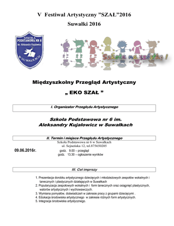 V Festiwal Artystyczny ”SZAŁ”2016 Suwałki 2016 Międzyszkolny Przegląd Artystyczny „ EKO SZAŁ ” I. Organizator Przeglądu Artystycznego Szkoła Podstawowa nr 6 im. Aleksandry Kujałowicz w Suwałkach II. Termin i miejsce Przeglądu Artystycznego 09.06.2016r. Szkoła Podstawowa nr 6 w Suwałkach ul. Sejneńska 12, tel.875650205 godz. 9.00 – przegląd godz. 13.30 – ogłoszenie wyników III. Cel imprezy 1. Prezentacja dorobku artystycznego dziecięcych i młodzieżowych zespołów wokalnych i tanecznych i plastycznych działających w Suwałkach 2. Popularyzacja zespołowych wokalnych i form tanecznych oraz osiągnięć plastycznych, walorów artystycznych i wychowawczych. 3. Wymiana pomysłów, doświadczeń w zakresie pracy z grupami dziecięcymi . 4. Edukacja środowiska artystycznego w zakresie różnych form artystycznych. 5. Integracja środowiska artystycznego. IV. Uczestnicy 1. Zespoły wokalne , taneczne oraz artyści sztuk plastycznych działające w szkołach, domach kultury, klubach tanecznych, szkołach tańca i innych placówkach kultury. 2. Przewiduje się : -kategoria piosenka , taniec ( solo, duet, zespół) klasy 0-3 klasy,4-6 - twórczość plastyczna ( indywidualnie) klasy 0-3 i 4-6 V. Formy artystyczne konkursu Taniec: A. Miniatura taneczna (etiuda)– zespoły przedstawiają 1 taniec posiadający jednolity styl i charakter, do utworu instrumentalnego lub instrumentalno-wokalnego. Preferowana jednolita technika i forma. Czas prezentacji do 4 minut. B. Inscenizacja taneczna – zespoły prezentują 1 interpretację wybranego tematu przy użyciu różnych technik tanecznych, kostiumów, rekwizytów etc. Zespół przedstawia w konkursie inscenizację taneczną. Czas prezentacji do 5 minut. C. Disco – dance – prezentacja taneczna wykorzystująca techniki disco freestyle, hip – hop, disco – dance, elektric boogie, funky i in. Zespół przedstawia 1 choreografie o czasie trwania do 4 min. D. Taniec ludowy. Piosenka: A. Solo, duet ,zespół –piosenka dostosowana do wieku i umiejętności uczestnika. PLASTYKA A. Dowolna technika plastyczna B. Praca wykonywana na miejscu C. Przybory malarskie zapewnia organizator D. Max z jednej szkoły 3 osoby E. Temat: Jestem spoko, jestem EKO! VI. Organizacja Przeglądu * Do udziału w części konkursowej Przeglądu zgłaszają udział: - soliści , duety wokalne i taneczne, - zespoły wokalne i taneczne - artyści sztuk plastycznych . * nieprzekraczalnym terminie do 04.06.2016r. VII. Ocena i Nagrody 1.Kryteria ocen Jury: - dobór repertuaru - opracowanie, aranżacja, choreografia - technika wykonania, - ogólny wyraz artystyczny - technika malarska -zgodność pracy z tematem - jakość wykonania 2. Kultura osobista uczestników wpływa na ogólną ocenę Jury w przyznawaniu nagród. VIII. Przepisy techniczne - nagrania na płytach CD, - każda płyta musi być opisana: nazwa zespołu, tytuł pokazu, twórca, precyzyjny czas trwania utworu. - uczestnik biorący udział w konkursie plastycznym musi mieć wygodny strój . IX. Uwagi dodatkowe Zespół powinien posiadać odpowiednią ilość opiekunów, gwarantującą bezpieczeństwo uczestników. -Instruktor nie powinien być jedynym opiekunem zespołu. 1. 2. Jury zastrzega sobie prawo do ostatecznego zakwalifikowania zespołu do danej kategorii. Instruktor lub choreograf zespołu może być jednocześnie członkiem tego zespołu i w trakcie przeglądu występować z zespołem na scenie. Sprawy nie ujęte w regulaminie rozstrzyga Organizator.