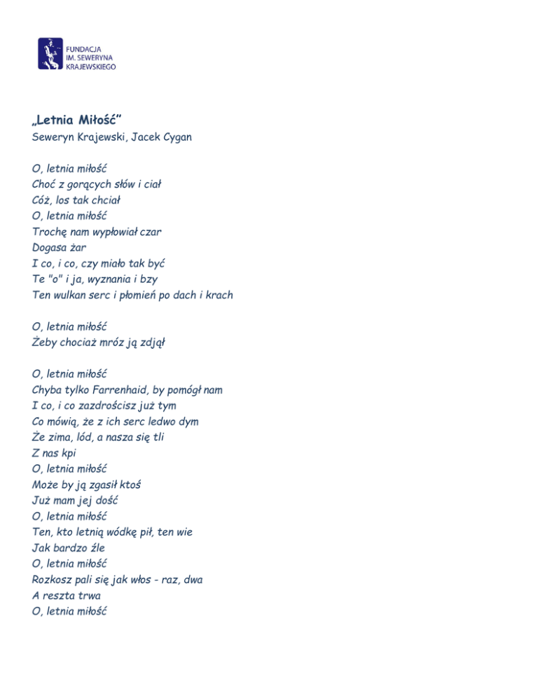 „Letnia Miłość” Seweryn Krajewski, Jacek Cygan O, letnia miłość Choć z gorących słów i ciał Cóż, los tak chciał O, letnia miłość Trochę nam wypłowiał czar Dogasa żar I co, i co, czy miało tak być Te "o" i ja, wyznania i bzy Ten wulkan serc i płomień po dach i krach O, letnia miłość Żeby chociaż mróz ją zdjął O, letnia miłość Chyba tylko Farrenhaid, by pomógł nam I co, i co zazdrościsz już tym Co mówią, że z ich serc ledwo dym Że zima, lód, a nasza się tli Z nas kpi O, letnia miłość Może by ją zgasił ktoś Już mam jej dość O, letnia miłość Ten, kto letnią wódkę pił, ten wie Jak bardzo źle O, letnia miłość Rozkosz pali się jak włos - raz, dwa A reszta trwa O, letnia miłość