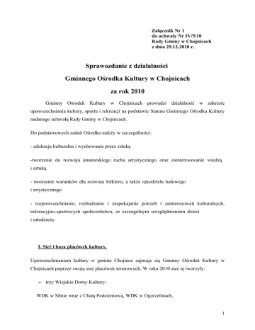 Załącznik Nr 1 do uchwały Nr IV/5/10 Rady Gminy w Chojnicach z dnia 29.12.2010 r. Sprawozdanie z działalności Gminnego Ośrodka Kultury w Chojnicach za rok 2010 Gminny Ośrodek Kultury w Chojnicach prowadzi działalność w zakresie upowszechniania kultury, sportu i rekreacji na podstawie Statutu Gminnego Ośrodka Kultury nadanego uchwałą Rady Gminy w Chojnicach. Do podstawowych zadań Ośrodka należy w szczególności: - edukacja kulturalna i wychowanie przez sztukę -tworzenie do rozwoju amatorskiego ruchu artystycznego oraz zainteresowanie wiedzą i sztuką - tworzenie warunków dla rozwoju folkloru, a także rękodzieła ludowego i artystycznego - rozpowszechnianie, rozbudzanie i zaspokajanie potrzeb i zainteresowań kulturalnych, rekreacyjno-sportowych społeczeństwa, ze szczególnym uwzględnieniem dzieci i młodzieży. I. Sieć i baza placówek kultury. Upowszechnianiem kultury w gminie Chojnice zajmuje się Gminny Ośrodek Kultury w Chojnicach poprzez swoją sieć placówek terenowych. W roku 2010 sieć tę tworzyły: • trzy Wiejskie Domy Kultury: WDK w Silnie wraz z Chatą Podcieniową, WDK w Ogorzelinach, 1 WDK w Swornegaciach wraz z Kaszubskim Domem Rękodzieła Ludowego dwanaście Świetlic Wiejskich: Chojniczki, Nowe Ostrowite, Ciechocin, Czartołomie, • Angowice, Nowy Dwór, Pawłowo, Krojanty, Racławki, Lotyń, Klawkowo, i nowo -wyremontowana w Kruszce, dwa Amfiteatry Letnie: Amfiteatr im. Ottona Weilanda w Charzykowach, Amfiteatr • Letni w Swornegaciach, W wymienionych obiektach prowadzona była statutowa działalność GOK, a także udostępniane były one mieszkańcom na różnego rodzaju spotkania, zebrania, narady, konferencje, szkolenia rolnicze, sesja RG oraz pokazy i kiermasze. Ponadto pomieszczenia GOK wynajmowano na uroczystości rodzinne i towarzyskie. II. Zatrudnienie w Gminnym Ośrodku Kultury W 2010 roku w Gminnym Ośrodku Kultury w Chojnicach zatrudnionych było średnio 32 pracowników, co dawało 22,41etatu. Tabela 1. Kształtowanie się zatrudnienia w Gminnym Ośrodku Kultury w Chojnicach w 2010 roku. Miesiące WDK i Sport Administracja Promocja RAZEM Świetlice osoby etaty osoby etaty osoby etaty osoby etaty osoby etaty styczeń 24 14,62 1 1 4 4 2 2 31 21,62 luty 24 14,62 1 1 4 4 2 2 31 21,62 marzec 24 14,62 1 1 4 4 2 2 31 21,62 kwiecień 24 14,62 1 1 4 4 2 2 31 21,62 maj 23 14,12 1 1 4 4 2 2 30 21,12 czerwiec 24 14,62 1 1 4 4 2 2 31 21,62 lipiec 24 14,62 1 1 4 4 2 2 31 21,62 sierpień 24 14,62 1 1 6 6 2 2 33 23,62 wrzesień 24 14,62 1 1 6 6 2 2 33 23,62 październi 24 14,62 1 1 6 6 2 2 33 23,62 listopad 24 14,62 1 1 6 6 2 2 33 23,62 grudzień 24 14,62 1 1 6 6 2 2 33 23,62 k 2 Zmiany w ilości zatrudnianych pracowników i liczby etatów w Gminnym Ośrodku Kultury w Chojnicach w 2010 roku związane są z zatrudnieniem pracowników na zastępstwa za osoby przebywające na dłuższych zwolnieniach chorobowych i urlopach macierzyńskich. W celu wsparcia osobowego placówek Gminnego Ośrodka Kultury w Chojnicach także w roku 2010 nawiązano ścisłą współpracę z Powiatowym Urzędem Pracy w Chojnicach, której efektem było zawarcie kilku umów na organizację 14 staży zawodowych. Gminny Ośrodek Kultury w Chojnicach jest koordynatorem działalności Świetlic i Domów Kultury, wspiera je m.in. instruktażowo i merytorycznie. W tym celu raz w miesiącu organizowano narady robocze o różnorodnej tematyce: - podejmowanie wspólnych inicjatyw i planowanie wspólnej działalności - praca na rzecz dzieci i młodzieży - instruktaże dot. organizacji imprez - analizy miesięcznych planów pracy i ocena ich realizacji - sprawy finansowe; - sprawy administracyjno –organizacyjne W ramach działalności GOK prowadzona jest edukacja kulturalna dzieci młodzieży z terenu całej gminy zasadzie uczestnictwa w sekcjach, zespołach oraz imprezach organizowanych przez GOK cyklicznie bądź tez okolicznościowo: np. konkursach plastycznych, recytatorskich, turniejach czy zawodach sprawnościowych, a także organizowanych w ciągu roku wycieczkach. Ponadto każdego dnia, placówki pełniły funkcję opiekuńczo-wychowawczą prowadząc zajęcia świetlicowe w oparciu o miesięczne harmonogramy pracy. Działalność Gminnego Ośrodka Kultury w Chojnicach ma na celu kształtowanie osobowości dzieci i młodzieży, przygotowanie ich do aktywnego uczestnictwa w życiu kulturalnym i społecznym, ujawnianie i rozwijanie uzdolnień w amatorskim ruchu 3 artystycznym, budzenie zainteresowań kulturotwórczych, wdrażanie do kulturalnego spędzania wolnego czasu pozbawionego wszelkiego rodzaju używek oraz kultywowania tradycji. Należy zaznaczyć, że coraz większym zainteresowaniem cieszą się prowadzone ciekawymi metodami zajęcia profilaktyczne koordynowane w naszych placówkach przez Pana Adama Modrzejewskiego – pełnomocnika Wójta ds. profilaktyki i przeciwdziałania uzależnieniom oraz przemocy . W celu podnoszenia jakości tych zajęć, co dwa tygodnie instruktorzy uczestniczą w spotkaniu konsultacyjnym prowadzonym w Świetlicy socjoterapeutycznej „SCHRON” na ul. Kościerskiej. Nagrodą za systematyczny udział w zajęciach w ciągu całego roku jest udział dzieci w dwudniowym wyjeździe do Ośrodka Wypoczynkowego w Babilonie. Naszej codziennej pracy towarzyszyła troska o bezpieczeństwo dzieci i młodzieży przebywających w placówkach, oraz troska o kształtowanie w młodych ludziach nawyku kulturalnego zachowania się w miejscu publicznym. III. Działalność kulturalno-wychowawcza i artystyczna. Działalność Gminnego Ośrodka Kultury w Chojnicach można podzielić na kilka podstawowych kierunków: - edukacyjno-wychowawczy: uczestnictwo dzieci i młodzieży w stałych formach pracy GOK - każda z placówek pracowała w oparciu o systematycznie przygotowywane harmonogramy pracy zajęć świetlicowych oraz zajęć w sekcjach tematycznych (indywidualna nauka gry na instrumentach (ok. 60 os.), lekcje języka angielskiego (ok. 25 os.), próby
