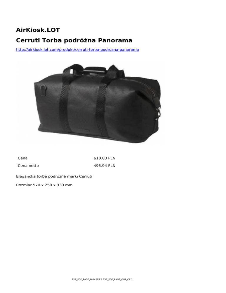 AirKiosk.LOT Cerruti Torba podróżna Panorama http://airkiosk.lot.com/produkt/cerruti-torba-podrozna-panorama Cena 610.00 PLN Cena netto 495.94 PLN Elegancka torba podróżna marki Cerruti Rozmiar 570 x 250 x 330 mm TXT_PDF_PAGE_NUMBER 1 TXT_PDF_PAGE_OUT_OF 1