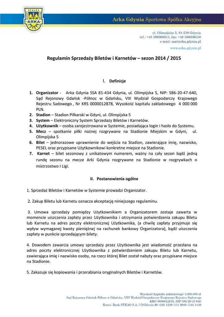 Regulamin Sprzedaży Biletów i Karnetów – sezon 2014 / 2015 I. Definicje 1. Organizator - Arka Gdynia SSA 81-434 Gdynia, ul. Olimpijska 5, NIP: 586-20-47-640, Sąd Rejonowy Gdańsk -Północ w Gdańsku, VIII Wydział Gospodarczy Krajowego Rejestru Sadowego , Nr KRS 0000012878, Wysokość kapitału zakładowego 4 000 000 PLN. 2. Stadion – Stadion Piłkarski w Gdyni, ul. Olimpijska 5 3. System – Elektroniczny System Sprzedaży Biletów i Karnetów. 4. Użytkownik – osoba zarejestrowana w Systemie, posiadająca login i hasło do Systemu. 5. Mecz – spotkanie piłki nożnej rozgrywane na Stadionie Miejskim w Gdyni, ul. Olimpijska 5 6. Bilet – jednorazowe uprawnienie do wejścia na Stadion, zawierające imię, nazwisko, PESEL oraz przypisane Użytkownikowi konkretne miejsce na Stadionie. 7. Karnet – bilet sezonowy z unikatowym numerem, ważny na cały sezon bądź jedną rundę sezonu na mecze Arki Gdynia rozgrywane na Stadionie w rozgrywkach o mistrzostwo I Ligi. II. Postanowienia ogólne 1. Sprzedaż Biletów i Karnetów w Systemie prowadzi Organizator. 2. Zakup Biletu lub Karnetu oznacza akceptację niniejszego regulaminu. 3. Umowa sprzedaży pomiędzy Użytkownikiem a Organizatorem zostaje zawarta w momencie uiszczenia zapłaty przez Użytkownika i otrzymania potwierdzenia zakupu Biletu lub Karnetu na adres poczty elektronicznej Użytkownika, (a chwilę zapłaty przyjmuje się wpływ wymaganej kwoty pieniężnej na rachunek bankowy Organizatora), bądź uiszczenia zapłaty w punkcie sprzedającym bilety. 4. Dowodem zawarcia umowy sprzedaży przez Użytkownika jest wiadomość przesłana na adres poczty elektronicznej Użytkownika z potwierdzeniem zakupu Biletu lub Karnetu, zawierająca imię i nazwisko osoby, na rzecz której Bilet został nabyty oraz przypisane miejsce na Stadionie. 5. Zakazuje się kopiowania i przerabiania oryginalnych Biletów i Karnetów. 6. Bilet lub Karnet jest własnością osoby, której dane osobowe są przypisane do danego Biletu lub Karnetu. 7. Biletu lub Karnetu nie wolno odstępować ani odsprzedawać innym osobom bez zgody Organizatora. 8. Wykorzystując Bilet lub Karnet, Użytkownik akceptuje ogólne warunki i zasady ustalone przez Organizatora oraz zasady obowiązujące na terenie obiektu, na którym odbywa się mecz. 9. Użytkownik oświadcza, że będzie korzystał z Systemu wyłącznie w celu zakupu Biletu, Karnetu bądź założenia profilu. 10. Organizator nie ponosi odpowiedzialności za niezawiniony przez Organizatora brak możliwości korzystania przez Użytkowników z Systemu. 11. Biletów bądź Karnetów nie sprzedaje się osobom: a) wobec których zostało wydane orzeczenie zakazujące wstępu na imprezę masową lub orzeczenie zobowiązujące do powstrzymywania się od przebywania w miejscach przeprowadzania imprez masowych wydane przez sąd w związku z warunkowym zawieszeniem wykonania kary pozbawienia wolności; b) wobec których został wydany zakaz stadionowy nałożony przez uprawnione do tego podmioty innych państw, o którym informacje przekazano Komendantowi Głównemu Policji; c) wobec których został wydany aktualny zakaz klubowy. 12. Arka Gdynia SSA nie ponosi odpowiedzialności za odwołanie zawodów z przyczyn losowych oraz spowodowane siłą wyższą. III. Zasady sprzedaży biletów i karnetów w systemie bilety.arka.gdynia.pl 1. System sprzedaży on-line na stronie bilety.arka.gdynia.pl jest serwisem sprzedaży, w którym odbywa się dystrybucja Biletów i Karnetów na mecze Arki Gdynia rozgrywane na Stadionie. 2. Realizacja płatności w systemie sprzedaży on-line przebiega zgodnie z regulaminem operatora systemu PayU S.A. (z siedzibą w Poznaniu, ul Marcelińska 90). Zapłata jest regulowana przez Użytkownika z własnego konta bankowego lub za pomocą karty kredytowej. 3. Do każdej transakcji Biletu lub Karnetu zakupionego w Internecie doliczana będzie opłata manipulacyjna, w której zawarte są prowizje bankowe wynikające z systemu płatności online. 4. W celu dokonania zakupu należy zarejestrować się w serwisie bilety.arka.gdynia.pl lub założyć profil w punkcie sprzedaży (nie dotyczy osób, które posiadały karnety bądź kupowały bilety w rundzie jesiennej 2014, w sezonie 2013/ 2014 lub wcześniej). 5. Jeden kibic może zarejestrować w Systemie online innego kibica, pod warunkiem, że zna jego wszystkie dane (w tym adres e-mail niezbędny do aktywacji konta). Rejestrujący tym samym bierze odpowiedzialność za podanie prawidłowych danych. 6. Na jednego zarejestrowanego kibica przypada jeden Bilet bądź Karnet. 7. Każda umowa rejestrowana jest w systemie informatycznym Organizatora. 8. Kwota należności wynikająca z danego zamówienia winna zostać zrealizowana natychmiast po dokonaniu zamówienia. Bilety oraz Karnety pozostają własnością Klubu do czasu odnotowania płatności na rachunek Organizatora. 9. W celu udokumentowania faktu dokonania płatności, w sytuacjach spornych podstawę reklamacji stanowić będzie wydrukowany z zakładki „Twoje zakupy” Bilet bądź potwierdzenie zapłaty. 10. Kupujący zobowiązany jest skontrolować Bilet lub Karnet niezwłocznie po jego otrzymaniu, co do zgodności w zakresie: zgodności danych osobowych, sektora, miejsca. 11. Harmonogram sprzedaży Biletów / Karnetów, cennik oraz lista punktów sprzedaży dostępne są na stronie Organizatora (www.arka.gdynia.pl). 13. Uwagi i zapytania prosimy kierować na adres [email protected] 14. Kwota prowizji internetowych znajduje się w tabelce, która jest załącznikiem do tego regulaminu. IV. Procedura sprzedaży Biletów 1. Sprzedaż online dla zarejestrowanych kibiców, posiadających pełen profil wraz ze zdjęciem: a) Logują się do systemu - by zalogować się do systemu należy wpisać jako login swój adres E-MAIL podany podczas rejestracji bądź numer PESEL, a jako hasło nazwisko pisane w całości wielkimi literami z zachowaniem polskich znaków b) c) d) e) bądź hasło własne.