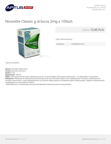 Apteka Avena Królewiecka 12c, Płock +48 502 666 011 Nicorette Classic g d/żucia 2mg x 105szt. Cena: 72,95 PLN Opis słownikowy Producent PHARMACIA A.B. Opis produktu Nazwa: Nicorette Classic Gum Postać: guma do żucia lecz. Dawka: 2 mg Opakowanie: 105 szt. Skład: Jedna guma zawiera jako substancję czynną 10 mg kompleksu 20% żywicy nikotynowej – co odpowiada 2 mg nikotyny. Wskazania: Wskazania do stosowania:Lecznicza guma do żucia Nicorette Classic Gum wskazana jest w leczeniu uzależnienia od wyrobów tytoniowych u osób zdecydowanych na rzucenie nałogu poprzez zmniejszenie głodu nikotynowego i objawów odstawiennych występujących po zaprzestaniu palenia. : Nadwrażliwość na substancję czynną lub którąkolwiek substancję pomocniczą produktu. Plik wygenerowano: 03-03-2017 Powered by TCPDF (www.tcpdf.org) Oprogramowanie sklepu: AptusShop