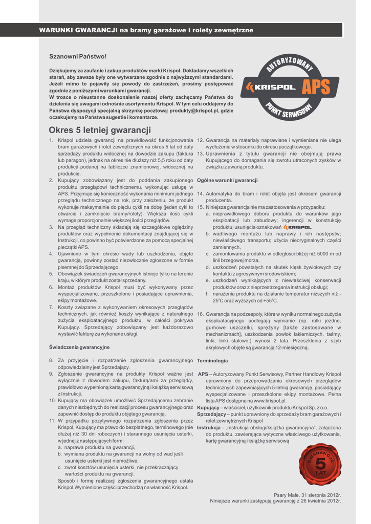 WARUNKI GWARANCJI na bramy garażowe i rolety zewnętrzne O R Y Z O WA N Y UT UN KT Y APS P Dziękujemy za zaufanie i zakup produktów marki Krispol. Dokładamy wszelkich starań, aby zawsze były one wytwarzane zgodnie z najwyższymi standardami. Jeżeli mimo to pojawiły się powody do zastrzeżeń, prosimy postępować zgodnie z poniższymi warunkami gwarancji. W trosce o nieustanne doskonalenie naszej oferty zachęcamy Państwa do dzielenia się uwagami odnośnie asortymentu Krispol. W tym celu oddajemy do Państwa dyspozycji specjalną skrzynkę pocztową: [email protected], gdzie oczekujemy na Państwa sugestie i komentarze. A Szanowni Państwo! SE R WISO W Okres 5 letniej gwarancji 1. Krispol udziela gwarancji na prawidłowość funkcjonowania bram garażowych i rolet zewnętrznych na okres 5 lat od daty sprzedaży produktu widocznej na dowodzie zakupu (faktura lub paragon), jednak na okres nie dłuższy niż 5,5 roku od daty produkcji podanej na tabliczce znamionowej, widocznej na produkcie. 2. Kupujący zobowiązany jest do poddania zakupionego produktu przeglądowi technicznemu, wykonując usługę w APS. Przyjmuje się konieczność wykonania minimum jednego przeglądu technicznego na rok, przy założeniu, że produkt wykonuje maksymalnie do pięciu cykli na dobę (jeden cykl to otwarcie i zamknięcie bramy/rolety). Większa ilość cykli wymaga proporcjonalnie większej ilości przeglądów. 3. Na przegląd techniczny składają się szczegółowe oględziny produktów oraz wypełnienie dokumentacji znajdującej się w Instrukcji, co powinno być potwierdzone za pomocą specjalnej pieczątki APS. 4. Ujawnione w tym okresie wady lub uszkodzenia, objęte gwarancją, powinny zostać niezwłocznie zgłoszone w formie pisemnej do Sprzedającego. 5. Obowiązek świadczeń gwarancyjnych istnieje tylko na terenie kraju, w którym produkt został sprzedany. 6. Montaż produktów Krispol musi być wykonywany przez wyspecjalizowane, przeszkolone i posiadające uprawnienia, ekipy montażowe. 7. Koszty związane z wykonywaniem okresowych przeglądów technicznych, jak również koszty wynikające z naturalnego zużycia eksploatacyjnego produktu, w całości pokrywa Kupujący. Sprzedający zobowiązany jest każdorazowo wystawić fakturę za wykonane usługi. Świadczenia gwarancyjne 8. Za przyjęcie i rozpatrzenie zgłoszenia gwarancyjnego odpowiedzialny jest Sprzedający. 9. Zgłoszenie gwarancyjne na produkty Krispol ważne jest wyłącznie z dowodem zakupu, fakturą/ami za przegląd/y, prawidłowo wypełnioną kartą gwarancyjną i książką serwisową z Instrukcji. 10. Kupujący ma obowiązek umożliwić Sprzedającemu zebranie danych niezbędnych do realizacji procesu gwarancyjnego oraz zapewnić dostęp do produktu objętego gwarancją. 11. W przypadku pozytywnego rozpatrzenia zgłoszenia przez Krispol, Kupujący ma prawo do bezpłatnego, terminowego (nie dłużej niż 30 dni roboczych) i starannego usunięcia usterki, w jednej z następujących form: a. naprawa produktu na gwarancji, b. wymiana produktu na gwarancji na wolny od wad jeśli usunięcie usterki jest niemożliwe, c. zwrot kosztów usunięcia usterki, nie przekraczający wartości produktu na gwarancji. Sposób i formę realizacji zgłoszenia gwarancyjnego ustala Krispol.Wymienione części przechodzą na własność Krispol. 12. Gwarancja na materiały naprawiane i wymieniane nie ulega wydłużeniu w stosunku do okresu początkowego. 13. Uprawnienia z tytułu gwarancji nie obejmują prawa Kupującego do domagania się zwrotu utraconych zysków w związku z awarią produktu. Ogólne warunki gwarancji 14. Automatyka do bram i rolet objęta jest okresem gwarancji producenta. 15. Niniejsza gwarancja nie ma zastosowania w przypadku: a. nieprawidłowego doboru produktu do warunków jego eksploatacji lub zabudowy; ingerencji w konstrukcję produktu; usunięcia oznakowań b. wadliwego montażu lub naprawy i ich następstw; niewłaściwego transportu; użycia nieoryginalnych części zamiennych, c. zamontowania produktu w odległości bliżej niż 5000 m od linii brzegowej morza, d. uszkodzeń powstałych na skutek klęsk żywiołowych czy kontaktu z agresywnym środowiskiem; e. uszkodzeń wynikających z niewłaściwej konserwacji produktów oraz z nieprzestrzegania instrukcji obsługi; f. narażenia produktu na działanie temperatur niższych niż 25oC oraz wyższych od +55oC. 16. Gwarancja na podzespoły, które w wyniku normalnego zużycia eksploatacyjnego podlegają wymianie (np. rolki jezdne, gumowe uszczelki, sprężyny [także zastosowane w mechanizmach], uszkodzenia powłok lakierniczych, taśmy, linki, linki stalowe,) wynosi 2 lata. Przeszklenia z szyb akrylowych objęte są gwarancją 12-miesięczną. Terminologia APS – Autoryzowany Punkt Serwisowy, Partner Handlowy Krispol uprawniony do przeprowadzania okresowych przeglądów technicznych zapewniających 5-letnią gwarancję, posiadający wyspecjalizowane i przeszkolone ekipy montażowe. Pełna lista APS dostępna na www.krispol.pl. Kupujący – właściciel, użytkownik produktu Krispol Sp. z o.o. Sprzedający – punkt uprawniony do sprzedaży bram garażowych i rolet zewnętrznych Krispol Instrukcja - „Instrukcja obsługi/książka gwarancyjna”; załączona do produktu, zawierająca wytyczne właściwego użytkowania, kartę gwarancyjną i książkę serwisową Psary Małe, 31 sierpnia 2012r. Niniejsze warunki zastępują gwarancję z 26 kwietnia 2012r.