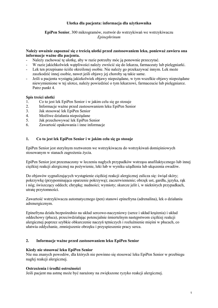 Ulotka dla pacjenta: informacja dla użytkownika EpiPen Senior, 300 mikrogramów, roztwór do wstrzykiwań we wstrzykiwaczu Epinephrinum Należy uważnie zapoznać się z treścią ulotki przed zastosowaniem leku, ponieważ zawiera ona informacje ważne dla pacjenta. - Należy zachować tę ulotkę, aby w razie potrzeby móc ją ponownie przeczytać. - W razie jakichkolwiek wątpliwości należy zwrócić się do lekarza, farmaceuty lub pielęgniarki. - Lek ten przepisano ściśle określonej osobie. Nie należy go przekazywać innym. Lek może zaszkodzić innej osobie, nawet jeśli objawy jej choroby są takie same. - Jeśli u pacjenta wystąpią jakiekolwiek objawy niepożądane, w tym wszelkie objawy niepożądane niewymienione w tej ulotce, należy powiedzieć o tym lekarzowi, farmaceucie lub pielęgniarce. Patrz punkt 4. Spis treści ulotki 1. Co to jest lek EpiPen Senior i w jakim celu się go stosuje 2. Informacje ważne przed zastosowaniem leku EpiPen Senior 3. Jak stosować lek EpiPen Senior 4. Możliwe działania niepożądane 5. Jak przechowywać lek EpiPen Senior 6. Zawartość opakowania i inne informacje 1. Co to jest lek EpiPen Senior i w jakim celu się go stosuje EpiPen Senior jest sterylnym roztworem we wstrzykiwaczu do wstrzykiwań domięśniowych stosowanym w stanach zagrożenia życia. EpiPen Senior jest przeznaczony w leczeniu nagłych przypadków wstrząsu anafilaktycznego lub innej ciężkiej reakcji alergicznej na pożywienie, leki lub w wyniku użądlenia lub ukąszenia owadów. Do objawów sygnalizujących wystąpienie ciężkiej reakcji alergicznej zalicza się: świąd skóry; pokrzywkę (przypominająca oparzenie pokrzywą); zaczerwienienie; obrzęk ust, gardła, języka, rąk i nóg; świszczący oddech; chrypkę; nudności; wymioty; skurcze jelit i, w niektórych przypadkach, utratę przytomności. Zawartość wstrzykiwacza automatycznego (pen) stanowi epinefryna (adrenalina), lek o działaniu adrenergicznym. Epinefryna działa bezpośrednio na układ sercowo-naczyniowy (serce i układ krążenia) i układ oddechowy (płuca), przeciwdziałając potencjalnie śmiertelnym następstwom ciężkiej reakcji alergicznej poprzez szybkie obkurczenie naczyń tętniczych i rozluźnienie mięśni w płucach, co ułatwia oddychanie, zmniejszenie obrzęku i przyspieszenie pracy serca. 2. Informacje ważne przed zastosowaniem leku EpiPen Senior Kiedy nie stosować leku EpiPen Senior Nie ma znanych powodów, dla których nie powinno się stosować leku EpiPen Senior w przebiegu nagłej reakcji alergicznej. Ostrzeżenia i środki ostrożności Jeśli pacjent ma astmę może być narażony na zwiększone ryzyko reakcji alergicznej. 1 Każdy pacjent, u którego wystąpiła reakcja anafilaktyczna powinien zgłosić się do lekarza w celu wykonania badań na obecność substancji, na które mogą być uczuleni, aby unikać ich w przyszłości. Ważne jest, aby pamiętać, że alergia na jedną substancję może prowadzić do alergii na liczne substancje pokrewne. Jeśli pacjent ma alergię pokarmową ważne jest, aby sprawdzić wszystkie przyjmowane składniki (w tym leki), ponieważ nawet niewielkie ilości mogą powodować ciężkie reakcje alergiczne. Należy powiedzieć lekarzowi, jeśli pacjent ma: chorobę serca nadczynność tarczycy wysokie ciśnienie tętnicze krwi cukrzycę zwiększone ciśnienie wewnątrz oka (jaskra) ciężką chorobę nerek guz gruczołu krokowego (prostaty) wysoki poziom wapnia lub niski poziom potasu we krwi chorobę Parkinsona Pomimo wymienionych powyżej zastrzeżeń, epinefryna jest niezbędna w leczeniu ciężkiej reakcji alergicznej. Pacjentów z wymienionymi chorobami oraz wszystkie osoby, które mogą znaleźć się w sytuacji, w której zaistnieje konieczność podania leku EpiPen Senior pacjentowi z gwałtownie przebiegającą reakcją alergiczną, należy właściwie poinstruować, w jakich sytuacjach zastosować ten lek. W celu uniknięcia przypadkowego wstrzyknięcia leku należy postępować zgodnie z instrukcją obsługi wstrzykiwacza automatycznego. Lek EpiPen Senior może być wstrzykiwany wyłącznie w zewnętrzną stronę uda. Nie należy wstrzykiwać leku w pośladek z uwagi na ryzyko przypadkowego wstrzyknięcia leku do żyły. Ostrzeżenia: Przypadkowe wstrzyknięcie leku do dłoni lub palców może spowodować zatrzymanie dopływu krwi do tego miejsca. W razie przypadkowego wstrzyknięcia leku do tych obszarów ciała należy niezwłocznie udać się do izby przyjęć najbliższego szpitala w celu podjęcia leczenia. Dzieci i młodzież Dla dzieci o masie ciała od 15 kg do 30 kg dostępny jest lek EpiPen Jr. zawierający 150 mikrogramów epinefryny w jednej dawce, we wstrzykiwaczu automatycznym. U dzieci o masie ciała mniejszej niż 15 kg, nie można podać z wystarczającą dokładnością dawki wynoszącej mniej niż 150 mikrogramów, dlatego, u tych pacjentów nie zaleca się stosowania leku, chyba że na wyraźne zalecenie lekarza i w stanach zagrożenia życia. EpiPen Senior a inne leki Należy powiedzieć lekarzowi lub farmaceucie o wszystkich przyjmowanych aktualnie lub ostatnio lekach, a także o lekach, które pacjent planuje stosować. Jest to szczególnie ważne u pacjentów przyjmujących następujące leki: leki przeciwdepresyjne, jak trójpierścieniowe leki przeciwdepresyjne lub inhibitory monoaminooksydazy (inhibitory MAO), ponieważ mogą one nasilać działanie epinefryny leki stosowane w chorobie Parkinsona, takie jak inhibitory katecholo-O-metylotransferazy (inhibitory COMT) i lewodopa, ze względu na możliwość nasilenia działania epinefryny leki zwiększające podatność serca na występowanie zaburzeń rytmu serca (arytmii), jak digoksyna lub chinidyna leki należące do grupy antagonistów receptora beta-adrenergicznego (beta-blokery) stosowane w chorobach serca lub leki stosowane w chorobach układu nerwowego, ze względu na możliwość osłabienia działania epinefryny leki stosowane w choro