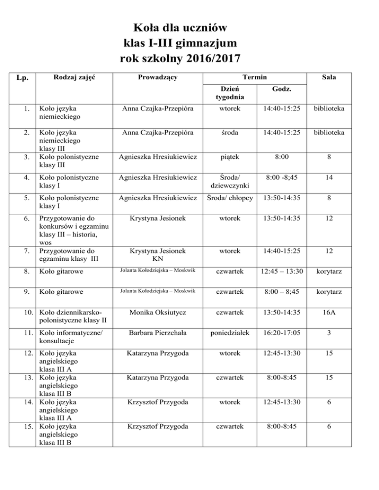 Koła dla uczniów klas I-III gimnazjum rok szkolny 2016/2017 Lp. Rodzaj zajęć Prowadzący Termin Sala Dzień tygodnia Godz. 1. Koło języka niemieckiego Anna Czajka-Przepióra wtorek 14:40-15:25 biblioteka 2. Koło języka niemieckiego klasy III Koło polonistyczne klasy III Anna Czajka-Przepióra środa 14:40-15:25 biblioteka Agnieszka Hresiukiewicz piątek 8:00 8 3. 4. Koło polonistyczne klasy I Agnieszka Hresiukiewicz Środa/ dziewczynki 8:00 -8;45 14 5. Koło polonistyczne klasy I Agnieszka Hresiukiewicz Środa/ chłopcy 13:50-14:35 8 6. Przygotowanie do konkursów i egzaminu klasy III – historia, wos Przygotowanie do egzaminu klasy III Krystyna Jesionek wtorek 13:50-14:35 12 Krystyna Jesionek KN wtorek 14:40-15:25 12 7. 8. Koło gitarowe Jolanta Kołodziejska – Moskwik czwartek 12:45 – 13:30 korytarz 9. Koło gitarowe Jolanta Kołodziejska – Moskwik czwartek 8:00 – 8;45 korytarz 10. Koło dziennikarskopolonistyczne klasy II Monika Oksiutycz czwartek 13:50-14:35 16A 11. Koło informatyczne/ konsultacje Barbara Pierzchała poniedziałek 16:20-17:05 3 12. Koło języka angielskiego klasa III A 13. Koło języka angielskiego klasa III B 14. Koło języka angielskiego klasa III A 15. Koło języka angielskiego klasa III B Katarzyna Przygoda wtorek 12:45-13:30 15 Katarzyna Przygoda czwartek 8:00-8:45 15 Krzysztof Przygoda wtorek 12:45-13:30 6 Krzysztof Przygoda czwartek 8:00-8:45 6 16. Koło ekologiczne Teresa Rothimmel sobota 12:00-13:30 7 17. Koło fizyczne klasy III „Zajmująca fizyka” Małgorzata Rygier – Jaworska środa 13:50 10 18. Koło fizyczne klasy II „W pogoni za Einsteinem” 19. Koło matematyczne klasy III Małgorzata Rygier – Jaworska sobota 9:30-11:00 10 Małgorzata Michalska wtorek 14:40-15:25 10 20. Koło matematyczne klasa III Małgorzata Michalska piątek 8:00-8:45 14 21. Koło matematyczne klasy II Marzena Jaszewska Środa 14.40-15.25 13 22. Zajęcia szachowe Dariusz Różycki środa 17:00-18:00 stołówka 23. Zajęcia szachowe - od IV kategorii Filip Bargłowski Mistrz Federacji środa 17:00-18:00 9 24. Zajęcia szachowe - od III kategorii i wyżej Filip Bargłowski Mistrz Federacji środa 18:00-19:00 9 Jose Maria Rodriguez czwartek 14.40-15.25 15 25. Koło języka hiszpańskiego