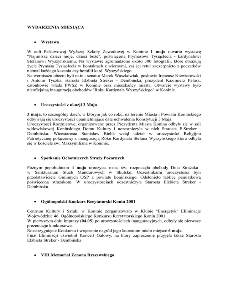 WYDARZENIA MIESIĄCA Wystawa W auli Państwowej Wyższej Szkoły Zawodowej w Koninie 1 maja otwarto wystawę "Najmilsze dzieci moje, dzieci boże", poświęconą Prymasowi Tysiąclecia - kardynałowi Stefanowi Wyszyńskiemu. Na wystawie zgromadzono około 300 fotografii, które obrazują życie Prymasa Tysiąclecia w kontaktach z wiernymi, zaś jej tytuł zaczerpnięto z początków niemal każdego kazania czy homilii kard. Wyszyńskiego. Na wernisażu obecni byli m.in.: senator Marek Waszkowiak, posłowie Ireneusz Niewiarowski i Antonii Tyczka, starosta Elzbieta Streker - Dembińska, prezydent Kazimierz Pałasz, członkowie władz PWSZ w Koninie oraz mieszkańcy miasta. Otwarcie wystawy było nieoficjalną inauguracją obchodów "Roku Kardynała Wyszyńskiego" w Koninie. Uroczystości z okazji 3 Maja 3 maja, to szczególny dzień, w którym jak co roku, na terenie Miasta i Powiatu Konińskiego odbywają się uroczystości upamiętniające datę uchwalenia Konstytucji 3 Maja. Uroczystości Rocznicowe, organizowane przez Prezydenta Miasta Konina odbyły się w sali widowiskowej Konińskiego Domu Kultury i uczestniczyła w nich Starosta E.Streker Dembińska. Wicestarosta Stanisław Bielik wziął udział w uroczystości Religijno Patriotycznej połączonej z inauguracją Roku Kardynała Stefana Wyszyńskiego która odbyła się w kościele św. Maksymiliana w Koninie. Spotkanie Ochotniczych Straży Pożarnych Późnym popołudniem 4 maja uroczysta msza św. rozpoczęła obchody Dnia Strażaka w Sanktuarium Służb Mundurowych w Skulsku. Uczestnikami uroczystości byli przedstawiciele Gminnych OSP z powiatu konińskiego. Odsłonięto tablicę pamiątkową poświęconą strażakom. W uroczystościach uczestniczyła Starosta Elżbieta Streker Dembińska. Ogólnopolski Konkurs Recytatorski Konin 2001 Centrum Kultury i Sztuki w Koninie zorganizowało w Klubie "Energetyk" Eliminacje Wojewódzkie 46. Ogólnopolskiego Konkursu Recytatorskiego Konin 2001. W pierwszym dniu imprezy (04.05) po uroczystościach inauguracyjnych, odbyły się pierwsze prezentacje konkursowe. Rozstrzygnięcie Konkursu i wręczenie nagród jego laureatom miało miejsce 6 maja. Finał Eliminacji uświetnił Koncert Galowy, na który zaproszenie przyjęła także Starosta Elżbieta Streker - Dembińska. VIII Memoriał Zenona Ryszewskiego W dniu 5 maja br. odbył się VIII Memoriał Zenona Ryszewskiego Puchar Polski Kobiet i Mężczyzn w Szabli. Stoczono wiele zaciętych pojedynków i tak najlepszymi okazali się Maciej Tomczak i Arkadiusz Nowinowski z Konińskiego Klubu Szermierszego, którzy w pięknym stylu pokonali w finale swoich rywali z AZS AWF Katowice. W szabli kobiet zwyciężyła zawodniczka Klubu Sportowego Warszawianka , najlepsza koninianka Katarzyna Kuźniak uplasowała się na 3 miejscu. W Turnieju uczestniczyli szacowni goście parlamentarzyści konińscy, samorządowcy oraz przedsiębiorcy. Pojedynkom szermierczym przyglądały się: Starosta Koniński Elżbieta Streker-Dembińska oraz Członek Zarządu Powiatu Konińskiego Barbara Szeflińska , które za szczególne zasługi dla konińskiej szermierki otrzymały pamiątkowe szable. Wspaniałe Jubileusze 20 - lecie działalności estradowej obchodził Zespół Ludowy "Wielopolanki" z Kramska. W uroczystościach jubileuszowych uczestniczył Radny Powiatu Konińskiego Henryk Nowak. Orkiestra Dęta Ochotniczej Straży Pożarnej w Kazimierzu Biskupim obchodziła 90 - lecie. Z tej okazji Starosta Koniński Elżbieta Streker - Dembińska przekazała na ręce kapelmistrza podziękowania za kreowanie wizerunku kulturowego regionu. Wójt gminy Janusz Puszkarek przekazał orkiestrze nowe instrumenty. Uroczystość uświetnił wspaniały koncert i spotkanie kilku pokoleń muzyków. Roztańczone dzieciaki W dniu 6 maja br. w Konińskim Domu Kultury odbył się Międzypowiatowy Przegląd Dziecięcych i Młodzieżowych Zespołów Tanecznych. Na scenie zaprezentowało się wiele zespołów w różnych stylach tanecznych począwszy od ludowych do form najbardziej nowoczesnych. Nagrodę ufundowaną przez Starostwo Powiatowe w Koninie dla najlepszego zespołu , którym okazał się Zespół "RYTMIX 1" z KDK wręczyła osobiście Pani Starosta Elżbieta StrekerDembińska. Szkolenie i doskonalenie W siedzibie Starostwa 8 maja odbyło się seminarium nt. "Praktyczne stosowanie instrukcji kancelaryjnej ze szczególnym uwzględnieniem sporządzania pism urzędowych". Celem szkolenia było dostosowanie warsztatów pracy pracowników administracji do obowiązujących europejskich zasad i norm w tym zakresie. Program szkolenia przewidywał następujące tematy: "Rola instrukcji kancelaryjnej w bieżącej pracy urzędu", "Omówienie podstawowych czynności kancelaryjnych", "Przyjmowanie i rozdział korespondencji". W szkoleniu obecni będą naczelnicy Wydziałów Starostwa oraz dyrektorzy jednostek organizacyjnych podległych Starostwu. Wznowiono po latach..... Reforma administracyjna kraju spowodowała przejecie przez jednostki samorządu terytorialnego zadań z zakresu oświaty, a tym samym rozpoczętych przez poprzednie organy prowadzące inwestycji. Powiat koniński przejął rozpoczętą w dniu 6 grudnia 1996 r. przez Ministerstwo Rolnictwa i Gospodarki Żywnościowej budowę kompleksu sportowo-dydaktycznego w Zespole Szkół Ekonomiczno -Usługowych w Żychlinie. Ze względu na towarzyszące prowadzeniu tego zadania trudności finansowe Starostwo Powiatowe w Koninie wielokrotnie występowało o pozyskanie środków ze wszystkich możliwych źródeł, zwracając szczególną uwagę na fakt, że będzie to jedyna sala gimnastyczna na terenie gminy Stare Miasto. Długotrwałe zabiegi o finanse oraz zrealizowanie trudnych zadań organizacyjno - technicznych doprowadziło do wznowienia inwestycji. W dniu 8 maja 2001 r. o godz. 11.00 odbyło się uroczyste rozpoczęcie przerwanych na dwa lata prac inwestycyjnych. W uroczystościach udział wzięła Barbara Szeflińska - członek Zarz
