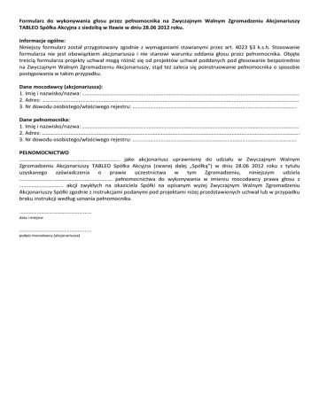 Formularz do wykonywania głosu przez pełnomocnika na Zwyczajnym Walnym Zgromadzeniu Akcjonariuszy TABLEO Spółka Akcyjna z siedzibą w Iławie w dniu 28.06 2012 roku. Informacje ogólne: Niniejszy formularz został przygotowany zgodnie z wymaganiami stawianymi przez art. 4023 §3 k.s.h. Stosowanie formularza nie jest obowiązkiem akcjonariusza i nie stanowi warunku oddania głosu przez pełnomocnika. Objęte treścią formularza projekty uchwał mogą różnić się od projektów uchwał poddanych pod głosowanie bezpośrednio na Zwyczajnym Walnym Zgromadzeniu Akcjonariuszy, stąd też zaleca się poinstruowanie pełnomocnika o sposobie postępowania w takim przypadku. Dane mocodawcy (akcjonariusza): 1. Imię i nazwisko/nazwa: ……………………………………………………………………………………………………………………………………………. 2. Adres: ………………………..……………………………………………………………………………………………………………………………………………. 3. Nr dowodu osobistego/właściwego rejestru: …………………………………………………………………………………………………………. Dane pełnomocnika: 1. Imię i nazwisko/nazwa: …………………………………………………………………………………………………….……………………………………… 2. Adres: ………………………………………………………………………………………………………………………………………………………………………. 3. Nr dowodu osobistego/właściwego rejestru: …………………………………………………………………………………………………………. PEŁNOMOCNICTWO ……………………………………………………………….. jako akcjonariusz uprawniony do udziału w Zwyczajnym Walnym Zgromadzeniu Akcjonariuszy TABLEO Spółka Akcyjna (zwanej dalej „Spółką”) w dniu 28.06 2012 roku z tytułu uzyskanego zaświadczenia o prawie uczestnictwa w tym Zgromadzeniu, niniejszym udziela ……….……………………..………………………….. pełnomocnictwa do wykonywania w imieniu mocodawcy prawa głosu z ………………..………... akcji zwykłych na okaziciela Spółki na opisanym wyżej Zwyczajnym Walnym Zgromadzeniu Akcjonariuszy Spółki zgodnie z instrukcjami podanymi pod projektami niżej przedstawionych uchwał lub w przypadku braku instrukcji według uznania pełnomocnika. .……………………………….…………… data i miejsce ……..……………………………………… podpis mocodawcy (akcjonariusza) Uchwała nr 1 Zwyczajnego Walnego Zgromadzenia Akcjonariuszy TABLEO S.A. z siedzibą w Iławie z dnia 28 czerwca 2012 roku w sprawie: wyboru Przewodniczącego Zgromadzenia Zwyczajne Walne Zgromadzenie Akcjonariuszy TABLEO S.A. z siedzibą w Iławie na podstawie art. 409 §1 Kodeksu spółek handlowych wybiera na Przewodniczącego Zgromadzenia odbywającego się w dniu 28 czerwca 2012 roku Pana _________________. [ ] ZA ODDANIE GŁOSU W SPRAWIE UCHWAŁY [ ] PRZECIW [ ] WSTRZYMUJĘ SIĘ [ ] ZGŁOSZENIE SPRZECIWU W przypadku głosowania przeciw uchwale nr 1 z dnia 28 czerwca 2012 roku, akcjonariusz może poniżej wyrazić sprzeciw z wnioskiem o wpisanie do protokołu. Treść sprzeciwu:……………………………………………………………………………………………....……………………….…………………………………. ……………………………………………………………………………………………………………………………………………………………………….……………. Treść instrukcji dotyczącej głosowania przez pełnomocnika w sprawie uchwały nr 1 z dnia 28.06.2012 roku: ………………..……..……………………………………………………………………………………………………………………………………………………………. …………………………………………………………………………………………………………………………………………………………………………………….. Uchwała nr 2 Zwyczajnego Walnego Zgromadzenia Akcjonariuszy TABLEO S.A. z siedzibą w Iławie z dnia 28 czerwca 2012 roku w sprawie: przyjęcia porządku obrad Zwyczajne Walne Zgromadzenie Akcjonariuszy TABLEO S.A. z siedzibą w Iławie przyjmuje porządek obrad w brzmieniu: Proponowany porządek obrad: 1. Otwarcie obrad. 2. Wybór Przewodniczącego Zgromadzenia. 3. Stwierdzenie prawidłowości zwołania Zwyczajnego Walnego Zgromadzenia. 4. Wybór Komisji Skrutacyjnej. 5. Przedstawienie przez Prezesa Zarządu „Sprawozdania z działalności w roku obrotowy 2011”. 6. Przedstawienie przez Zarząd „Sprawozdania finansowego za rok obrotowy 2011” 7. Przedstawienie przez Przewodniczącego Rady Nadzorczej „Sprawozdania Rady Nadzorczej z działalności w roku obrotowym 2011” 8. Podjęcie uchwał dotyczących: a. Zatwierdzenia sprawozdania Zarządu z działalności Spółki za rok obrotowy 2011, b. Zatwierdzenia sprawozdania finansowego za rok obrotowy 2011, c. Pokrycia straty za rok obrotowy 2011, d. Zatwierdzenia sprawozdania Rady Nadzorczej z działalności w roku obrotowym 2011, e. Udzielenia absolutorium dla Zarządu za rok obrotowy 2011, f. Udzielenia absolutorium dla członków Rady Nadzorczej za rok obrotowy 2011, 9. Wolne głosy i wnioski. 10. Zamknięcie obrad. [ ] ZA ODDANIE GŁOSU W SPRAWIE UCHWAŁY [ ] PRZECIW [ ] WSTRZYMUJĘ SIĘ [ ] ZGŁOSZENIE SPRZECIWU W przypadku głosowania przeciw uchwale nr 2 z dnia 28 czerwca 2012 roku, akcjonariusz może poniżej wyrazić sprzeciw z wnioskiem o wpisanie do protokołu. Treść sprzeciwu:………………………………………