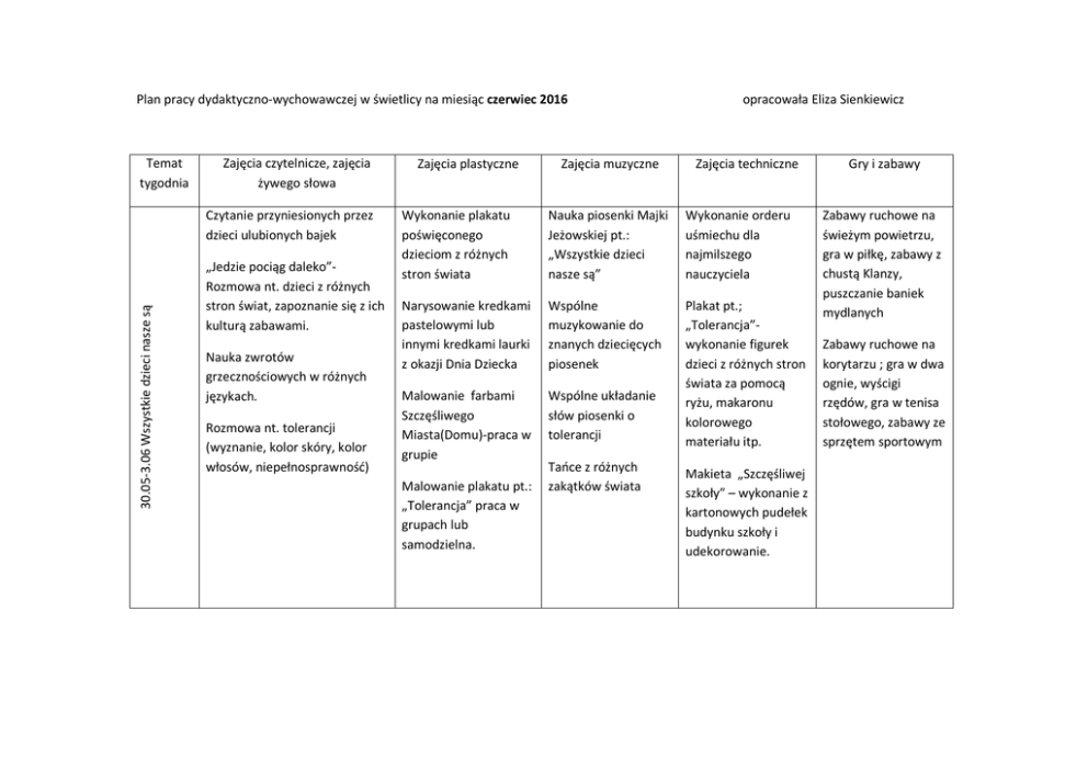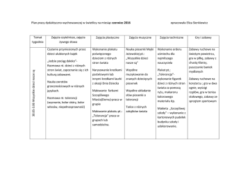 Plan pracy dydaktyczno-wychowawczej w świetlicy na miesiąc czerwiec 2016 Temat tygodnia Zajęcia czytelnicze, zajęcia żywego słowa 30.05-3.06 Wszystkie dzieci nasze są Czytanie przyniesionych przez dzieci ulubionych bajek „Jedzie pociąg daleko”Rozmowa nt. dzieci z różnych stron świat, zapoznanie się z ich kulturą zabawami. Nauka zwrotów grzecznościowych w różnych językach. Rozmowa nt. tolerancji (wyznanie, kolor skóry, kolor włosów, niepełnosprawność) Zajęcia plastyczne Zajęcia muzyczne opracowała Eliza Sienkiewicz Zajęcia techniczne Wykonanie plakatu poświęconego dzieciom z różnych stron świata Nauka piosenki Majki Jeżowskiej pt.: „Wszystkie dzieci nasze są” Wykonanie orderu uśmiechu dla najmilszego nauczyciela Narysowanie kredkami pastelowymi lub innymi kredkami laurki z okazji Dnia Dziecka Wspólne muzykowanie do znanych dziecięcych piosenek Malowanie farbami Szczęśliwego Miasta(Domu)-praca w grupie Wspólne układanie słów piosenki o tolerancji Plakat pt.; „Tolerancja”wykonanie figurek dzieci z różnych stron świata za pomocą ryżu, makaronu kolorowego materiału itp. Malowanie plakatu pt.: „Tolerancja” praca w grupach lub samodzielna. Tańce z różnych zakątków świata Makieta „Szczęśliwej szkoły” – wykonanie z kartonowych pudełek budynku szkoły i udekorowanie. Gry i zabawy Zabawy ruchowe na świeżym powietrzu, gra w piłkę, zabawy z chustą Klanzy, puszczanie baniek mydlanych Zabawy ruchowe na korytarzu ; gra w dwa ognie, wyścigi rzędów, gra w tenisa stołowego, zabawy ze sprzętem sportowym Plan pracy dydaktyczno-wychowawczej w świetlicy na miesiąc czerwiec 2016 Temat tygodnia Zajęcia czytelnicze, zajęcia żywego słowa 6-10.06 W świecie dziecięcych zabaw Czytanie Książki Daniela Defoe „Robinson Crusoe”początek wielkiej morskiej przygody. Tajemnice morskich głębin-rozmowa na podstawie różnych albumów o tematyce morskiej. Zabawa w piratów Słuchanie legend związanych z Pomorzem Oglądanie Filmów animowanych pt.: „Byli sobie podróżnicy „W co się bawić kiedy nie ma prądu i pada deszcz? 365 pomysłów na zabawy-burza mózgów. Zajęcia plastyczne Malowanie kawą nadmorskiego pejzażu. Malowanie butelek Farbami do szkła. „Co się kryje w zimnych morzach”-rysowanie kredkami akwarelowymi Malowanie palcami na folii malarskiej Malowanie stopamipraca zespołowa Zajęcia muzyczne Zajęcia relaksacyjne przy muzyce- „ Szum morza” Zabawy pantomimiczne przy piosenkach marynarskich -„Szanty” Zabawa w ”Mam talent” Zabawy integracyjne przy muzyce. opracowała Eliza Sienkiewicz Zajęcia techniczne Gry i zabawy Wykonanie zabawki metodą origami. Zabawy z chustą Klanzy. Wykonanie zabawki z butelki po napoju. Zabawy ruchowe na placu zabaw Szyjemy Przytulankikolorowe materiały, kordonek, guziki. Zabawy z folią malarską Zagadki i rebusy Zabawy i gry ruchowe na boisku szkolnym Plan pracy dydaktyczno-wychowawczej w świetlicy na miesiąc czerwiec 2016 13-17.06 Podróże małe i duże Temat Tygodnia Zajęcia czytelniczeŻywego słowa Rozmowy kierowane na temat wakacji, wakacyjnych wyjazdów, sposobów spędzania wakacji nad morzem, jeziorem, w górach, w mieście. Rozmowy kierowane na temat bezpiecznego spędzania czasu w świetlicy, na placu zabaw, podczas wakacji. Czytanie dzieciom bajek, opowiadań w ramach akcji „Cała Polska czyta dzieciom". Rozmowa z panią policjant na temat bezpieczeństwa w czasie wakacji a szczególnie nad wodą. opracowała Eliza Sienkiewicz Zajęcia plastyczne Zajęcia muzyczne Zajęcia techniczne Gry i zabawy Rysowanie mapy polski – Najciekawsze miejsca. Zajęcia taneczne przy muzyce - pląsy, tańce. „Tuż za rogiem”wspomnienia z rowerowych wycieczek. Malowanie farbami akwarelowymi. Słuchanie opowiadań z płyt CD. „Żaglówka na tle zachodzącego słońca" – wydzieranka z kolorowego papieru. Zabawy na świeżym powietrzu z wykorzystaniem sprzętu świetlicowego. „Statek na morzu” – wydzieranka z bibuły kolorowej. Rozwiązywanie zagadek i krzyżówek tematycznych. Wykonanie kolorowej papeterii. Zabawy na holu przy sali, zajęcia sportoworuchowe. „Afryka o zachodzie słońca”-pastele olejne i akwarela. Nauka piosenki pt. „Lato , lato ,lato czeka” Czym podróżujemy? Wycięcie od szablonu pojazdów i kolorowanie ich w kolorach flag różnych państw. Zajęcia na boisku szkolnym. Plan pracy dydaktyczno-wychowawczej w świetlicy na miesiąc czerwiec 2016 20-24.06 Bezpieczne wakacje. Zakończenie roku szkolnego Temat tygodnia Zajęcia czytelnicze, zajęcia żywego słowa Zajęcia plastyczne Rozmowy związane z zagrożeniami, jakie czyhają na dzieci podczas wakacji. Moje wymarzone wakacjerysunek suchymi i olejowymi pastelami. Pogadanka zaproszonego policjanta ze specjalnej jednostki Policji Wodnej. Namalowanie akwarelami widokówki Warszawy. Jaki był miniony rok szkolny? Rozmowa nt. nauki nowych kolegów, nauczycieli. Jak spędzę wakacje?Rozmowa z dziećmi gdzie pojadę lub gdzie chciałbym pojechać na wakacje. „Franklin jedzie na wakacje”-co zabrać ze sobą na kolonie obóz czy wczasy Wakacje w domu -zalety i wady Rysunek Funkcjonariusza Policji Wodnej Zajęcia muzyczne opracowała Eliza Sienkiewicz Zajęcia techniczne Nauka piosenki pt.; „Niech żyją wakacje”. Wykonanie znaczków odblaskowych. Nauka piosenki zespołu Fasolki pt. ”Plecak torba i walizka.”: Wykonanie papeterii własnego pomysłu. Śpiewnik na wyprawywykonanie kolorowej książeczki na wakacyjne piosenki. Mapa Polski –ciekawe miejsca do zwiedzaniawykonanie za pomocą wycinków z czasopism przyrodniczych mapy, planu wakacji. Kodeks bezpiecznej zabawy podczas wakacji –komiks Gry i zabawy Propozycje zabaw na pochmurne dni: zabawy na łonie natury ;- pod namiotem;- na plaży itd. Zabawy ruchowe na placu zabaw Zabawy na korytarzugra w dwa ognie, wyścigi rzędów, z użyciem sprzętu sportowego. Zagadki rebusy i krzyżówki zgodne z tematem tygod