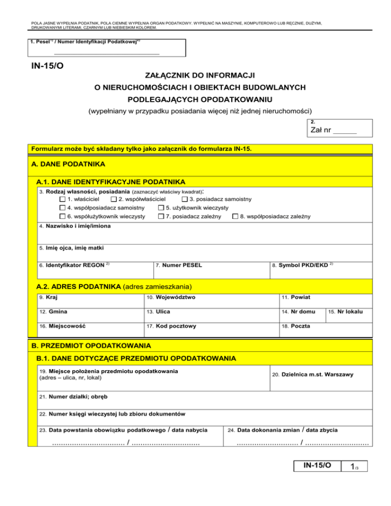 POLA JASNE WYPEŁNIA PODATNIK, POLA CIEMNE WYPEŁNIA ORGAN PODATKOWY. WYPEŁNIĆ NA MASZYNIE, KOMPUTEROWO LUB RĘCZNIE, DUŻYMI, DRUKOWANYMI LITERAMI, CZARNYM LUB NIEBIESKIM KOLOREM. 1. Pesel1) / Numer Identyfikacji Podatkowej2) ¯¯¯¯¯¯¯¯¯¯¯¯¯¯¯¯¯¯¯¯¯¯¯¯¯¯¯¯¯¯¯¯¯¯¯¯¯¯¯¯¯¯¯¯¯¯¯¯¯¯¯¯¯¯¯¯¯¯ IN-15/O ZAŁĄCZNIK DO INFORMACJI O NIERUCHOMOŚCIACH I OBIEKTACH BUDOWLANYCH PODLEGAJĄCYCH OPODATKOWANIU (wypełniany w przypadku posiadania więcej niż jednej nieruchomości) 2. popo Zał nr ¯¯¯¯¯¯¯¯¯¯¯¯¯ Formularz może być składany tylko jako załącznik do formularza IN-15. A. DANE PODATNIKA A.1. DANE IDENTYFIKACYJNE PODATNIKA 3. Rodzaj własności, posiadania (zaznaczyć właściwy kwadrat): 1. właściciel 2. współwłaściciel 3. posiadacz samoistny 4. współposiadacz samoistny 5. użytkownik wieczysty 6. współużytkownik wieczysty 7. posiadacz zależny 8. współposiadacz zależny 4. Nazwisko i imię/imiona 5. Imię ojca, imię matki 6. Identyfikator REGON 2) 7. Numer PESEL 8. Symbol PKD/EKD 2) A.2. ADRES PODATNIKA (adres zamieszkania) 9. Kraj 10. Województwo 11. Powiat 12. Gmina 13. Ulica 14. Nr domu 16. Miejscowość 17. Kod pocztowy 18. Poczta 15. Nr lokalu B. PRZEDMIOT OPODATKOWANIA B.1. DANE DOTYCZĄCE PRZEDMIOTU OPODATKOWANIA 19. Miejsce położenia przedmiotu opodatkowania (adres – ulica, nr, lokal) 20. Dzielnica m.st. Warszawy 21. Numer działki; obręb 22. Numer księgi wieczystej lub zbioru dokumentów 23. Data powstania obowiązku podatkowego / data nabycia ................................. / ............................... 24. Data dokonania zmian / data zbycia ............................ / ............................. IN-15/O 1/3 POLA JASNE WYPEŁNIA PODATNIK, POLA CIEMNE WYPEŁNIA ORGAN PODATKOWY. WYPEŁNIĆ NA MASZYNIE, KOMPUTEROWO LUB RĘCZNIE, DUŻYMI, DRUKOWANYMI LITERAMI, CZARNYM LUB NIEBIESKIM KOLOREM. Wyszczególnienie Podstawa opodatkowania B.1.1. GRUNTY 1. związane z prowadzeniem działalności gospodarczej, bez względu na sposób zakwalifikowania w ewidencji gruntów i budynków 25. Powierzchnia ................................. m2 2. pod wodami powierzchniowymi stojącymi lub wodami powierzchniowymi płynącymi jezior i zbiorników sztucznych 26. Powierzchnia 3. pozostałe, w tym zajęte na prowadzenie odpłatnej statutowej działalności pożytku publicznego przez organizacje pożytku publicznego 27. Powierzchnia ................................. ha ................................. m2 4. niezabudowane objęte obszarem rewitalizacji, o którym mowa w ustawie z dnia 9 października 2015 r. o rewitalizacji (Dz. U. poz. 1777), i położone na terenach, dla których miejscowy plan zagospodarowania przestrzennego przewiduje przeznaczenie pod zabudowę mieszkaniową, usługową albo zabudowę o przeznaczeniu mieszanym obejmującym wyłącznie te rodzaje zabudowy, jeżeli od dnia wejścia w życie tego planu w odniesieniu do tych gruntów upłynął okres 4 lat, a w tym czasie nie zakończono budowy zgodnie z przepisami prawa budowlanego 28. Powierzchnia ................................. m2 B.1.2. BUDYNKI LUB ICH CZĘŚCI 1. mieszkalne 50% powierzchni użytkowej pomieszczeń o wysokości od 1.40m do 2.20m 29. powierzchnia użytkowa pomieszczeń o wysokości powyżej 2.20m 30. …………..……….m2 …………..……….m2 31. RAZEM …………..……….m2 2. związane z prowadzeniem działalności gospodarczej oraz budynki mieszkalne lub ich części, zajęte na prowadzenie działalności gospodarczej 50% powierzchni użytkowej pomieszczeń o wysokości od 1.40m do 2.20m 32. powierzchnia użytkowa pomieszczeń o wysokości powyżej 2.20m 33. …………..……….m2 …………..……….m2 34. RAZEM …………..……….m2 3. zajęte na prowadzenie działalności gospodarczej w zakresie obrotu kwalifikowanym materiałem siewnym 50% powierzchni użytkowej pomieszczeń o wysokości od 1.40m do 2.20m 35. powierzchnia użytkowa pomieszczeń o wysokości powyżej 2.20m 36. …………..……….m2 …………..……….m2 37. RAZEM …………..……….m2 4. związane z udzielaniem świadczeń zdrowotnych w rozumieniu przepisów o działalności leczniczej, zajęte przez podmioty udzielające tych świadczeń o powierzchni użytkowej do 2.000 m2 50% powierzchni użytkowej pomieszczeń o wysokości od 1.40m do 2.20m 38. powierzchnia użytkowa pomieszczeń o wysokości powyżej 2.20m 39. …………..……….m2 …………..……….m2 40. RAZEM …………..……….m2 5. związane z udzielaniem świadczeń zdrowotnych w rozumieniu przepisów o działalności leczniczej, zajęte przez podmioty udzielające tych świadczeń o powierzchni użytkowej powyżej 2.000 m2 50% powierzchni użytkowej pomieszczeń o wysokości od 1.40m do 2.20m powierzchnia użytkowa pomieszczeń o wysokości powyżej 2.20m 41. …………..……….m2 42. …………..……….m2 43. RAZEM …………..……….m2 IN-15/O 2/3 POLA JASNE WYPEŁNIA PODATNIK, POLA CIEMNE WYPEŁNIA ORGAN PODATKOWY. WYPEŁNIĆ NA MASZYNIE, KOMPUTEROWO LUB RĘCZNIE, DUŻYMI, DRUKOWANYMI LITERAMI, CZARNYM LUB NIEBIESKIM KOLOREM. 6. pozostałe, w tym zajęte na prowadzenie odpłatnej statutowej działalności pożytku publicznego przez organizacje pożytku publicznego 50% powierzchni użytkowej pomieszczeń o wysokości od 1.40m do 2.20m powierzchnia użytkowa pomieszczeń o wysokości powyżej 2.20m 44. …………..……….m2 45. …………..……….m2 46. RAZEM …………..……….m2 B.1.3. BUDOWLE budowle wartość określona na podstawie art.4 ust.1 pkt 3 i ust.3-7 ustawy o podatkach i opłatach lokalnych (podstawa opodatkowania w zł z dokładnością do 1 zł) 47. …………..……….zł C. ADNOTACJE ORGANU PODATKOWEGO Uwagi organu podatkowego OBJAŚNIENIA 1. 2. Wypełnia osoba fizyczna nie będąca przedsiębiorcą. Wypełnia osoba fizyczna będąca przedsiębiorcą. IN-15/O 3/3