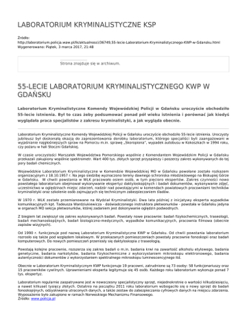 LABORATORIUM KRYMINALISTYCZNE KSP Źródło: http://laboratorium.policja.waw.pl/lk/aktualnosci/36749,55-lecie-Laboratorium-Kryminalistycznego-KWP-w-Gdansku.html Wygenerowano: Piątek, 3 marca 2017, 21:48 Strona znajduje się w archiwum. 55-LECIE LABORATORIUM KRYMINALISTYCZNEGO KWP W GDAŃSKU Laboratorium Kryminalistyczne Komendy Wojewódzkiej Policji w Gdańsku uroczyście obchodziło 55-lecie istnienia. Był to czas żeby podsumować ponad pół wieku istnienia i porównać jak kiedyś wyglądała praca specjalistów z zakresu kryminalistyki, a jak wygląda obecnie. Laboratorium Kryminalistyczne Komendy Wojewódzkiej Policji w Gdańsku uroczyście obchodziło 55-lecie istnienia. Uroczysty jubileusz był doskonałą okazją do zaprezentowania dorobku laboratorium, którego specjaliści byli zaangażowani w wyjaśnianie najgłośniejszych spraw na Pomorzu m.in. sprawę „Skoropiona”, wypadek autobusu w Kokoszkach w 1994 roku, czy pożaru w hali Stoczni Gdańskiej. W czasie uroczystości Marszałek Województwa Pomorskiego wspólnie z Komendantem Wojewódzkim Policji w Gdańsku przekazali zakupiony wspólnie spektrometr. Wart 400 tys. złotych sprzęt przyspieszy i poszerzy zakres wykonywanych do tej pory badań chemicznych. Wojewódzkie Laboratorium Kryminalistyczne w Komendzie Wojewódzkiej MO w Gdańsku powołane zostało rozkazem organizacyjnym z 18.10.1957 r. Na jego siedzibę wyznaczono tereny dawnego schroniska młodzieżowego na Biskupiej Górze w Gdańsku. W chwili powstania w WLK pracowało osiem osób, w tym pięcioro ekspertów. Zakres czynności nowo powstałego laboratorium obejmował wykonywanie ekspertyz daktyloskopijnych i badań dokumentów, wykonywanie zdjęć, uczestnictwo w oględzinach miejsc zdarzeń, nadzór nad powstającymi w komendach powiatowych pracowniami techników kryminalistyki oraz szkolenie osób zajmujących się technicznym zabezpieczaniem śladów. W 1970 r. WLK zostało przemianowane na Wydział Kryminalistyki. Dwa lata później z inicjatywy eksperta wypadków komunikacyjnych kpt. Tadeusza Wardziukiewicza - doświadczonego instruktora płetwonurków - powstała w Gdańsku jedyna w organach MO sekcja płetwonurków, której zadaniem jest dokonywanie oględzin podwodnych. Z biegiem lat zwiększył się zakres wykonywanych badań. Powstały nowe pracownie: badań fizykochemicznych, traseologii, badań mechanoskopijnych, badań biologiczno-medycznych, wypadków komunikacyjnych, pracownia filmowa (obecnie zapisów wizyjnych). Od 1990 r. funkcjonuje pod nazwą Laboratorium Kryminalistyczne KWP w Gdańsku. Od chwili powstania laboratorium rozrosło się także pod względem lokalowym. W przekazanych pomieszczeniach powstały pracownie fonoskopii oraz badań komputerowych. Do nowych pomieszczeń przeniosły się daktyloskopia z traseologią. Powstają kolejne pracownie, rozszerza się zakres badań o m.in. badania krwi na zawartość alkoholu etylowego, badania genetyczne, badania narkotyków, badania fizykochemiczne z wykorzystaniem mikroskopu elektronowego, badania autentyczności dokumentów z wykorzystaniem spektralnego mikroskopu luminescencyjnego itd. Obecnie w Laboratorium Kryminalistycznym KWP funkcjonuje 19 pracowni, zatrudnione są 73 osoby: 58 funkcjonariuszy oraz 15 pracowników cywilnych. Uprawnieniami eksperta legitymuje się 45 osób. Każdego roku laboratorium wykonuje ponad 7 tys. ekspertyz. Laboratorium regularnie zaopatrywane jest w nowoczesny specjalistyczny sprzęt, niejednokrotnie o wartości kilkudziesięciu, a nawet kilkuset tysięcy złotych. Ostatnio na początku 2011 roku laboratorium wzbogaciło się o nowy sprzęt do badań fonoskopijnych, odzyskiwania utraconych danych, a także zestaw do zabezpieczania cyfrowych danych na miejscu zdarzenia. Wyposażenie było zakupione w ramach Norweskiego Mechanizmu Finansowego. Źródło: www.policja.pl Ocena: 0/5 (0) Tweetnij