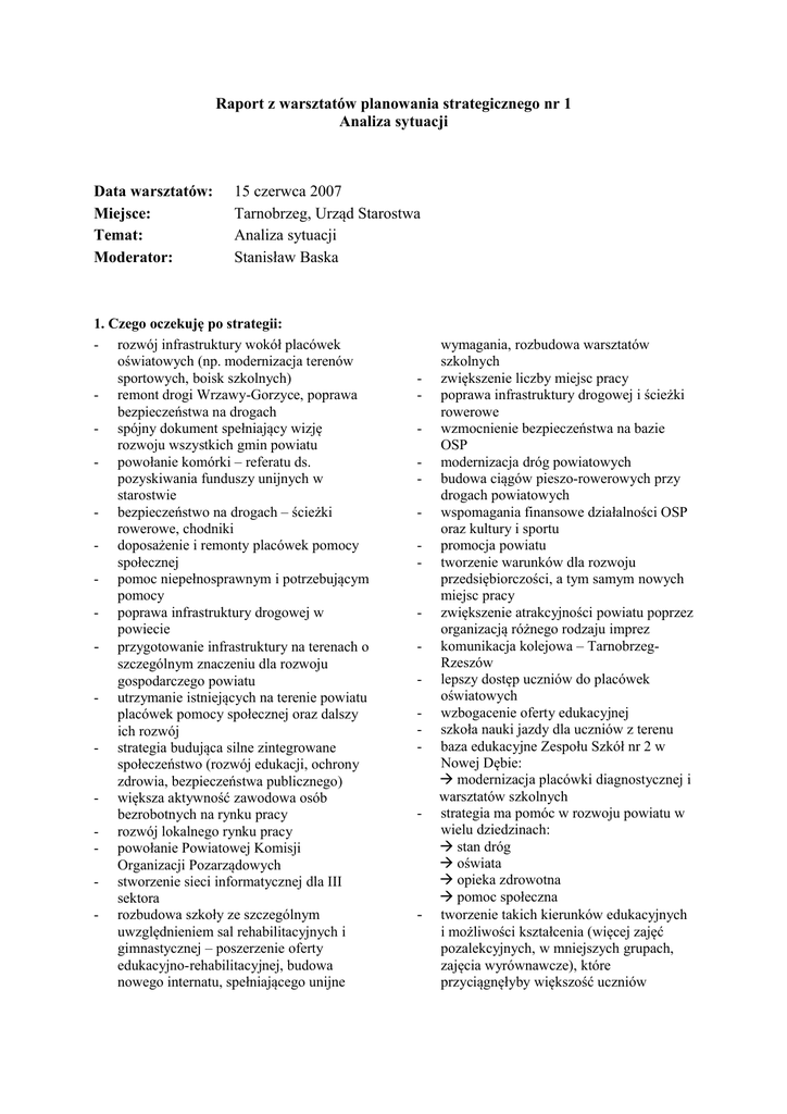 Raport z warsztatów planowania strategicznego nr 1 Analiza