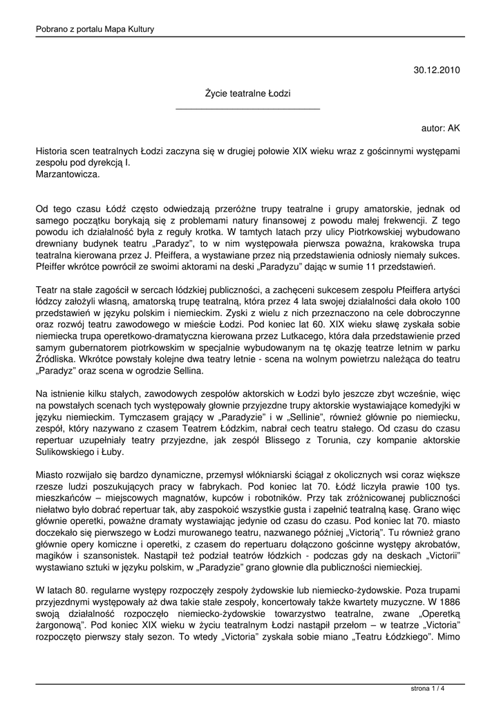 Pobrano z portalu Mapa Kultury 30.12.2010 Życie teatralne Łodzi ____________________________ autor: AK Historia scen teatralnych Łodzi zaczyna się w drugiej połowie XIX wieku wraz z gościnnymi występami zespołu pod dyrekcją I. Marzantowicza. Od tego czasu Łódź często odwiedzają przeróżne trupy teatralne i grupy amatorskie, jednak od samego początku borykają się z problemami natury finansowej z powodu małej frekwencji. Z tego powodu ich działalność była z reguły krotka. W tamtych latach przy ulicy Piotrkowskiej wybudowano drewniany budynek teatru „Paradyz”, to w nim występowała pierwsza poważna, krakowska trupa teatralna kierowana przez J. Pfeiffera, a wystawiane przez nią przedstawienia odniosły niemały sukces. Pfeiffer wkrótce powrócił ze swoimi aktorami na deski „Paradyzu” dając w sumie 11 przedstawień. Teatr na stałe zagościł w sercach łódzkiej publiczności, a zachęceni sukcesem zespołu Pfeiffera artyści łódzcy założyli własną, amatorską trupę teatralną, która przez 4 lata swojej działalności dała około 100 przedstawień w języku polskim i niemieckim. Zyski z wielu z nich przeznaczono na cele dobroczynne oraz rozwój teatru zawodowego w mieście Łodzi. Pod koniec lat 60. XIX wieku sławę zyskała sobie niemiecka trupa operetkowo-dramatyczna kierowana przez Lutkacego, która dała przedstawienie przed samym gubernatorem piotrkowskim w specjalnie wybudowanym na tę okazję teatrze letnim w parku Źródliska. Wkrótce powstały kolejne dwa teatry letnie - scena na wolnym powietrzu należąca do teatru „Paradyz” oraz scena w ogrodzie Sellina. Na istnienie kilku stałych, zawodowych zespołów aktorskich w Łodzi było jeszcze zbyt wcześnie, więc na powstałych scenach tych występowały głownie przyjezdne trupy aktorskie wystawiające komedyjki w języku niemieckim. Tymczasem grający w „Paradyzie” i w „Sellinie”, również głównie po niemiecku, zespół, który nazywano z czasem Teatrem Łódzkim, nabrał cech teatru stałego. Od czasu do czasu repertuar uzupełniały teatry przyjezdne, jak zespół Blissego z Torunia, czy kompanie aktorskie Sulikowskiego i Łuby. Miasto rozwijało się bardzo dynamiczne, przemysł włókniarski ściągał z okolicznych wsi coraz większe rzesze ludzi poszukujących pracy w fabrykach. Pod koniec lat 70. Łódź liczyła prawie 100 tys. mieszkańców – miejscowych magnatów, kupców i robotników. Przy tak zróżnicowanej publiczności niełatwo było dobrać repertuar tak, aby zaspokoić wszystkie gusta i zapełnić teatralną kasę. Grano więc głównie operetki, poważne dramaty wystawiając jedynie od czasu do czasu. Pod koniec lat 70. miasto doczekało się pierwszego w Łodzi murowanego teatru, nazwanego później „Victorią”. Tu również grano głównie opery komiczne i operetki, z czasem do repertuaru dołączono gościnne występy akrobatów, magików i szansonistek. Nastąpił też podział teatrów łódzkich - podczas gdy na deskach „Victorii” wystawiano sztuki w języku polskim, w „Paradyzie” grano głownie dla publiczności niemieckiej. W latach 80. regularne występy rozpoczęły zespoły żydowskie lub niemiecko-żydowskie. Poza trupami przyjezdnymi występowały aż dwa takie stałe zespoły, koncertowały także kwartety muzyczne. W 1886 swoją działalność rozpoczęło niemiecko-żydowskie towarzystwo teatralne, zwane „Operetką żargonową”. Pod koniec XIX wieku w życiu teatralnym Łodzi nastąpił przełom – w teatrze „Victoria” rozpoczęto pierwszy stały sezon. To wtedy „Victoria” zyskała sobie miano „Teatru Łódzkiego”. Mimo strona 1 / 4 Pobrano z portalu Mapa Kultury oznak stabilizacji oraz paru premierowych sukcesów teatr nadal borykał się z problemami finansowymi i słabą frekwencją, a kolejni dyrektorzy zmieniali się jak w kalejdoskopie. W roku 1903 stanowisko dyrektora „Victorii” objął M. Gawalewicz, publicysta i dramaturg. W tym samym roku powstało i opiekę nad teatrem objęło Łódzkie Polskie Towarzystwo Teatralne. Trudności finansowe towarzyszyły jednak teatrowi zawsze, mimo to oprócz popularnych przedstawień dla robotników wystawiano również sztuki o tematyce patriotyczno-społecznej. W 1909 roku pożar strawił budynek „Victorii”, a w 1911 spłonął inny teatr - Teatr Polski. Do 1913 roku aktorzy grywali na Nowej Scenie, zwanej również Teatrem Popularnym, poważnym, ale dostępnym dla wszystkich. Od roku 1915 wystawiano repertuar narodowy, wcześniej zakazany przez carską cenzurę, na deskach teatru pojawiły się takie sztuki jak „Kościuszko pod Racławicami” czy „Gwiazda Syberii”. W roku 1916 do odnowionego Teatru Polskiego przybył jego nowy kierownik literacki Bolesław Leśmian, który w Łodzi chciał kontynuować eksperymenty z własną ideą teatru stylizowanego oraz z metodą aktorską K.S. Stanisławskiego. Stałe sceny łódzkie – życie teatralne dziś Dziś życie teatralne w Łodzi kwitnie. Kilka stałych teatrów, zróżnicowany repertuar i liczne festiwale sprawiają, że każdy znajdzie coś dla siebie, a na widowni zasiadają już nie tylko łodzianie, ale widzowie z całej Polski, którzy przybywają tu specjalnie z okazji konkretnego przedstawienia czy wydarzenia kulturalnego. Poza najstarszym teatrem łódzkim, Teatrem im. St. Jaracza, przekształconym z założonego w 1888 roku Teatru Polskiego,większość stałych scen powstała w drugiej połowie XX wieku. Na deskach Teatru im. St. Jaracza wystawiano zawsze repertuar ambitny – sztuki autorstwa Wyspiańskiego, Mickiewicza, Słowackiego czy Krasińskiego. Od roku 1995 działają w nim trzy sceny, a w ramach Programu Tworzenia Scen Europejskich utworzono nowe sceny w Sieradzu, Skierniewicach, Piotrkowie Trybunalskim i Radomsku. W sezonie 2008/09 teatr obchodził 120-lecie swojej działalności. Z tej okazji zaplanowano uroczyste premiery, wystawy i sesje naukowe. W latach 40. powsta