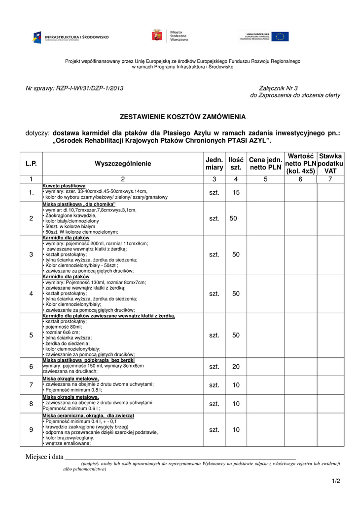 Projekt współfinansowany przez Unię Europejską ze środków Europejskiego Funduszu Rozwoju Regionalnego w ramach Programu Infrastruktura i Środowisko Nr sprawy: RZP-I-WI/31/DZP-1/2013 Załącznik Nr 3 do Zaproszenia do złożenia oferty ZESTAWIENIE KOSZTÓW ZAMÓWIENIA dotyczy: dostawa karmideł dla ptaków dla Ptasiego Azylu w ramach zadania inwestycyjnego pn.: „Ośrodek Rehabilitacji Krajowych Ptaków Chronionych PTASI AZYL”. L.P. 1 1. 2 3 4 5 6 Wyszczególnienie 2 Kuweta plastikowa • wymiary: szer. 33-40cmxdł.45-50cmxwys.14cm, • kolor do wyboru czarny/beżowy/ zielony/ szary/granatowy Miska plastikowa „dla chomika" • wymiar: dł.10,7cmxszer.7,8cmxwys.3,1cm, • Zaokrąglone krawędzie, • kolor biały/ciemnozielony • 50szt. w kolorze białym • 50szt. W kolorze ciemnozielonym; Karmidło dla ptaków • wymiary: pojemność 200ml, rozmiar 11cmx9cm; • zawieszane wewnątrz klatki z żerdką; • kształt prostokątny; • tylna ścianka wyższa, żerdka do siedzenia; • Kolor ciemnozielony/biały - 50szt ; • zawieszane za pomocą giętych drucików; Karmidło dla ptaków • wymiary: Pojemność 130ml, rozmiar 8cmx7cm; • zawieszane wewnątrz klatki z żerdką; • kształt prostokątny; • tylna ścianka wyższa, żerdka do siedzenia; • Kolor ciemnozielony/biały; • zawieszanie za pomocą giętych drucików; Karmidło dla ptaków zawieszane wewnątrz klatki z żerdką, • kształt prostokątny; • pojemność 80ml; • rozmiar 6x6 cm; • tylna ścianka wyższa; • żerdka do siedzenia; • kolor ciemnozielony/biały; • zawieszanie za pomocą giętych drucików; Miska plastikowa półokrągła bez żerdki wymiary: pojemność 150 ml, wymiary 8cmx6cm zawieszana na drucikach; Wartość Stawka Jedn. Ilość Cena jedn. netto PLN podatku miary szt. netto PLN (kol. 4x5) VAT 3 4 5 6 7 szt. szt. 15 50 szt. 50 szt. 50 szt. 50 szt. 20 7 Miska okrągła metalowa, • zawieszana na obejmie z drutu dwoma uchwytami; • Pojemność minimum 0,8 l; szt. 10 8 Miska okrągła metalowa, • zawieszana na obejmie z drutu dwoma uchwytami Pojemność minimum 0.6 l ; szt. 10 9 Miska ceramiczna, okrągła, dla zwierząt • Pojemność minimum 0.4 l, + - 0,1 • krawędzie zaokrąglone (wygięty brzeg) • odporna na przewracanie dzięki szerokiej podstawie, • kolor brązowy/ceglany, • wnętrze emaliowane; szt. 10 Miejsce i data __________________________________________________________________________________ (podpis/y osoby lub osób uprawnionych do reprezentowania Wykonawcy na podstawie odpisu z właściwego rejestru lub ewidencji albo pełnomocnictwa) 1/2 Nr sprawy: RZP-I-WI/31/DZP-1/2013 Załącznik Nr 3 do Zaproszenia do złożenia oferty RAZEM NETTO ……………...……… KWOTA PODATKU VAT ……………………… RAZEM BRUTTO ………………...……. x x x Miejsce i data ____________________________________________________________________________________ (podpis/y osoby lub osób uprawnionych do reprezentowania Wykonawcy na podstawie odpisu z właściwego rejestru lub ewidencji albo pełnomocnictwa) 2/2