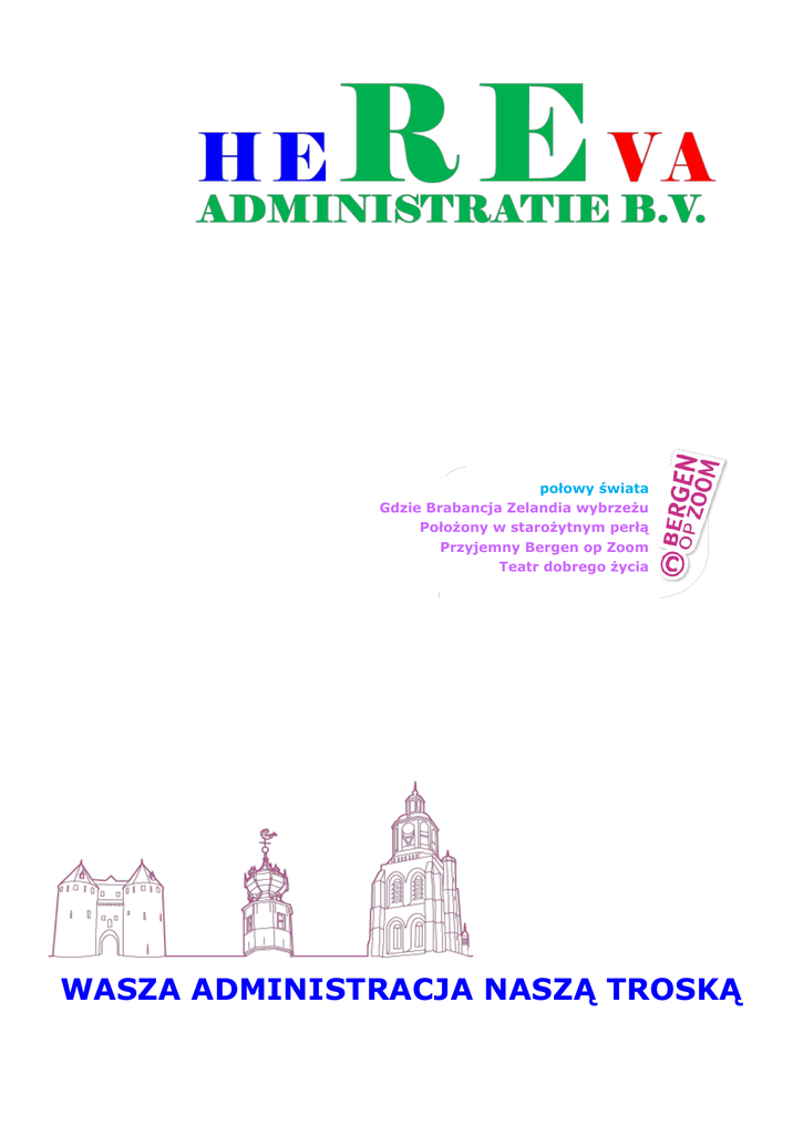 połowy świata Gdzie Brabancja Zelandia wybrzeżu Położony w starożytnym perłą Przyjemny Bergen op Zoom Teatr dobrego życia WASZA ADMINISTRACJA NASZĄ TROSKĄ W czym możemy być Państwu pomocni Treść Blz. Kim jesteśmy 2 Nasza wizja 2 Co robimy dla Państwa 2 Nasza misja 3 Niektóre z naszych referencji 4 Nasze metody pracy 5 Nasze usługi 6 Opłaty 7 Ogólne warunki 9 Polityka Prywatności 12 Izba Gospodarcza HEREVA Doradztwo B.V. 13 Izba Gospodarcza HEREVA Administracja B.V. 15 Dane administracji podatkowej HEREVA B.V. 17 Zatwierdzony przez konstrukcji podatku 19 Dane kontaktowe 25 Informacja odnośnie formularza zgłoszeniowego 26 Uwagi 27 1 Kim jesteśmy Jesteśmy elastyczną firmą z siedzibą i korzeniami w Bergen op Zoom. Naszą specjalnością jest towarzyszenie początkującym przedsiębiorstwom i prowadzenie administracji dla przedsiębiorstw. Naszym terenem działania jest Holandia i Belgia Nasza wizja To aby wspólnie z naszymi klientami określić czego potrzebują, aby ich przedsiębiorstwo było prowadzone skutecznie i zyskownie. Jesteśmy więc dla początkującego przedsiębiorstwa czymś w rodzaju wyroczni i regulujemy wiele istotnych spraw tak aby je prowadzący mogli w pełni skupić się na swojej pracy. Co robimy dla Państwa Wspólnie z naszymi klientami obmyślamy sposoby spełnienia przedkładanych przez nich żądań. Respektujemy zawarte umowy z naszymi klientami. Dbamy o to, aby administracja naszych klientów była zawsze na bieżąco prowadzona. Dążymy do tego, aby nasi klienci mogli spokojnie i z zaufaniem zostawić nam troskę o ich administrację. 2 MISJA Jest zapewnienie kompleksowego pakietu administracyjnego . Rozwiązujemy problemy z naszej pracy dla firmy. To mam nadzieję, że ku zadowoleniu naszych klientów. Dzięki nam możesz prowadzić firmę w rzeczy, które są silne . My Ci żmudne prace (administracja ) z rąk , dzięki czemu można skupić się na rzeczach , które są silne . Wspólnie przyjrzymy się coAdministracyjnego Potrzeby i możliwości dla Twojej Firmy być . Nasz wspólny wysiłek powinno mieć znaczenia powoduje się w końcu lat ceny jest trzymany i że cała Administracja odbywa się prawidłowo . Nasza praca nie kończy się tylko Uruchom swoją administrację , ale także doradztwo zarówno gospodarczej ( inwestycje ) lub prywatne ( mortgage ) jest częścią nasza misja . Nasze w pełni wykwalifikowani ludzie czekają , aby podjąć . O swoich obawach Administracji tobą Wszystkie pytania ( jak szalony w oczy zbyt może) będzie odpowiedzi z jakości , jak to możliwe bezpośrednio i inaczej w ciągu 24 godzin . 3 Enkele van onze referenties SKOWRON Renovatie VOF 4 Nasze metody pracy W następstwie wizyty zapoznawczej, która oczywiście jest niezobowiązująca i gratisowa, chcemy Państwa zaznajomić z naszymi różnymi metodami pracy, zależnymi od Państwa życzeń. Poniżej przedstawiamy szereg przykładów stosowanych w pracach dla naszego obecnego kręgu klientów. Przykład 1. Miesięcznie opracowujemy Państwa dane w naszej administracji. Następnie otrzymujecie od nas aktualny rezultat i sprawozdanie bilansowe i inne dokumenty jak na przykład zeznania podatku obrotowego i dochodowego. W ten sposób jesteście Państwo zawsze na bieżąco odnośnie aktualnych danych Waszego przedsiębiorstwa. Na końcu roku kalendarzowego będą sporządzone roczne sprawozdania jak i zeznanie/a podatkowe podatku dochodowego i/lub podatku spółki. Oczywiście możemy przejąć również inne zadania od Państwa jak na przykład fakturowanie Waszych klientów. Przykład 2. W tym przypadku prowadzicie Państwo swoją administrację częściowo sami. Może się to odbywać za pomocą opracowanej przez nas aplikacji “Spreadsheet” (arkusz kalkulacyjny), który udostępniamy za darmo. Miesięcznie wysyłacie do nas mailowo zaksięgowane przez Was dane. Zostaną one skontrolowane i ewentualnie skorygowane. Następnie dane te zostaną zaimportowane do Waszej finansowej administracji. Sposób ten może zapewnić znaczną zniżkę naszych standardowych stawek, ponieważ oszczędza nam wiele pracy związanej z wprowadzaniem danych. Następnie zostanie sporządzone zeznanie podatkowe podatku obrotowego. Na końcu roku kalendarzowego opracowujemy sprawozdania roczne i zeznanie/a podatku dochodowego i/lub podatku spółki. Niezależnie od tego czy prowadzimy Waszą administrację finansową czy też nie, możecie Państwo zlecić nam również prowadzenie administracji płac. Otrzymacie od nas cyfrowo miesięczne odcinki wypłat, które możecie wydrukować na własnym papierze firmowym. Dostarczenie odcinków wypłat na papierze jest też możliwe. Jednocześnie otrzymacie listę płac netto. Sporządzimy dla Państwa zestawienie zwrotu podatku od dochodu i wyślemy je elektronicznie do Urzędu Podatkowego. Nawet jeżeli będziecie Państwo prowadzić swoją administrację sami, a jedynie przekażecie nam prowadzenie administracji płac, otrzymacie od nas także przejrzysty wydruk zapisów księgowych koniecznych do zaksięgowania na każdy okres. Będziecie je musieli jedynie przejąć w Waszej księgowości. Również odnośnie fiskalnych spraw, w celu zapobiegnięcia przykrym niespodziankom, jesteśmy do Państwa dyspozycji. Jest rzeczą oczywistą, że możemy Państwu doradzić i pomóc, abyście nie płacili większego podatku, niż jest to absolutnie konieczne. I tutaj punktem wyjściowym, jest nasze przekonanie, że zawsze łatwiej jest zapobiegać niż leczyć. Wszystkie istotne informacje, które zbieraliśmy latami są przez nas opracowane we wspólnym akcie fiskalnym. I jeżeli Urząd Podatkowy zjawi się u Was w celu kontroli ksiąg, będziecie w każdym razie dobrze do tego przygotowani. To zapewnia spokój i uniknięcie niepotrzebnych kosztów. I nawet gdyby powstała dyskusja z Urzędem Podatkowym, macie Państwo w nas partnera, któremu nieobce jest prowadzenie procedury zastrzeżeń i odwołani. Oczywiście m