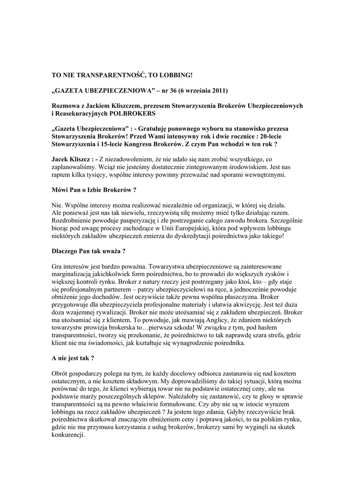 721,(75$163$5(1712ĝû72/2%%,1* Ä*$=(7$8%(=3,(&=(1,2:$´±QUZU]HĞQLD 5R]PRZD]-DFNLHP.OLV]F]HPSUH]HVHP6WRZDU]\V]HQLD%URNHUyZ8EH]SLHF]HQLRZ\FK L5HDVHNXUDF\MQ\FK32/%52.(56 Ä*D]HWD8EH]SLHF]HQLRZD´*UDWXOXMĊSRQRZQHJRZ\ERUXQDVWDQRZLVNRSUH]HVD 6WRZDU]\V]HQLD%URNHUyZ3U]HG:DPLLQWHQV\ZQ\URNLGZLHURF]QLFHOHFLH 6WRZDU]\V]HQLDLOHFLH.RQJUHVX%URNHUyZ=F]\P3DQZFKRG]LZWHQURN" -DFHN.OLV]F]=QLH]DGRZROHQLHPĪHQLHXGDáRVLĊQDP]URELüZV]\VWNLHJRFR ]DSODQRZDOLĞP\:FLąĪQLHMHVWHĞP\GRVWDWHF]QLH]LQWHJURZDQ\PĞURGRZLVNLHP-HVWQDV UDSWHPNLONDW\VLĊF\ZVSyOQHLQWHUHV\SRZLQQ\SU]HZDĪDüQDGVSRUDPLZHZQĊWU]Q\PL 0yZL3DQR,]ELH%URNHUyZ" 1LH:VSyOQHLQWHUHV\PRĪQDUHDOL]RZDüQLH]DOHĪQLHRGRUJDQL]DFMLZNWyUHMVLĊG]LDáD $OHSRQLHZDĪMHVWQDVWDNQLHZLHOXU]HF]\ZLVWąVLáĊPRĪHP\PLHüW\ONRG]LDáDMąFUD]HP 5R]GUREQLHQLHSRZRGXMHSDXSHU\]DFMĊL]áHSRVWU]HJDQLHFDáHJR]DZRGXEURNHUD6]F]HJyOQLH ELRUąFSRGXZDJĊSURFHV\]DFKRG]ąFHZ8QLL(XURSHMVNLHMNWyUDSRGZSá\ZHPOREELQJX QLHNWyU\FK]DNáDGyZXEH]SLHF]HĔ]PLHU]DGRG\VNUHG\WDFMLSRĞUHGQLFWZDMDNRWDNLHJR 'ODF]HJR3DQWDNXZDĪD" *UDLQWHUHVyZMHVWEDUG]RSRZDĪQD7RZDU]\VWZDXEH]SLHF]HQLRZHVą]DLQWHUHVRZDQH PDUJLQDOL]DFMąMDNLFKNROZLHNIRUPSRĞUHGQLFWZDERWRSURZDG]LGRZLĊNV]\FK]\VNyZL ZLĊNV]HMNRQWUROLU\QNX%URNHU]QDWXU\U]HF]\MHVWSRVWU]HJDQ\MDNRNWRĞNWR±JG\VWDMH VLĊSURIHVMRQDOQ\PSDUWQHUHP±SDWU]\XEH]SLHF]\FLHORZLQDUĊFHDMHGQRF]HĞQLHSRZRGXMH REQLĪHQLHMHJRGRFKRGyZ-HVWRF]\ZLĞFLHWDNĪHSHZQDZVSyOQDSáDV]F]\]QD%URNHU SU]\JRWRZXMHGODXEH]SLHF]\FLHODSURIHVMRQDOQHPDWHULDá\LXáDWZLDDNZL]\FMĊ-HVWWHĪGXĪD GR]DZ]DMHPQHMU\ZDOL]DFML%URNHUQLHPRĪHXWRĪVDPLDüVLĊ]]DNáDGHPXEH]SLHF]HĔ%URNHU PDXWRĪVDPLDüVLĊ]NOLHQWHP7RSRZRGXMHMDNPDZLDMą$QJOLF\ĪH]GDQLHPQLHNWyU\FK WRZDU]\VWZSURZL]MDEURNHUVNDWR«SLHUZV]DV]NRGD:]ZLą]NX]W\PSRGKDVáHP WUDQVSDUHQWQRĞFLWZRU]\VLĊSU]HNRQDQLHĪHSRĞUHGQLFWZRWRWDNQDSUDZGĊV]DUDVWUHIDJG]LH NOLHQWQLHPDĞZLDGRPRĞFLMDNNV]WDáWXMHVLĊZ\QDJURG]HQLHSRĞUHGQLND $QLHMHVWWDN" 2EUyWJRVSRGDUF]\SROHJDQDW\PĪHNDĪG\GRFHORZ\RGELRUFD]DVWDQDZLDVLĊQDGNRV]WHP RVWDWHF]Q\PDQLHNRV]WHPVNáDGRZ\P0\GRSURZDG]LOLĞP\GRWDNLHMV\WXDFMLNWyUąPRĪQD SRUyZQDüGRWHJRĪHNOLHQFLZ\ELHUDMąWRZDUQLHQDSRGVWDZLHRVWDWHF]QHMFHQ\DOHQD SRGVWDZLHPDUĪ\SRV]F]HJyOQ\FKVNOHSyZ1DOHĪDáRE\VLĊ]DVWDQRZLüF]\WHJáRV\ZVSUDZLH WUDQVSDUHQWQRĞFLVąQDSHZQRZáDĞFLZLHIRUPXáRZDQH&]\DE\QLHVąZLVWRFLHZ\UD]HP OREELQJXQDU]HF]]DNáDGyZXEH]SLHF]HĔ"-DMHVWHPWHJR]GDQLD*G\E\U]HF]\ZLĞFLHEUDN SRĞUHGQLFWZDVNXWNRZDá]QDF]ąF\PREQLĪHQLHPFHQ\LSRSUDZąMDNRĞFLWRQDSROVNLPU\QNX JG]LHQLHPDSU]\PXVXNRU]\VWDQLD]XVáXJEURNHUyZEURNHU]\VDPLE\Z\JLQĊOLQDVNXWHN NRQNXUHQFML 5yĪQLFDPLĊG]\EURNHUHPDDJHQWHPF]\PXOWLDJHQWHPMHVWWDNDĪHEURNHUSRQRVL RGSRZLHG]LDOQRĞü]DVNXWNLVZRMHJRGRUDG]WZD-HJRUHNRPHQGDFMDRIHUW\GDQHJR XEH]SLHF]\FLHODPXVLE\üSLVHPQD1LHZ\REUDĪDPVRELHĪHE\EURNHUPyJáVLĊZW\P SU]\SDGNXNLHURZDüZ\VRNRĞFLąSURZL]ML0XOWLDJHQWZVND]XMHUR]ZLą]DQLDDOHQLH RGSRZLDGD]DQLH0RĪHVLĊZLĊFNLHURZDüZ\VRNRĞFLąVZRLFKNRU]\ĞFL&LNWyU]\ QDMJáRĞQLHMNU]\F]ąRWUDQVSDUHQWQRĞFLVDPLMHMXQLNDMąQLHXGRVWĊSQLDMąFNOLHQWRPWDU\I 7U]HEDMHV]F]HSDPLĊWDüĪHNOLHQWNRU]\VWDMąF\]XVáXJEURNHUDRWU]\PXMHGRGDWNRZą RFKURQĊZSRVWDFLSROLV\2&EURNHUD-DNZ\FHQLüWĊRFKURQĊ" :DUW\NXOHÄĝPLHUüSURZL]ML´0LURVáDZ.RZDOVNLSLVDáZÄ*D]HFLH8EH]SLHF]HQLRZHM´ ]VLHUSQLDEURSURNRQVXPHQFNLPZ\PLDU]HWUDQVSDUHQWQRĞFLZ\QDJURG]HĔ SRĞUHGQLNyZ 1DGPLHUQHSURNRQVXPHQFNLHUR]ZLą]DQLDG]LDáDMąDQW\NRQVXPHQFNR/XG]LHSRZLQQL PLHüMDNQDMZLĊNV]HPRĪOLZRĞFLVDPRG]LHOQHJRGHF\GRZDQLDRVRELHEH]XG]LDáX ]HZQĊWU]Q\FKRUJDQyZ:HĨP\SU]\NáDGRERZLą]NRZ\FKXEH]SLHF]HĔUROQLF]\FK :\NRQDQLHWHJRRERZLą]NXSRNDWDVWURIDFKMHVWZHU\ILNRZDQHSU]H]ZF]HĞQLHMV]\ VSRVyEZ\FHQ\QLHUXFKRPRĞFL,OHWDNQDSUDZGĊGRVWDMHUROQLNSRNOĊVFHĪ\ZLRáRZHM" 1DGPLHUQDSURNRQVXPHQFNRĞü]D]Z\F]DMMHVWZ\UD]HPOREELQJXRNUHĞORQHMJUXS\R RNUHĞORQ\PLQWHUHVLH3DPLĊWDMP\RW\P1DGPLHUQDRFKURQDNRQVXPHQWDSRZRGXMHMHJR XEH]ZáDVQRZROQLHQLH=F]áRZLHNDĞZLDGRPHJRSRGHMPXMąFHJROXEQLHRNUHĞORQHU\]\ND WZRU]\VLĊNRJRĞNWRVS\FKDZV]\VWNRQDLQQ\FK 3DĔVWZRQLHMHVWZVWDQLH]DJZDUDQWRZDüZ\ZLą]\ZDQLDVLĊ]ZáDVQ\FK]RERZLą]DĔ0DP\ V\VWHPRSLHNL]GURZRWQHMLV\VWHPHPHU\WDOQ\NWyU\WDNQDSUDZGĊQLNRPXQLFQLHJZDUDQWXMH LMHVWWRWDOQLHDQW\NRQVXPHQFNL2F]HNLZDQLHĪHSDĔVWZREĊG]LHJZDUDQWRZDüRNUHĞORQ\ SU]HELHJREURWXJRVSRGDUF]HJRMHVWPRLP]GDQLHPQDLZQH -DNLHVąORV\NRQFHSFMLEURNHUDMDNR]DZRGX]DXIDQLDSXEOLF]QHJR" 0\MDNRĞURGRZLVNRSRZLQQLĞP\E\ü]DLQWHUHVRZDQLĪHE\E\ü]DZRGHP]DXIDQLD SXEOLF]QHJR]GZyFKSRZRGyZ3RSLHUZV]HWRE\ZSá\ZDáRQD]HZQĊWU]QHSRVWU]HJDQLH QDV]HMSURIHVML3RGUXJLHZV]\VWNLHSUREOHP\MDNLHQDVWUDSLąPRĪQDE\UR]ZLą]Dü ZHZQĊWU]QLHZUDPDFKSRZV]HFKQHJRVDPRU]ąGX3RZV]HFKQRĞüZ\ZRáXMH]RERZLą]DQLD D]RERZLą]DQLDLVDQNFMHSRZRGXMąLFKSU]HVWU]HJDQLH7RZV]\VWNRSR]ZROLáRE\XQLNQąü FDáHMPDV\SUREOHPyZWDNLFKMDNZLHORĞüSHáQRPRFQLFWZF]\VSRVyESRVWĊSRZDQLDZ V\WXDFMDFKNRQIOLNWRZ\FK:ĞURGRZLVNXEURNHUVNLPZ\VWĊSXMHQDGXĪąVNDOĊFRĞFR PRĪQDQD]ZDüNUDG]LHĪąLQWHOHNWXDOQąSROHJDMąFąQDSU]HMPRZDQLXNOLHQWD]JRWRZ\P SURJUDPHPLF]HUSDQLX]WHJRW\WXáXRNUHĞORQ\FKNRU]\ĞFL:LHOXEURNHUyZQLHU]HWHOQLH LQIRUPXMHNOLHQWyZRVZRLFKSU]HZDJDFKNRQNXUHQF\MQ\FKQLHU]HWHOQLHVLĊUHNODPXMH 3RPDZLDVZRLFKNROHJyZ.RUSRUDF\MQRĞüSRZLQQDE\üFHOHPZV]\VWNLFKEURNHUyZ7RMHVW QDV]FHOQDNROHMQąNDGHQFMĊ6WRZDU]\V]HQLDDOHWU]HEDSDPLĊWDüĪHWRQLHP\]PLHQLDP\ SUDZRDOHXVWDZRGDZFD:LHOH]DOHĪ\RGZ\ERUyZZSDĨG]LHUQLNX0\PRĪHP\MHG\QLH UHNRPHQGRZDüRNUHĞORQHUR]ZLą]DQLD /XG]LHQLHEDUG]RFKFąSRGGDZDüVLĊ]HZQĊWU]Q\PU\JRURP« =DSRPLQDMąĪHVDPLWZRU]\OLE\WHÄU\JRU\´MHĞOLE\]DDQJDĪRZDOLVLĊZG]LDáDOQRĞü VDPRU]ąGX7DNPXV]ąSRGOHJDüÄU\JRURP´QDU]XFRQ\P]]HZQąWU]SU]H]XVWDZRGDZFĊ 7HPDWMHVW]DZLHV]RQ\QDF]DVSU]HGZ\ERUF]\" 1LHZUĊF]SU]HFLZQLH&Dá\F]DVLQWHQV\ZQLHG]LDáDP\ZHZQĊWU]QLHSU]HNRQXMąF QLHSU]HNRQDQ\FK3UDFDVSRáHF]QDZQDV]\PĞURGRZLVNXQLHMHVWQDGPLHUQLHSRSXODUQD &KĊWQLHE\PVWDQąáGRU\ZDOL]DFML]LQQ\PNDQG\GDWHP]PRFQ\P±NRQNXUHQF\MQ\P± SURJUDPHP1DUD]LHQLHPDQLNRJRWDNLHJRàDWZRMHVWNRQWHVWRZDüMHGQRF]HĞQLHQLH SURSRQXMąFQLFRGVLHELHàDWZRNU\W\NRZDüSRP\VáRERZLą]NRZHJRVDPRU]ąGXDOHWUXGQR SU]\MĞüQDVSRWNDQLHZWHMVSUDZLHLSRGMąüPHU\WRU\F]QąSROHPLNĊ%UDNDNW\ZQRĞFLZLąĪH VL