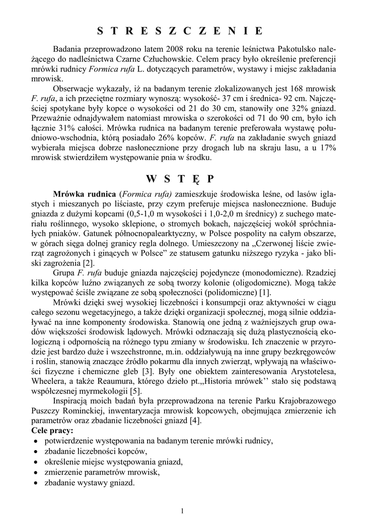 S T R E S Z C Z E N I E Badania przeprowadzono latem 2008 roku na terenie leśnictwa Pakotulsko należącego do nadleśnictwa Czarne Człuchowskie. Celem pracy było określenie preferencji mrówki rudnicy Formica rufa L. dotyczących parametrów, wystawy i miejsc zakładania mrowisk. Obserwacje wykazały, iż na badanym terenie zlokalizowanych jest 168 mrowisk F. rufa, a ich przeciętne rozmiary wynoszą: wysokość- 37 cm i średnica- 92 cm. Najczęściej spotykane były kopce o wysokości od 21 do 30 cm, stanowiły one 32% gniazd. Przeważnie odnajdywałem natomiast mrowiska o szerokości od 71 do 90 cm, było ich łącznie 31% całości. Mrówka rudnica na badanym terenie preferowała wystawę południowo-wschodnia, którą posiadało 26% kopców. F. rufa na zakładanie swych gniazd wybierała miejsca dobrze nasłonecznione przy drogach lub na skraju lasu, a u 17% mrowisk stwierdziłem występowanie pnia w środku. W S T Ę P Mrówka rudnica (Formica rufa) zamieszkuje środowiska leśne, od lasów iglastych i mieszanych po liściaste, przy czym preferuje miejsca nasłonecznione. Buduje gniazda z dużymi kopcami (0,5-1,0 m wysokości i 1,0-2,0 m średnicy) z suchego materiału roślinnego, wysoko sklepione, o stromych bokach, najczęściej wokół spróchniałych pniaków. Gatunek północnopalearktyczny, w Polsce pospolity na całym obszarze, w górach sięga dolnej granicy regla dolnego. Umieszczony na „Czerwonej liście zwierząt zagrożonych i ginących w Polsce” ze statusem gatunku niższego ryzyka - jako bliski zagrożenia [2]. Grupa F. rufa buduje gniazda najczęściej pojedyncze (monodomiczne). Rzadziej kilka kopców luźno związanych ze sobą tworzy kolonie (oligodomiczne). Mogą także występować ściśle związane ze sobą społeczności (polidomiczne) [1]. Mrówki dzięki swej wysokiej liczebności i konsumpcji oraz aktywności w ciągu całego sezonu wegetacyjnego, a także dzięki organizacji społecznej, mogą silnie oddziaływać na inne komponenty środowiska. Stanowią one jedną z ważniejszych grup owadów większości środowisk lądowych. Mrówki odznaczają się dużą plastycznością ekologiczną i odpornością na różnego typu zmiany w środowisku. Ich znaczenie w przyrodzie jest bardzo duże i wszechstronne, m.in. oddziaływują na inne grupy bezkręgowców i roślin, stanowią znaczące źródło pokarmu dla innych zwierząt, wpływają na właściwości fizyczne i chemiczne gleb [3]. Były one obiektem zainteresowania Arystotelesa, Wheelera, a także Reaumura, którego dzieło pt.,,Historia mrówek’’ stało się podstawą współczesnej myrmekologii [5]. Inspiracją moich badań była przeprowadzona na terenie Parku Krajobrazowego Puszczy Rominckiej, inwentaryzacja mrowisk kopcowych, obejmująca zmierzenie ich parametrów oraz zbadanie liczebności gniazd [4]. Cele pracy: potwierdzenie występowania na badanym terenie mrówki rudnicy, zbadanie liczebności kopców, określenie miejsc występowania gniazd, zmierzenie parametrów mrowisk, zbadanie wystawy gniazd. 1 M A T E R I A Ł I M E T O D Y Teren badań Badania zostały przeprowadzone na terenie leśnictwa Pakotulsko należącego do nadleśnictwa Czarne Człuchowskie. Jego powierzchnia wynosi 1386,63 ha i jest podzielona na 51 oddziałów. Leśnictwo to składa się głównie z borów świeżych i borów świeżych mieszanych sosnowych lub z przewagą sosny, około 45 ha świeżyny, 15% siedliska stanowią lasy mieszane świeże, lasy świeże oraz lasy wilgotne. Poza tym występują tu buki, dęby, olsy, brzozy oraz graby. Metody pracy Obserwacje prowadzone były od lipca do końca sierpnia na terenie leśnictwa Pakotulsko. Praca polegała na odnalezieniu i określenia położenia mrowisk na badanym terenie, a także zbadaniu ich parametrów oraz wystawy. Do zmierzenia wysokości i szerokości mrowisk skorzystałem z miary oraz długiej listwy, która była umieszczona prostopadle do ziemi przy najbardziej oddalonym od środka końcu kopca (żadne z gniazd nie zostało przy tym uszkodzone). W celu ustalenia wystawy posłużyłem się kompasem, a pomiaru dokonywałem jedynie w słoneczne dni, co umożliwiało określenie kierunku padania największej ilości promieni słonecznych na gniazdo. Do odnajdywania kopców wykorzystałem mapę topograficzną, na której z dużą dokładnością została umieszczona lokalizacja mrowisk. Identyfikację badanego gatunku mrówki dokonywałem przy użyciu ogólnie dostępnego klucza [6] oraz szkła powiększającego. Po określeniu przynależności gatunkowej mrówek, były one odkładane w pobliżu roju. Na mapach czerwonymi kropkami zostały zaznaczone położenia mrowisk. Mapy 1 i 2 przedstawiają oddziały, w których najczęściej znajdowały się kopce mrówki F. rufa. 2 W Y N I K I Na terenie leśnictwa Pakotulsko stwierdziłem obecność 378 mrowisk, z czego mrówka rudnica budowała 168, czyli 44% wszystkich gniazd (rys.1). 44% 56% kopce mrówki rudnicy kopce innych mrówek Rys.1. Procentowy udział kopców mrówki rudnicy (na tle wszystkich odnalezionych mrowisk) na terenie leśnictwa Pakotulsko Przeciętna szerokość mrowiska wynosiła 92 cm, przy wysokość 37 cm (rys. 2). 100 80 cm 60 40 średnica w ysokość 20 0 Rys. 2. Przeciętne parametry kopców mrówki rudnicy na terenie leśnictwa Pakotulsko Stwierdziłem obecność mrowisk osiągających od 11 do 89 cm wysokości. Największy procent posiadały kopce o wysokości od 21 do 30cm. Stanowiły one 1/3 wszystkich odnalezionych gniazd. Liczną grupą były również kopce od 31 do 40 cm, które osiągnęły około 1/4 całości. Najrzadziej spotykano mrowiska F. rufa o wysokości od 61 do 70 cm (rys. 3). 6% 5% 12% 6% [cm] do 20 21-30 31-40 14% 31% 41-50 51-60 61-70 w iększe 26% Rys. 3. Wysokość kopców [cm] mrówki rudnicy na terenie leśnictwa Pakotulsko 3 W leśnictwa Pakotulsko odnalazłem kopce osiągające od 44 do 224 cm szerokości. Największy procent posiadały kopce o średn
