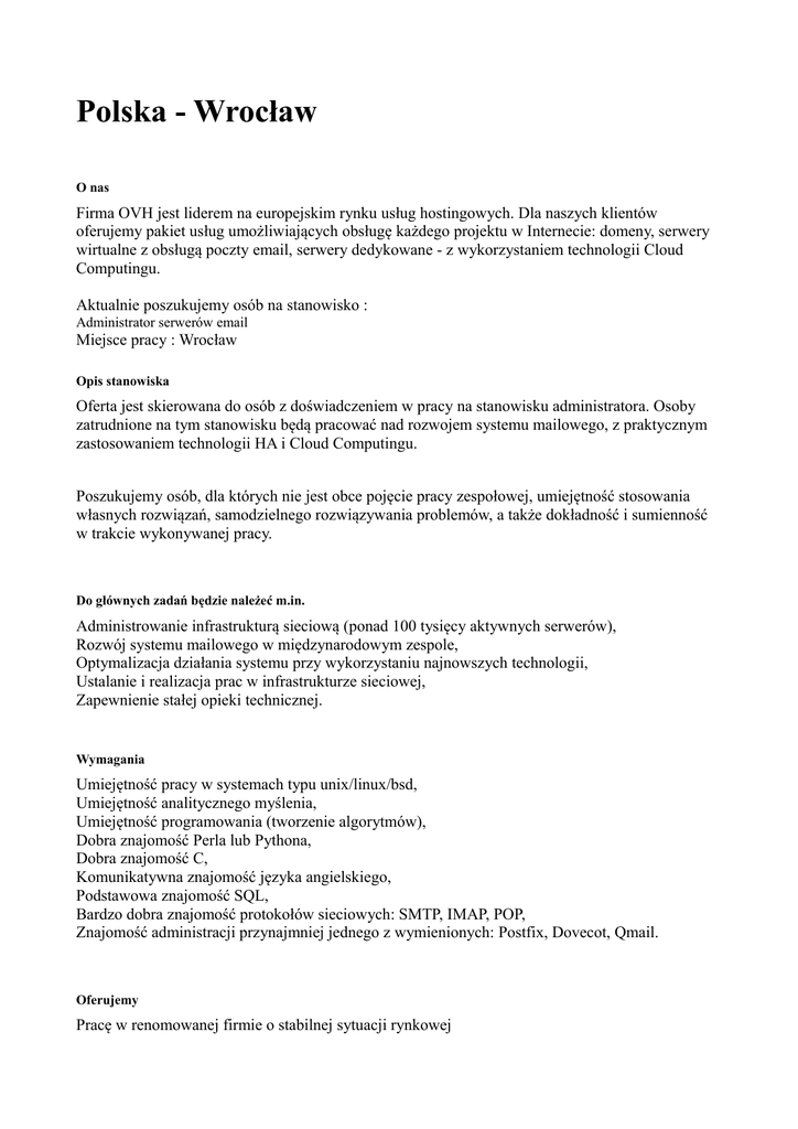 Polska - Wrocław O nas Firma OVH jest liderem na europejskim rynku usług hostingowych. Dla naszych klientów oferujemy pakiet usług umożliwiających obsługę każdego projektu w Internecie: domeny, serwery wirtualne z obsługą poczty email, serwery dedykowane - z wykorzystaniem technologii Cloud Computingu. Aktualnie poszukujemy osób na stanowisko : Administrator serwerów email Miejsce pracy : Wrocław Opis stanowiska Oferta jest skierowana do osób z doświadczeniem w pracy na stanowisku administratora. Osoby zatrudnione na tym stanowisku będą pracować nad rozwojem systemu mailowego, z praktycznym zastosowaniem technologii HA i Cloud Computingu. Poszukujemy osób, dla których nie jest obce pojęcie pracy zespołowej, umiejętność stosowania własnych rozwiązań, samodzielnego rozwiązywania problemów, a także dokładność i sumienność w trakcie wykonywanej pracy. Do głównych zadań będzie należeć m.in. Administrowanie infrastrukturą sieciową (ponad 100 tysięcy aktywnych serwerów), Rozwój systemu mailowego w międzynarodowym zespole, Optymalizacja działania systemu przy wykorzystaniu najnowszych technologii, Ustalanie i realizacja prac w infrastrukturze sieciowej, Zapewnienie stałej opieki technicznej. Wymagania Umiejętność pracy w systemach typu unix/linux/bsd, Umiejętność analitycznego myślenia, Umiejętność programowania (tworzenie algorytmów), Dobra znajomość Perla lub Pythona, Dobra znajomość C, Komunikatywna znajomość języka angielskiego, Podstawowa znajomość SQL, Bardzo dobra znajomość protokołów sieciowych: SMTP, IMAP, POP, Znajomość administracji przynajmniej jednego z wymienionych: Postfix, Dovecot, Qmail. Oferujemy Pracę w renomowanej firmie o stabilnej sytuacji rynkowej Zatrudnienie w oparciu o umowę o pracę Atrakcyjne wynagrodzenie Możliwość wdrażania własnych rozwiązań Udział w różnorodnych projektach Pracę w międzynarodowym zespole Szkolenia wewnętrzne i zewnętrzne Kursy języka angielskiego oraz francuskiego Możliwość rozwoju zawodowego Osoby zainteresowane podjęciem pracy prosimy o przesyłanie CV wyłącznie w formacie pdf (w języku polskim i angielskim) na adres: [email protected]. W temacie wiadomości prosimy o podanie nazwy stanowiska - 'Programista-administrator' wraz z numerem referencyjnym PAD/01/13/4. Dodatkowym atutem będzie przesłanie w treści odkodowanego tekstu 'SSBhbSB2ZXJ5IGx1Y2t5' Prosimy o dopisanie następującej klauzuli: „Wyrażam zgodę na przetwarzanie moich danych osobowych dla potrzeb procesu rekrutacji zgodnie z Ustawą o Ochronie Danych Osobowych z dnia 29.08.97 r.; Dz. Ust. Nr 133 Poz. 833”. Uprzejmie informujemy, że skontaktujemy się z wybranymi kandydatami.