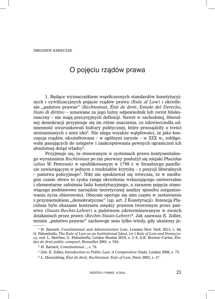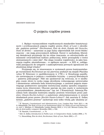 ZBIGNIEW KMIECIAK O pojęciu rządów prawa 1. Będące wyznacznikiem współczesnych standardów konstytucyjnych i cywilizacyjnych pojęcie rządów prawa (Rule of Law) i określenie „państwo prawne” (Rechtsstaat, État de droit, Estado del Derecho, Stato di diritto) – uznawane za jego luźny odpowiednik lub zwrot bliskoznaczny – nie mają precyzyjnych definicji. Nawet w zachodniej, liberalnej demokracji przypisuje się im różne znaczenia, co odzwierciedla odmienność uwarunkowań kultury politycznej, które przesądziły o treści utożsamianych z nimi idei1. Nie ulega wszakże wątpliwości, że jako koncepcja rządów, ukształtowana – w ogólnym zarysie – w XIX w., zobligowała panujących do ustępstw i zaakceptowania pewnych ograniczeń ich absolutnej dotąd władzy2. Przyjmuje się, że stosowanym w systemach prawa kontynentalnego wyrażeniem Rechtsstaat po raz pierwszy posłużył się niejaki Placidus (alias W. Petersen) w opublikowanym w 1798 r. w Strasburgu pamflecie zawierającym w jednym z rozdziałów krytykę – z pozycji liberalnych – państwa policyjnego3. Nikt nie spodziewał się wówczas, że w niedługim czasie słowo to zyska rangę określenia wskazującego uniwersalne i elementarne założenia ładu konstytucyjnego, a zarazem pojęcia stanowiącego podstawowe narzędzie teoretycznej analizy sposobu zorganizowania życia zbiorowości. Obecnie operuje się nim często w zestawieniu z przymiotnikiem „demokratyczne” (np. art. 2 Konstytucji). Intencją Placidusa było ukazanie kontrastu między prawem tworzonym przez państwo (Staats-Rechts-Lehrer) a państwem zdeterminowanym w swoich działaniach przez prawo (Rechts-Staats-Lehrer)4. Jak zauważa E. Zoller, termin „państwo prawne” zachowuje sens tylko wtedy, gdy ukażemy je1 H. Barnett, Constitutional and Administrative Law, London–New York 2013, s. 46; G. Palombella, The Rule of Law as an Institutional Ideal, [w:] Rule of Law and Democracy, red. L. Morlino, G. Palombella, Leiden–Boston 2010, s. 3–4; A.R. Brewer-Carías, Études de droit public comparé, Bruxelles 2001, s. 526. 2 H. Barnett, Constitutional..., s. 76. 3 Zob. E. Zoller, Introduction to Public Law: A Comparative Study, Leiden 2008, s. 75. 4 L. Heuschling, État de droit, Rechtsstaat, Rule of Law, Paris 2002, s. 37. PAŃSTWO i PRAWO 9/2016 21 go przeciwieństwo, czyli właściwą dla państwa policyjnego, co nie znaczy, że zupełnie już zarzuconą, pełną albo przynajmniej daleko posuniętą swobodę w kreowaniu prawa5. Autorka podkreśla również, że w państwie prawnym prawa jednostki mają pierwszeństwo przed ustawą, bądź – mówiąc inaczej – moc prawna ustawy zależy od jej zgodności z tymi prawami6. Oznacza to, że także władza realizowana w imieniu suwerena – narodu, przez jego demokratycznie wyłonioną reprezentację (parlament) podlega rygorom i ograniczeniom. Naturalną konsekwencją rozwoju idei państwa prawnego, której doktrynalne fundamenty wytyczył R. von Mohl, stało się włączenie do porządku prawnego rozmaitych instytucji mających chronić prawa jednostki w jej stosunkach z państwem (władzą publiczną)7. Ewolucję koncepcji Rechtsstaat i przejście do uniwersalnej formy państwa rządzonego przez prawo (Universal Law-State) interesująco opisał Å. Frändberg. Autor dokonał oryginalnych ustaleń porządkujących i metodologicznych dotyczących m.in. ograniczenia władzy, granic legalizmu, zasadniczych wartości krystalizującego się typu państwa i jego organizacji8. 2. Źródeł utrwalonej w systemach common law koncepcji Rule of Law można doszukać się w średniowieczu, choć niektórzy upatrują ich nawet w czasach antycznych. Pisząc na ten temat, autorzy brytyjscy przywołują zwykle zasady wyprowadzane z takich aktów, jak Magna Car5 E. Zoller, Introduction..., s. 76. Rządy prawa tradycyjnie przeciwstawia się też „rządom ludzi” (rule of men) – zob. G. Palombella, The Rule..., s. 4 i n. 6 E. Zoller, Introduction..., s. 76. 7 Co do pojęcia Rechtsstaatsprinzip rozpatrywanego w kontekście regulacji prawa administracyjnego procesowego zob. T. von Danwitz we współpracy z K. Ritgenem (Europäisches Verwaltungsrecht, Berlin–Heidelberg 2008, s. 11, 20 i n., 86 i n., 91, 104, 141 i n.). Szerzej konstrukcję Rechtsstaat omawiają: K. Stern, Das Staatsrecht der Bundesrepublik Deutschland, München 1984; M. Koetter, Rechtsstaat and Rechtsstaatlichkeit in Germany, Berlin 2010; R. Zippelius, Allgemeine Staatslehre: Politikwissenschaft, München 2010. Szerzej o istocie État Légal i État de droit zob. M. Hildebrandt, Radbruch’s Rechtsstaat and Schmitt’s Legal Order: Legalism, Legality, and the Institution of Law, Critical Analysis of Law 2015, nr 2:1, s. 46–47. Z kolei dorobek R. von Mohla relacjonuje J. Nowacki (Studia z teorii prawa, Kraków 2003, s. 29 i n.). 8 Å. Frändberg, From Rechtsstaat to Universal Law-State, Heidelberg–New York– –Dordrecht–London 2014, s. 46 i n., 89 i n., 97 i n. oraz 173 i n. Zob. też Understanding of the Rule of Law in Various Legal Orders of the World, red. M. Koetter, F. Schuppert, Berlin 2010. Z polskich publikacji poświęconych tej problematyce zob. zwłaszcza M. Wyrzykowski, Legislacja – demokratyczne państwo prawa – radykalne reformy polityczne i gospodarcze, PiP 1991, nr 5, s. 17 i n.; A. Kubiak, Państwo prawne – idea, postulaty, dylematy, PiP 1991, nr 7, s. 15 i n.; A. Pieniążek, Demokratyczne państwo prawne. Postulaty doktrynalne, istota i charakter, Przemyśl 1999; J. Nowacki, Studia..., s. 9 i n. Zob. też Państwo prawa. Demokratyczne państwo prawne. Antologia, red. J. Kowalski, Warszawa 2008; Demokratyczne państwo prawne w teorii i w praktyce w państwach Europy Środkowej i Wschodniej, red. K. Skotnicki, Łódź 2010; Demokratyczne państwo prawne. Zagadnienia wybrane, red. M. Aleksandrowicz, A. Jamróz, L. Jamróz, Białystok 2014. 22 PAŃSTWO i PRAWO 9/2016 ta (1215 r.) i Bill of Rights (1