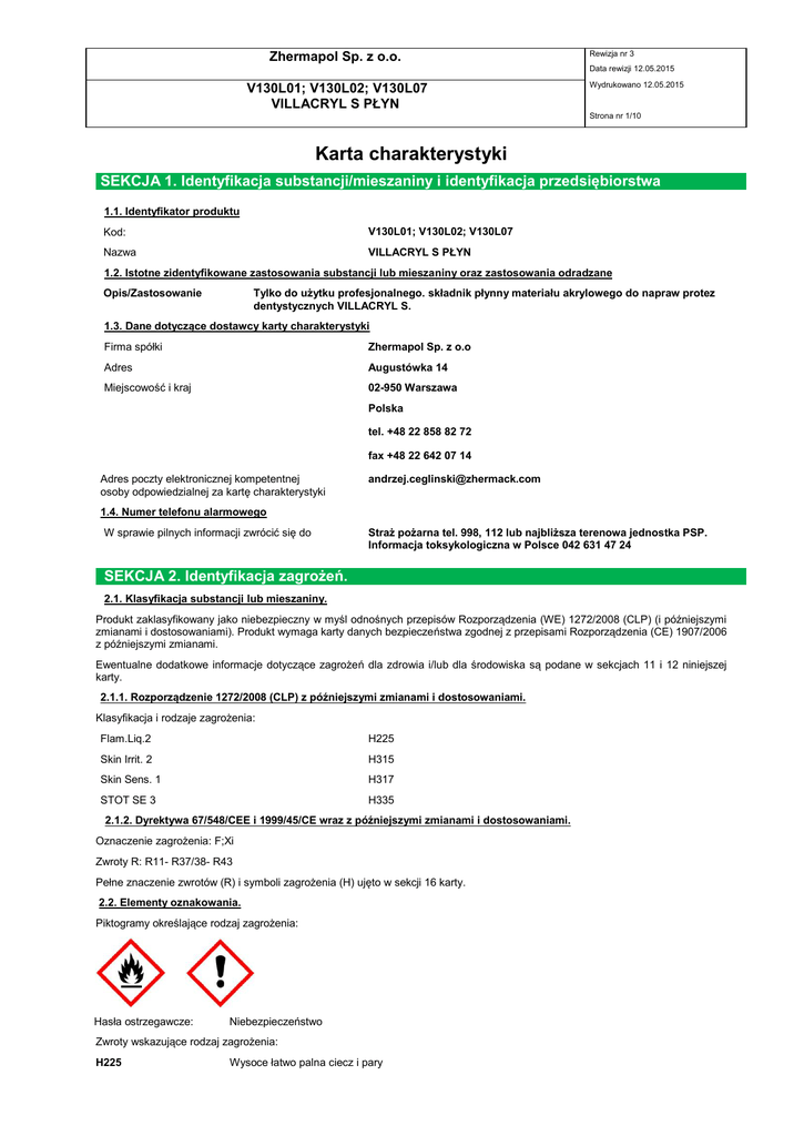 Zhermapol Sp. z o.o. Rewizja nr 3 Data rewizji 12.05.2015 V130L01; V130L02; V130L07 VILLACRYL S PŁYN Wydrukowano 12.05.2015 Strona nr 1/10 Karta charakterystyki SEKCJA 1. Identyfikacja substancji/mieszaniny i identyfikacja przedsiębiorstwa 1.1. Identyfikator produktu Kod: V130L01; V130L02; V130L07 Nazwa VILLACRYL S PŁYN 1.2. Istotne zidentyfikowane zastosowania substancji lub mieszaniny oraz zastosowania odradzane Tylko do użytku profesjonalnego. składnik płynny materiału akrylowego do napraw protez dentystycznych VILLACRYL S. Opis/Zastosowanie 1.3. Dane dotyczące dostawcy karty charakterystyki Firma spółki Zhermapol Sp. z o.o Adres Augustówka 14 Miejscowość i kraj 02-950 Warszawa Polska tel. +48 22 858 82 72 fax +48 22 642 07 14 Adres poczty elektronicznej kompetentnej osoby odpowiedzialnej za kartę charakterystyki [email protected] 1.4. Numer telefonu alarmowego W sprawie pilnych informacji zwrócić się do Straż pożarna tel. 998, 112 lub najbliższa terenowa jednostka PSP. Informacja toksykologiczna w Polsce 042 631 47 24 SEKCJA 2. Identyfikacja zagrożeń. 2.1. Klasyfikacja substancji lub mieszaniny. Produkt zaklasyfikowany jako niebezpieczny w myśl odnośnych przepisów Rozporządzenia (WE) 1272/2008 (CLP) (i późniejszymi zmianami i dostosowaniami). Produkt wymaga karty danych bezpieczeństwa zgodnej z przepisami Rozporządzenia (CE) 1907/2006 z późniejszymi zmianami. Ewentualne dodatkowe informacje dotyczące zagrożeń dla zdrowia i/lub dla środowiska są podane w sekcjach 11 i 12 niniejszej karty. 2.1.1. Rozporządzenie 1272/2008 (CLP) z późniejszymi zmianami i dostosowaniami. Klasyfikacja i rodzaje zagrożenia: Flam.Liq.2 H225 Skin Irrit. 2 H315 Skin Sens. 1 H317 STOT SE 3 H335 2.1.2. Dyrektywa 67/548/CEE i 1999/45/CE wraz z późniejszymi zmianami i dostosowaniami. Oznaczenie zagrożenia: F;Xi Zwroty R: R11- R37/38- R43 Pełne znaczenie zwrotów (R) i symboli zagrożenia (H) ujęto w sekcji 16 karty. 2.2. Elementy oznakowania. Piktogramy określające rodzaj zagrożenia: Hasła ostrzegawcze: Niebezpieczeństwo Zwroty wskazujące rodzaj zagrożenia: H225 Wysoce łatwo palna ciecz i pary Zhermapol Sp. z o.o. Rewizja nr 3 Data rewizji 12.05.2015 V130L01; V130L02; V130L07 VILLACRYL S PŁYN Wydrukowano 12.05.2015 Strona nr 2/10 H315 Działa drażniąco na skórę. H317 Może powodować reakcję alergiczna skóry H335 Może powodować podrażnienia dróg oddechowych Zwroty wskazujące środki ostrożności: P210 Przechowywać z dala od źródeł ciepła/iskrzenia/otwartego ognia/gorących powierzchni. – Palenie wzbronione P261 Unikać wdychania pyłu/dymu/gazu/mgły/par/rozpylonej cieczy P280 Stosować rękawice ochronne / odzież ochronną / ochronę oczu / ochronę twarzy. P501 Zawartość/pojemnik usuwać do upoważnionego odbiorcy odpadów. P302 + P352 W PRZYPADKU KONTAKTU ZE SKÓRĄ: Umyć dużą ilością wody z mydłem. Zawiera: METAKRYLAN METYLU 2.3. Inne zagrożenia. Brak. SEKCJA 3. Skład/informacja o składnikach. 3.1. Substancje. Nie dotyczy. 3.2. Mieszaniny. Zawiera: Składniki Metakrylan metylu Nr CAS 80-62-6 Nr WE 201-297-1 Nr Indeksu 607-035-00-6 Klasyfikacja Stężenie Flam.Liq.2, Skin Irrit. 2; Skin Sens. 1; STOT SE 3; H225, H315, H317;, H335 >90% Nr. Rej. 01-2119452498-28-XXXX Dimetakrylan glikolu etylenowego F, Xi, R11 – R37/38 – R43 Nr CAS 97-90-5 Skin Sens. 1; STOT SE 3; H317, H335 Nr WE 202-617-22 Nr Indeksu 607-114-00-5 Nr. Rej. N,N-dimethyl-p-toluidyne Xi, R37 – R43 Nr CAS 99-97-8 Nr WE 202-805-4 Acute toxicity Inhalation 3; Acute toxicity Dermal 3;, Acute toxicity Oral 3;; STOT RE 2; Chronic Aquatic 3; H301, H311, H331, H373, H412 Nr Indeksu 612-056-00-9 Nr. Rej. - Do 10% < 1% T, R23/24/25 - R33 – R52/53 Uwaga: Górna wartość zakresu nie wliczana. Pełne znaczenie zwrotów (R) i symboli zagrożenia (H) ujęto w sekcji 16 karty. SEKCJA 4. Środki pierwszej pomocy. 4.1. Opis środków pierwszej pomocy. OCZY: Wyjąć soczewki kontaktowe, jeżeli są. Natychmiast płukać, przytrzymując odchylone powieki, dużą ilością wody przez przynajmniej 15 minut. W przypadku wystąpienia podrażnienia wezwać lekarza SKORA: Zdjąć zanieczyszczone ubranie. Miejsce kontaktu natychmiast umyć dokładnie dużą ilością wody z mydłem. Kontynuować płukanie przez 10 min.. W przypadku wystąpienia podrażnienia skonsultować się z lekarzem. Przed ponownym użyciem zanieczyszczone ubranie wyprać. INHALACJA: Narażonego wyprowadzić na świeże powietrze. Jeżeli poszkodowany nie oddycha, podjąć resuscytację. Natychmiast wezwać lekarza. SPOŻYCIE: Osobie nieprzytomnej nie podawać nic doustnie. Natychmiast wypłukać jamę ustną wodą a następnie wypić 200 – 300 ml wody. Nie wywoływać wymiotów. Niezwłocznie skonsultować się z lekarzem (pokazać opakowanie lub etykietę). 4.2. Najważniejsze ostre i opóźnione objawy oraz skutki narażenia. Zhermapol Sp. z o.o. Rewizja nr 3 Data rewizji 12.05.2015 V130L01; V130L02; V130L07 VILLACRYL S PŁYN Wydrukowano 12.05.2015 Strona nr 3/10 Bezpośrednie narażenie inhalacyjne na pary i substancje uwalniane do atmosfery może powodować podrażnienia układu oddechowego, zawroty głowy, senność oraz przy dużych stężeniach chwilowe zamroczenia, lub utratę świadomości. Wielokrotne częste oddziaływanie na człowieka może prowadzić do obniżenia odporności i powstawania reakcji uczuleniowych U osób uczulonych mogą występować silne reakcje uczuleniowe na bardzo małe ilości mieszaniny.. 4.3. Wskazania dotyczące wszelkiej natychmiastowej pomocy lekarskiej i szczególnego postępowania z poszkodowanym. Leczyć objawowo. W przypadku spożycia skontaktować się z lekarzem specjalizującym się w leczeniu zatruć. SEKCJA 5. Postępowanie w przypadku pożaru. 5.1. Środki gaśnicze. ZALECANE ŚRODKI GAŚNICZE Zwykłe środki gaśnicze: dwutlenek węgla, piana, proszki gaśnicze i mgła chłodziwa, piasek. NIE ZALECANE ŚRODKI GAŚNICZE Silny strumień wody. 5.2. Szczególne