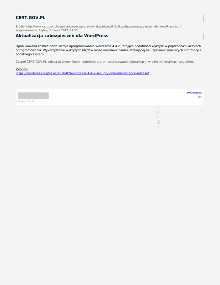 CERT.GOV.PL Źródło: http://www.cert.gov.pl/cer/wiadomosci/poprawki-i-aktualizacj/846,Aktualizacja-zabezpieczen-dla-WordPress.html Wygenerowano: Piątek, 3 marca 2017, 21:57 Aktualizacja zabezpieczeń dla WordPress Opublikowana została nowa wersja oprogramowania WordPress 4.4.2, łatająca podatności wykryte w poprzednich wersjach oprogramowania. Wykorzystanie wykrytych błędów może umożliwić osobie atakującej na uzyskanie wrażliwych informacji z podatnego systemu. Zespół CERT.GOV.PL zaleca użytkownikom i administratorom zastosowanie aktualizacji, w celu minimalizacji zagrożeń. Źródło: https://wordpress.org/news/2016/02/wordpress-4-4-2-security-and-maintenance-release/ WordPress KM Ocena: 0/5 (0)