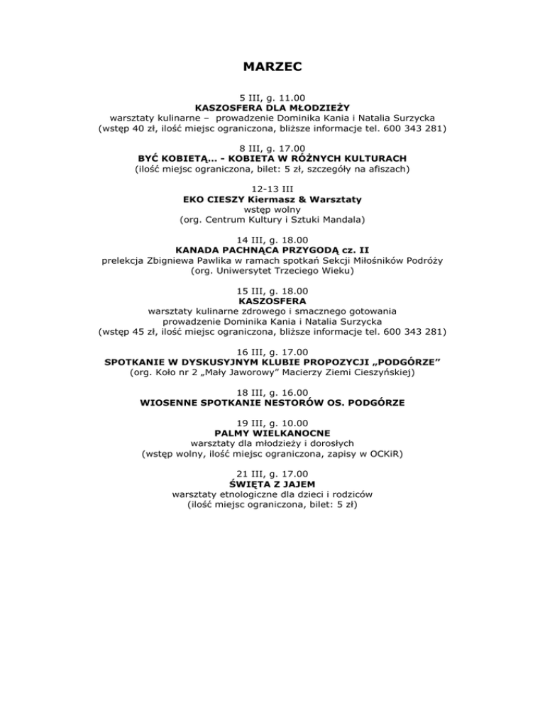 MARZEC 5 III, g. 11.00 KASZOSFERA DLA MŁODZIEŻY warsztaty kulinarne – prowadzenie Dominika Kania i Natalia Surzycka (wstęp 40 zł, ilość miejsc ograniczona, bliższe informacje tel. 600 343 281) 8 III, g. 17.00 BYĆ KOBIETĄ… - KOBIETA W RÓŻNYCH KULTURACH (ilość miejsc ograniczona, bilet: 5 zł, szczegóły na afiszach) 12-13 III EKO CIESZY Kiermasz & Warsztaty wstęp wolny (org. Centrum Kultury i Sztuki Mandala) 14 III, g. 18.00 KANADA PACHNĄCA PRZYGODĄ cz. II prelekcja Zbigniewa Pawlika w ramach spotkań Sekcji Miłośników Podróży (org. Uniwersytet Trzeciego Wieku) 15 III, g. 18.00 KASZOSFERA warsztaty kulinarne zdrowego i smacznego gotowania prowadzenie Dominika Kania i Natalia Surzycka (wstęp 45 zł, ilość miejsc ograniczona, bliższe informacje tel. 600 343 281) 16 III, g. 17.00 SPOTKANIE W DYSKUSYJNYM KLUBIE PROPOZYCJI „PODGÓRZE” (org. Koło nr 2 „Mały Jaworowy” Macierzy Ziemi Cieszyńskiej) 18 III, g. 16.00 WIOSENNE SPOTKANIE NESTORÓW OS. PODGÓRZE 19 III, g. 10.00 PALMY WIELKANOCNE warsztaty dla młodzieży i dorosłych (wstęp wolny, ilość miejsc ograniczona, zapisy w OCKiR) 21 III, g. 17.00 ŚWIĘTA Z JAJEM warsztaty etnologiczne dla dzieci i rodziców (ilość miejsc ograniczona, bilet: 5 zł)
