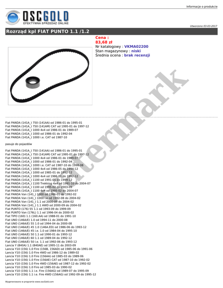 Informacje o produkcie Utworzono 03-03-2017 Rozrząd kpl FIAT PUNTO 1.1 /1.2 Cena : 83,68 zł er m ar k Nr katalogowy : VKMA02200 Stan magazynowy : niski Średnia ocena : brak recenzji Fiat PANDA (141A_) 750 (141AA) od 1986-01 do 1995-01 Fiat PANDA (141A_) 750 (141AM) CAT od 1995-01 do 1997-12 Fiat PANDA (141A_) 1000 4x4 od 1986-01 do 1989-07 Fiat PANDA (141A_) 1000 od 1986-01 do 1992-04 Fiat PANDA (141A_) 1000 i.e. CAT od 1987-10 pasuje do pojazdów w at Fiat PANDA (141A_) 750 (141AA) od 1986-01 do 1995-01 Fiat PANDA (141A_) 750 (141AM) CAT od 1995-01 do 1997-12 Fiat PANDA (141A_) 1000 4x4 od 1986-01 do 1989-07 Fiat PANDA (141A_) 1000 od 1986-01 do 1992-04 Fiat PANDA (141A_) 1000 i.e. CAT od 1987-10 do 1998-08 Fiat PANDA (141A_) 1000 4x4 od 1986-05 do 1994-12 Fiat PANDA (141A_) 1000 od 1985-01 do 1992-12 Fiat PANDA (141A_) 1000 4x4 od 1986-01 do 1992-12 Fiat PANDA (141A_) 1100 od 1991-05 do 1999-12 Fiat PANDA (141A_) 1100 Trekking 4x4 od 1991-10 do 2004-07 Fiat PANDA (141A_) 1100 od 1995-02 do 2003-09 Fiat PANDA (141A_) 1100 4x4 od 1995-02 do 2004-07 Fiat PANDA Van (141_) 1000 od 1986-01 do 1992-02 Fiat PANDA Van (141_) 1000 i.e od 1992-08 do 2004-02 Fiat PANDA Van (141_) 1.1 od 2000-09 do 2004-02 Fiat PANDA Van (141_) 1.1 AWD od 2000-09 do 2004-02 Fiat PUNTO (176) 55 1.1 od 1993-09 do 1999-09 Fiat PUNTO Van (176L) 1.1 od 1996-04 do 2000-02 Fiat TIPO (160) 1.1 (160.AA) od 1988-01 do 1991-10 Fiat UNO (146A/E) 1.0 od 1994-11 do 2000-08 Fiat UNO (146A/E) 55 1.0 od 1994-04 do 2000-08 Fiat UNO (146A/E) 45 1.0 (146A.ED) od 1986-06 do 1993-12 Fiat UNO (146A/E) 45 i.e. 1.0 od 1984-04 do 1995-10 Fiat UNO (146A/E) 50 1.1 od 1990-01 do 1993-12 Fiat UNO (146A/E) 60 1.1 od 1989-04 do 1992-12 Fiat UNO (146A/E) 50 i.e. 1.1 od 1992-06 do 1993-12 Lancia Y (840A) 1.1 (840AE) od 1995-11 do 2003-09 Lancia Y10 (156) 1.0 Fire (156B, 156AD) od 1985-06 do 1991-06 Lancia Y10 (156) 1.0 Fire 4WD od 1986-12 do 1989-02 Lancia Y10 (156) 1.0 Fire (156AA) od 1985-03 do 1989-06 Lancia Y10 (156) 1.0 Fire (156AE) CAT od 1987-10 do 1992-02 Lancia Y10 (156) 1.0 Fire 4WD (156AE) od 1987-12 do 1992-02 Lancia Y10 (156) 1.0 Fire od 1985-03 do 1990-02 Lancia Y10 (156) 1.1 i.e. Fire (156AG) od 1989-07 do 1995-09 Lancia Y10 (156) 1.1 i.e. Fire 4WD (156AG) od 1992-09 do 1995-12 Wygenerowano w programie www.oscGold.com w at er m ar k Lancia Y10 (156) 1.1 Avenue (156AG) od 1995-01 do 1995-12 Lancia Y10 (156) 1.1 Avenue 4WD (156AG) od 1995-01 do 1995-12 Lancia Y10 (156) 1.1 i.e (156AC) od 1989-08 do 1992-06 Lancia Y10 (156) 1.1 i.e 4WD (156AC) od 1989-08 do 1992-06