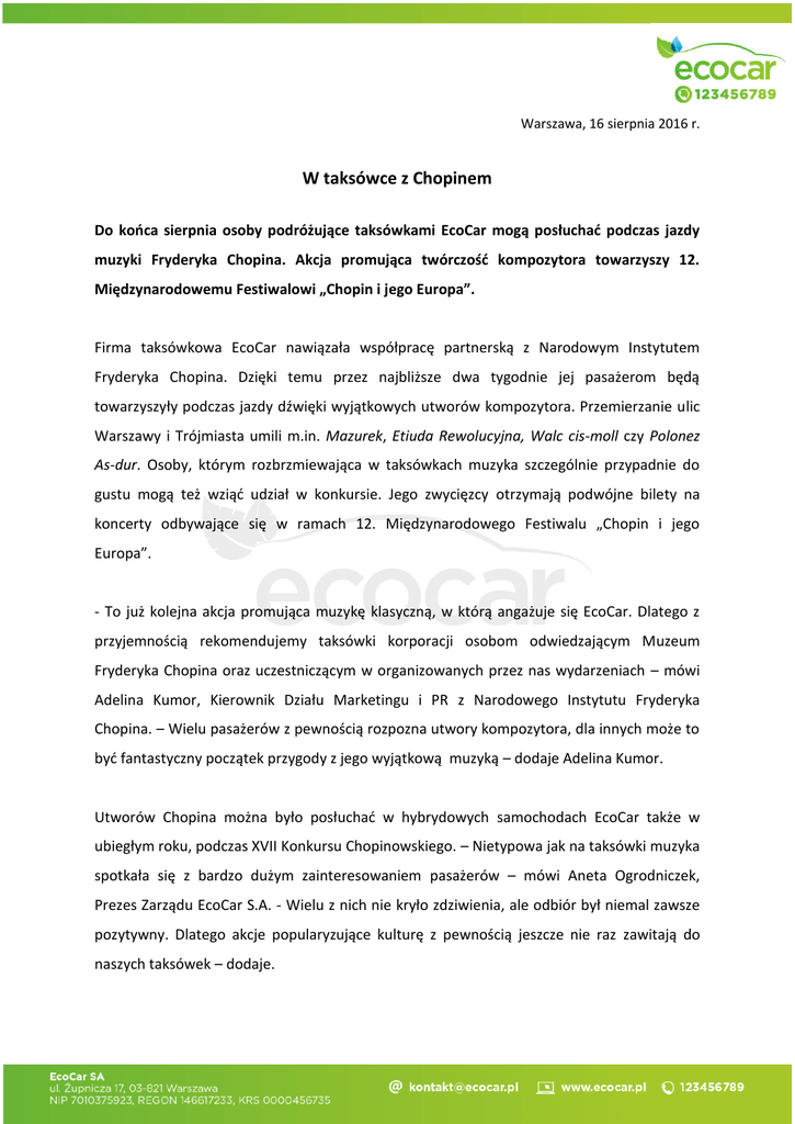 Warszawa, 16 sierpnia 2016 r. W taksówce z Chopinem Do końca sierpnia osoby podróżujące taksówkami EcoCar mogą posłuchać podczas jazdy muzyki Fryderyka Chopina. Akcja promująca twórczość kompozytora towarzyszy 12. Międzynarodowemu Festiwalowi „Chopin i jego Europa”. Firma taksówkowa EcoCar nawiązała współpracę partnerską z Narodowym Instytutem Fryderyka Chopina. Dzięki temu przez najbliższe dwa tygodnie jej pasażerom będą towarzyszyły podczas jazdy dźwięki wyjątkowych utworów kompozytora. Przemierzanie ulic Warszawy i Trójmiasta umili m.in. Mazurek, Etiuda Rewolucyjna, Walc cis-moll czy Polonez As-dur. Osoby, którym rozbrzmiewająca w taksówkach muzyka szczególnie przypadnie do gustu mogą też wziąć udział w konkursie. Jego zwycięzcy otrzymają podwójne bilety na koncerty odbywające się w ramach 12. Międzynarodowego Festiwalu „Chopin i jego Europa”. - To już kolejna akcja promująca muzykę klasyczną, w którą angażuje się EcoCar. Dlatego z przyjemnością rekomendujemy taksówki korporacji osobom odwiedzającym Muzeum Fryderyka Chopina oraz uczestniczącym w organizowanych przez nas wydarzeniach – mówi Adelina Kumor, Kierownik Działu Marketingu i PR z Narodowego Instytutu Fryderyka Chopina. – Wielu pasażerów z pewnością rozpozna utwory kompozytora, dla innych może to być fantastyczny początek przygody z jego wyjątkową muzyką – dodaje Adelina Kumor. Utworów Chopina można było posłuchać w hybrydowych samochodach EcoCar także w ubiegłym roku, podczas XVII Konkursu Chopinowskiego. – Nietypowa jak na taksówki muzyka spotkała się z bardzo dużym zainteresowaniem pasażerów – mówi Aneta Ogrodniczek, Prezes Zarządu EcoCar S.A. - Wielu z nich nie kryło zdziwienia, ale odbiór był niemal zawsze pozytywny. Dlatego akcje popularyzujące kulturę z pewnością jeszcze nie raz zawitają do naszych taksówek – dodaje. *** O EcoCar: EcoCar S.A. to najbardziej nowoczesna firma taksówkowa w Polsce, która dysponuje własną, jednorodną flotą maksymalnie dwuletnich i ekologicznych aut. Posiada szeroką ofertę usług dedykowanych zarówno dla klientów indywidualnych, rodzin, małych i średnich przedsiębiorstw, jak również dużych firm i korporacji. Gwarantuje komfort i bezpieczeństwo ich realizacji według najwyższych europejskich standardów. Kontakt dla mediów: Ilona Fijałek, Marketing&PR, [email protected], tel. +48 539 931 112