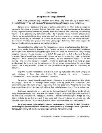 List Czwarty Drogi Bracie! Droga Siostro! Kilka osób przeciska się z trudem przez tłum. Czy tylko oni są w stanie łaski. A reszta? Może i Ty do nich należysz? Dlaczego nie idziesz? Przecież znasz wolę Pana! Sprawą jasną i bezdyskusyjną jest, że pełne uczestnictwo we Mszy Świętej polega na przyjęciu Chrystusa w Komunii Świętej. Wszystko inne do tego podprowadza. Pomyślmy sobie, że jeżeli idziemy do kościoła, choćby wiele kilometrów, jeśli śpiewamy, modlimy się nawet – a nie przyjmujemy Komunii Świętej – to w gruncie rzeczy mówimy Chrystusowi: „Panie, nie potrzebuję Ciebie. Dam sobie radę sam”. A dobrze wiemy, że to nieprawda, że On nam jest konieczny, że bez Niego nic uczynić nie możemy. Więc coś tu nie jest w porządku. Do Komunii Świętej idzie przeważnie tylko „delegacja”. Człowiek, który idzie często do Komunii budzi zdziwienie, czasem kąśliwe komentarze. Pewna zakonnica, lektorka języka francuskiego, bardzo chciała przyjechać do Polski – kraju, który wydał Papieża. Podczas Mszy Świętej w jednym z warszawskich kościołów zauważyła, że do Komunii Świętej przystąpiło tylko kilka osób. Po zakończonej Mszy Świętej zapytała księdza: „Proszę księdza, co to było? Dlaczego oni nie byli u Komunii Świętej, ci wszyscy ludzie wypełniający świątynie? Czy oni nie wierzą, że tam jest żywy i prawdziwy Chrystus?” Ksiądz rozłożył bezradnie ręce i rzekł; „No nie. Zasadniczo wierzą”. – Jak to? Wierzą i nie chcą Go przyjąć do serca? – pytała nie pojmując dalej. I nie mógł jej tego wytłumaczyć. Bo tego się nie da wytłumaczyć! To jest nasza rana religijna. To nasza słaba strona. Tyle mamy walorów i plusów. Za tyle spraw świat nas podziwia. Tu zawodzimy na całej linii. Popatrz. Ty sam nakładasz na siebie karę. Sam się wyłączasz od Komunii Świętej na całe miesiące i lata. Czy nie trzeba Cię szarpnąć za ramię i zawołać: „Człowieku, co czynisz? Sam się pozbawiasz Chrystusa! Święty Jan Paweł II wołał na cały świat: „Otwórzcie drzwi Odkupicielowi. Nie bójcie się przyjąć Chrystusa”. A dlaczego drzwi Twego serca są przed Nim zamknięte? Jeśli oddzielamy się od Komunii Świętej – jesteśmy duchowo bezbronni. Wszelkie zło może nas zaatakować i zwyciężyć. Sami się rozbroiliśmy. Tak, to lud chory na duszy. Taka jest diagnoza. Jak ludzie uzasadniają to, że nie idą do Komunii Świętej? Jedni boją się, by ich nie wzięto za pobożnisiów, inni z lenistwa. Jeszcze inni mają za słabą wiarę. Żywa wiara prowadzi na spotkanie z Chrystusem. Tradycyjna, martwa – pozwala obywać się bez Niego. Są tacy, którzy mówią, że są zbyt grzeszni. A czy może być większy i cięższy grzech niż ten, gdy człowiek latami trzyma Chrystusa za drzwiami swego serca i nie chce się z nim spotkać? Bo zmarnowane te lata chude, głodne, zmarnowane i puste te dni bez Chrystusa. Jeżeli czegoś będziemy żałować po śmierci, gdy się nam oczy otworzą na Boże tajemnice – to tego, że byliśmy tak niedbali w przystępowaniu do Komunii Świętej. Zaczerpnięte z książki ks. Mirosława Nowaka „Żyć Mszą świętą”