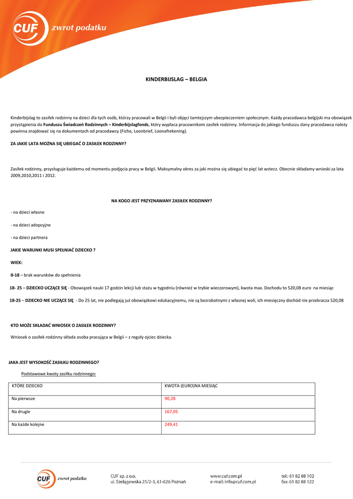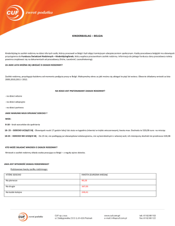 KINDERBIJSLAG – BELGIA Kinderbijslag to zasiłek rodzinny na dzieci dla tych osób, którzy pracowali w Belgii i byli objęci tamtejszym ubezpieczeniem społecznym. Każdy pracodawca belgijski ma obowiązek przystąpienia do Funduszu Świadczeń Rodzinnych – Kinderbijslagfonds, który wypłaca pracownikom zasiłek rodzinny. Informacja do jakiego funduszu dany pracodawca należy powinna znajdować się na dokumentach od pracodawcy (Fiche, Loonbrief, Loonafrekening). ZA JAKIE LATA MOŻNA SIĘ UBIEGAĆ O ZASIŁEK RODZINNY? Zasiłek rodzinny, przysługuje każdemu od momentu podjęcia pracy w Belgii. Maksymalny okres za jaki można się ubiegać to pięć lat wstecz. Obecnie składamy wnioski za lata 2009,2010,2011 i 2012. NA KOGO JEST PRZYZNAWANY ZASIŁEK RODZINNY? - na dzieci własne - na dzieci adopcyjne - na dzieci partnera JAKIE WARUNKI MUSI SPEŁNIAĆ DZIECKO ? WIEK: 0-18 – brak warunków do spełnienia 18- 25 – DZIECKO UCZĄCE SIĘ - Obowiązek nauki 17 godzin lekcji lub stażu w tygodniu (również w trybie wieczorowym), kwota max. Dochodu to 520,08 euro na miesiąc 18-25 – DZIECKO NIE UCZĄCE SIĘ - Do 25 lat, nie podlegają już obowiązkowi edukacyjnemu, nie są bezrobotnymi z własnej woli, ich miesięczny dochód nie przekracza 520,08 KTO MOŻE SKŁADAĆ WNIOSEK O ZASIŁEK RODZINNY? Wniosek o zasiłek rodzinny składa osoba pracująca w Belgii – z reguły ojciec dziecka. JAKA JEST WYSOKOŚĆ ZASIŁKU RODZINNEGO? Podstawowe kwoty zasiłku rodzinnego: KTÓRE DZIECKO KWOTA (EURO)NA MIESIĄC Na pierwsze 90,28 Na drugie 167,05 Na każde kolejne 249,41 W zależności od sytuacji rodzinnej mogą być wypłacane dodatki: SYTUACJA RODZICA KTÓRE DZIECKO KWOTA (EURO) NA MIESIĄC Inwalida Na pierwsze 98,88 Na drugie 28,49 Na trzecie 5,00 (22,97 samotny rodzic) Na pierwsze 45,96 Na drugie 28,49 Na trzecie 5,00 (22,97 samotny rodzic) Na pierwsze 45,96 Na drugie 28,49 Na trzecie 22,97 Emeryt; ponad 6 miesięcy bezrobotny Samotnie wychowujący dziecko Dzieci, po ukończeniu 6, 12 i 18 lat otrzymują dodatkowo, co miesiąc, leeftijdsbijslag. KWOTA (EURO) NA MIESIĄC WIEK (LATA) NA PIERWSZE I JEDYNE DZIECKO NA KOLEJNE DZIECI,( W TYM NIEPEŁNOSPRAWNE) 6-11 15,73 31,36 12-18 23,95 47,92 OD 18 27,60 60,93 Co roku, w sierpniu, wypłacana jest premia szkolna (schoolpremie): WIEK DZIECKA (LATA) KWOTA (EURO) Podstawowy zasiłek rodzinny Podwyższony zasiłek rodzinny Dzieci w wieku 0-5 22,00 27,60 Dzieci w wieku 6-11 50,00 58,59 Dzieci w wieku 12-17 70,00 82,02 Dzieci w wieku 18-24 95,00 110,42 JAKI JEST CZAS OCZEKIWANIA NA WYPŁATĘ ZASIŁKU? Nie można jednoznacznie określić czasu oczekiwania na wypłatę zasiłku rodzinnego. Spowodowane jest to tym, że każdy wniosek rozpatrywany jest indywidualnie ze względu na ilość czynników jakie bierze się pod uwagę. Ponadto Urząd kontaktuje się z Regionalnym Ośrodkiem Opieki Społecznej w Polsce w celu uzupełnienia i weryfikacji informacji co również wymaga czasu. Szacunkowy czas oczekiwania na zwrot to kilka miesięcy. JAKIE DOKUMENTY SĄ POTRZEBNE DO ZŁOŻENIA WNIOSKU? 1. Dokumenty od pracodawcy – Fiche, Loonbrief, Loonafrekening, 2. Pełnomocnictwo, 3. Kopia dowodu osobistego lub paszportu 4. Unijny akt urodzenia dziecka, 5. Unijny akt małżeństwa, 6. Decyzja potwierdzająca pobieranie zasiłku w Polsce/Belgii, 7. Zaświadczenie o zameldowaniu, 8. Zaświadczenia potwierdzające status osoby bezrobotnej, pobieranie zasiłku, emerytury, renty, 9. Kopia dowodu osobistego lub paszportu opiekuna dziecka, 10. Oświadczenie o zarobkach (lub ich braku) opiekuna dziecka. ROPS może poprosić o : 1. kopia dowodu osobistego opiekuna dziecka potwierdzoną „ za zgodność z oryginałem”, 2. Oryginał unijnego aktu urodzenia dziecka, 3. Oryginał unijnego aktu małżeństwa lub w przypadku innego stanu cywilnego dokument go potwierdzający, 4. Oryginał wspólnego zameldowania opiekuna z dziećmi , 5. Oryginał dokumentu potwierdzającego sytuację zawodową opiekuna w Polsce, 6. Oryginał zaświadczenia lub oświadczenie stwierdzające wysokość dochodu rodziny, 7. Aktualne zaświadczenie potwierdzające pobieranie lub nie pobieranie zasiłku rodzinnego w Polsce. W JAKICH TERMINACH I KOMU JEST WYPŁACANY ZASIŁEK RODZINNY? Zasiłek rodzinny jest wypłacany na konto, które poda nam klient. Pieniądze są wypłacane co miesiąc. Prawo do zasiłku rodzinnego rozpoczyna się od pierwszego dnia miesiąca następującego po zakwalifikowaniu się do zasiłku rodzinnego. Zasiłek jest wypłacany 10-tego następnego miesiąca. Przykład: Dziecko rodzi się w lutym, prawo do zasiłku uzyskuje od 01 marca, pierwszy zasiłek jest wypłacany 10 kwietnia.