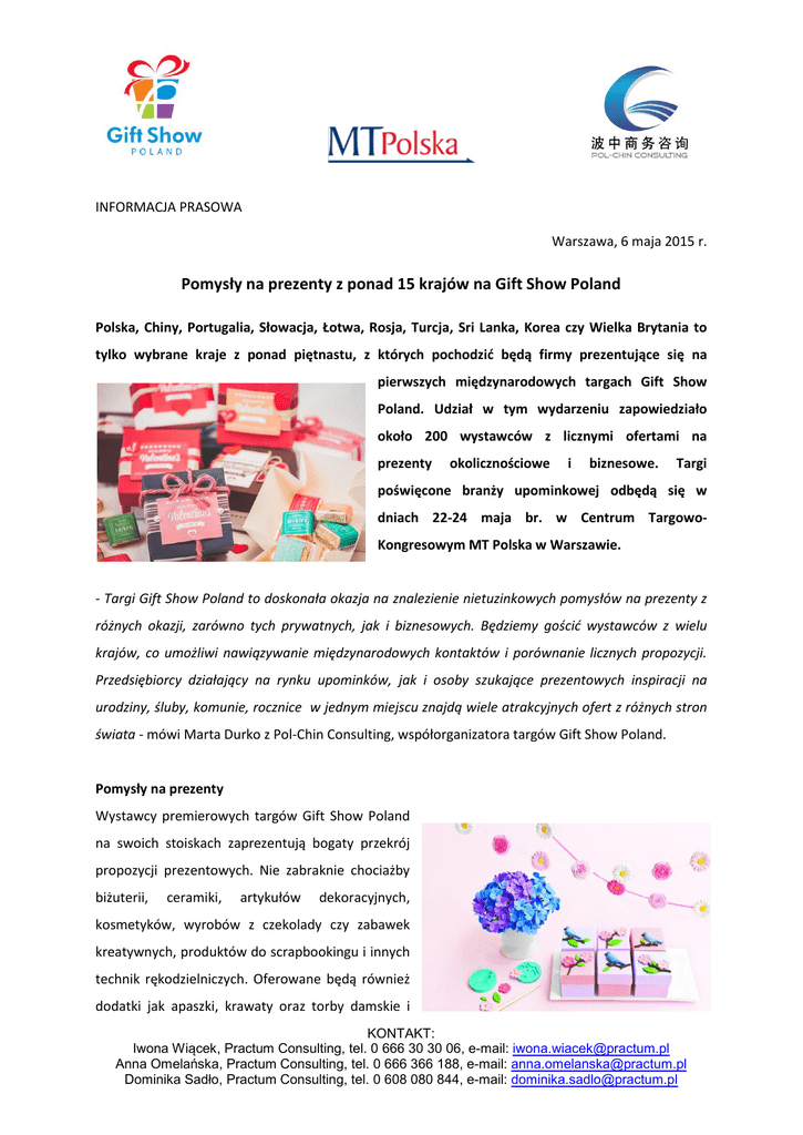 INFORMACJA PRASOWA Warszawa, 6 maja 2015 r. Pomysły na prezenty z ponad 15 krajów na Gift Show Poland Polska, Chiny, Portugalia, Słowacja, Łotwa, Rosja, Turcja, Sri Lanka, Korea czy Wielka Brytania to tylko wybrane kraje z ponad piętnastu, z których pochodzić będą firmy prezentujące się na pierwszych międzynarodowych targach Gift Show Poland. Udział w tym wydarzeniu zapowiedziało około 200 wystawców z licznymi ofertami na prezenty okolicznościowe i biznesowe. Targi poświęcone branży upominkowej odbędą się w dniach 22-24 maja br. w Centrum TargowoKongresowym MT Polska w Warszawie. - Targi Gift Show Poland to doskonała okazja na znalezienie nietuzinkowych pomysłów na prezenty z różnych okazji, zarówno tych prywatnych, jak i biznesowych. Będziemy gościć wystawców z wielu krajów, co umożliwi nawiązywanie międzynarodowych kontaktów i porównanie licznych propozycji. Przedsiębiorcy działający na rynku upominków, jak i osoby szukające prezentowych inspiracji na urodziny, śluby, komunie, rocznice w jednym miejscu znajdą wiele atrakcyjnych ofert z różnych stron świata - mówi Marta Durko z Pol-Chin Consulting, współorganizatora targów Gift Show Poland. Pomysły na prezenty Wystawcy premierowych targów Gift Show Poland na swoich stoiskach zaprezentują bogaty przekrój propozycji prezentowych. Nie zabraknie chociażby biżuterii, ceramiki, artykułów dekoracyjnych, kosmetyków, wyrobów z czekolady czy zabawek kreatywnych, produktów do scrapbookingu i innych technik rękodzielniczych. Oferowane będą również dodatki jak apaszki, krawaty oraz torby damskie i KONTAKT: Iwona Wiącek, Practum Consulting, tel. 0 666 30 30 06, e-mail: [email protected] Anna Omelańska, Practum Consulting, tel. 0 666 366 188, e-mail: [email protected] Dominika Sadło, Practum Consulting, tel. 0 608 080 844, e-mail: [email protected] INFORMACJA PRASOWA walizki. Ponadto jedna z firm będzie proponowała zwiedzającym niezapomniane prezenty spośród 700 emocjonujących atrakcji dostępnych w całej Polsce jak chociażby jazda quadem, skoki na bungee, masaż gorącymi kamieniami bądź romantyczna kolacja. Zorganizuje również konkurs, w którym do wygrania będzie m.in. lot szybowcem. Co więcej, wystawcy zaprezentują gadżety elektroniczne, akcesoria do urządzeń mobilnych i smartfonów. Będzie można także zapoznać się z ofertą urządzeń do wydruków w technice 3D jak długopisy do druku 3D, doskonałe do prezentacji różnorodnych modeli i form. Osoby zainteresowane upominkami firmowymi znajdą na Gift Show Poland produkty reklamowe, smycze, czapeczki czy też urządzenia laserowe, innowacyjne urządzenia do produkcji pieczątek, personalizacji gadżetów i upominków promocyjnych. Dodatkowo swoje oferty przedstawią producenci logistyczne opakowań, z tekstyliów międzynarodowymi oraz firmy usługami transportowymi. Trzy dni dla prezentów Międzynarodowe targi Gift Show Poland są branżowym wydarzeniem kierowanym przede wszystkim do importerów, producentów i projektantów artykułów designerskich czyli zawodowo związanych z rynkiem upominków, jak również do osób szukających prezentów na urodziny, śluby, imieniny, święta, rocznice, parapetówki i inne okazje. Impreza odbędzie się w Centrum Targowo-Kongresowym MT Polska przy ul. Marsa 56 c w Warszawie. W ramach targów zorganizowane zostanie również Forum Branży Prezentowo-Upominkowej z cyklem spotkań poświęconych tematom rozwoju biznesu na tym rynku. Dodatkowe informacje nt. targów Gift Show Poland można znaleźć na stronie www.giftshow.pl. *** Pol-Chin Consulting to firma w sposób kompleksowy dostarczająca usługi dla biznesu polsko-chińskiego. Jest organizatorem wielu cyklicznych imprez, np. corocznych „Obchodów Chińskiego Nowego Roku” organizowanych wspólnie z Ministerstwem Kultury ChRL oraz Ambasadą ChRL w Polsce, konferencji oraz KONTAKT: Iwona Wiącek, Practum Consulting, tel. 0 666 30 30 06, e-mail: [email protected] Anna Omelańska, Practum Consulting, tel. 0 666 366 188, e-mail: [email protected] Dominika Sadło, Practum Consulting, tel. 0 608 080 844, e-mail: [email protected] INFORMACJA PRASOWA targów - m.in. China Expo Poland i Auto Expo Parts&Service. Ponadto zapewnia obsługę turystyczną chińskich delegacji przyjeżdżających do Europy oraz polskich misji handlowo-targowych do Chin. W ofercie firmy jest też konsulting dla przedsiębiorców zainteresowanych biznesem polsko-chińskim, działalność edukacyjna w zakresie nauczania języka chińskiego (placówka – Chińska Szkoła w Warszawie), działalność wydawnicza (m.in. poprzez portal informacyjny www.plchinese.com), a także usługi cateringowe (sieć restauracji China Town). Międzynarodowe Targi Polska to operator jednego z najnowocześniejszych obiektów wystawienniczoeventowych w Polsce - Centrum Targowo-Kongresowego MT Polska - zlokalizowanego przy ul. Marsa 56c w Warszawie. Obiekt ten jest w pełni dostosowany do organizacji targów, zjazdów, konferencji i eventów (w tym bankietów, koncertów czy zawodów sportowych). Zajmuje łącznie 15 200 mkw., z czego 10 000 mkw. stanowi funkcjonalna i klimatyzowana hala wystawiennicza, 4 000 mkw. teren zewnętrzny, zaś 1 200 mkw. nowoczesne zaplecze konferencyjno-biurowe. Międzynarodowe Targi Polska jest także organizatorem i współorganizatorem kilku projektów targowych, tj. Targi Produktów Tradycyjnych i Regionalnych Regionalia, Targi Agroturystyka, Motor Sport & Tuning, Gift Show Poland. KONTAKT: Iwona Wiącek, Practum Consulting, tel. 0 666 30 30 06, e-mail: [email protected] Anna Omelańska, Practum Consulting, tel. 0 666 366 188, e-mail: [email protected] Dominika Sadło, Practum Consulting, tel. 0 608 080 844, e-mail: [email protected]