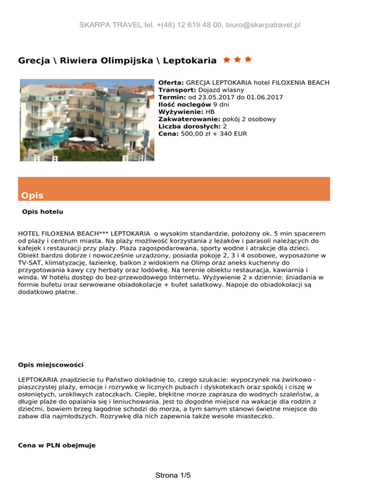 SKARPA TRAVEL tel. +(48) 12 619 48 00, [email protected] Grecja \ Riwiera Olimpijska \ Leptokaria Oferta: GRECJA LEPTOKARIA hotel FILOXENIA BEACH Transport: Dojazd wlasny Termin: od 23.05.2017 do 01.06.2017 Ilość noclegów 9 dni Wyżywienie: HB Zakwaterowanie: pokój 2 osobowy Liczba dorosłych: 2 Cena: 500,00 zł + 340 EUR Opis Opis hotelu HOTEL FILOXENIA BEACH*** LEPTOKARIA o wysokim standardzie, położony ok. 5 min spacerem od plaży i centrum miasta. Na plaży możliwość korzystania z leżaków i parasoli należących do kafejek i restauracji przy plaży. Plaża zagospodarowana, sporty wodne i atrakcje dla dzieci. Obiekt bardzo dobrze i nowocześnie urządzony, posiada pokoje 2, 3 i 4 osobowe, wyposażone w TV-SAT, klimatyzację, łazienkę, balkon z widokiem na Olimp oraz aneks kuchenny do przygotowania kawy czy herbaty oraz lodówkę. Na terenie obiektu restauracja, kawiarnia i winda. W hotelu dostęp do bez-przewodowego Internetu. Wyżywienie 2 x dziennie: śniadania w formie bufetu oraz serwowane obiadokolacje + bufet sałatkowy. Napoje do obiadokolacji są dodatkowo płatne. Opis miejscowości LEPTOKARIA znajdziecie tu Państwo dokładnie to, czego szukacie: wypoczynek na żwirkowo piaszczystej plaży, emocje i rozrywkę w licznych pubach i dyskotekach oraz spokój i ciszę w osłoniętych, urokliwych zatoczkach. Ciepłe, błękitne morze zaprasza do wodnych szaleństw, a długie plaże do opalania się i leniuchowania. Jest to dogodne miejsce na wakacje dla rodzin z dziećmi, bowiem brzeg łagodnie schodzi do morza, a tym samym stanowi świetne miejsce do zabaw dla najmłodszych. Rozrywkę dla nich zapewnia także wesołe miasteczko. Cena w PLN obejmuje Strona 1/5 SKARPA TRAVEL tel. +(48) 12 619 48 00, [email protected] przejazd autokarem lub dojazd własny, ubezpieczenie KL+NNW +choroby przewlekłe i nowotworowe+bagaż, turystyczny fundusz gwarancyjny, promocję. Cena w EUR obejmuje 9 noclegów , wyżywienie: 2 x dziennie, opiekę rezydenta Dopłaty 1.Do pokoju 1 osobowego 120 EUR 2.Obowiązkowo płatna na miejscu opłata serwisowa 5 EUR/osoba/turnus, dzieci do 12 lat: 3 EUR/osoba/turnus. Zniżki W cenie uwzględniona PROMOCJĘ FIRST MINUTE: przy dojeździe autokarem – 100 zł / osoba przy dojeździe własnym – 50 zł / osoba 1.Dziecko do lat 2 jako 3 lub 4 osoba płaci tylko 360 zł 2.Dzieci 2-10 lat jako 3 lub 4 osoba w pokoju z ½ wyżywienia płacą kwotę w złotych + 50% kwoty EUR, 3.Dzieci 10-16 lat jako 3 lub 4 osoba w pokoju płacą kwotę w złotych + 80% kwoty EUR 4. Osoba powyżej 16 lat jako 3 osoba w pokoju, płaci kwotę w złotych + 90% kwoty w EUR, 5. STAŁY KLIENT: obejmuje osoby korzystające trzeci kolejny rok z naszej oferty! Uwagi organizatora 1.Kwota w złotych płatna jest w Polsce, kwota w EUR płatna w Grecji. 2.Przy dojeździe własnym, gdy potrzebna jest faktura na całość i przy zakupie ubezpieczenia od kosztów rezygnacji wtedy obowiązkowo równowartość kwoty w EUR płatna jest w Polsce. Kwota w EUR przeliczana jest na zł wg kursu NBP pieniądz sprzedaż z dnia ostatniej wpłaty. 3.W dniu wykupienia imprezy/ wpłaty zaliczki klient ma możliwość wykupienia dodatkowego ubezpieczenia od kosztów rezygnacji z imprezy zgodnie z Ogólnymi Warunkmi Ubezpieczenia KOSZTÓW IMPREZY TURYSTYCZNEJ w wysokości 3,3% jednak nie później niż 5 dni od dnia podpisania umowy. 4. Wycieczki fakultatywne organizowane są przez lokalne biura podróży. Strona 2/5 SKARPA TRAVEL tel. +(48) 12 619 48 00, [email protected] 5.Doba hotelowa rozpoczyna się o godz 14 i kończy o godz 9. 6. Miejsca i godziny odjazdów autokarów podano w rozkładzie jazdy 7. Potrzebny DOWÓD OSOBISTY lub PASZPORT ! Prosze pamiętać również o dokumencie dla dzieci. 8. Dla osób dojeżdżających do Krakowa możemy zarezerwować przednocleg w cenie od 100 zł. Uwagi przewoźnika 1.Transport na trasach antenowych w Polsce możliwy jest mikrobusem, autokarem klasy turystycznej, samochodem osobowym lub innym przewoźnikiem np. Polskim Busem, Luxbusem, PKP, PKS itp. Ewentualną zmianę godzin odjazdów podamy najpóźniej na 24 godziny przed odjazdem. Trasa połączeń na terenie kraju zależy od zgłoszeń z poszczególnych miast, co może spowodować, ze przejazd nie będzie realizowany najkrótszą z możliwych tras. 2. Na trasach poza granicami Polski transport odbywa się autokarami wyposażonymi w siedzenia uchylne, klimatyzację, toalety, video i nagłośnienie. Przy małej ilości osób, możliwość przewozu uczestników małym autobusem bez WC i mini baru, wtedy toalety na postojach płatne przez przewoźnika. 3. Podane godziny wyjazdów i przyjazdów mogą ulec zmianie z różnych przyczyn np. złe warunki drogowe, atmosferyczne, zwiększanie ruchu na drogach szczególnie w szczycie sezonu letniego i inne. 4. Prosimy o przybycie na miejsce zbiórki najpóźniej 15 minut przed planowaną godziną odjazdu. Miejsca w autokarze są przydzielane w kolejności podpisania umowy, a klienci o miejscach informowani są przez obsługę na miejscu zbiórki. W autokarze obowiązuje całkowity zakaz palenia papierosów oraz spożywania alkoholu. Osoby korzystające z samego przejazdu, powinny obowiązkowo ubezpieczyć się na czas pobytu. Przewoźnik gwarantuje tylko ubezpieczenie na czas przejazdu. Ramowy program imprezy 1 dzień wyjazd z Polski wg rozkładu jazdy, przejazd przez Słowację (dla chętnych posiłek w cenie ok. 5 EUR), Węgry, Serbię i Macedonię 2 dzień przyjazd na miejsce wypoczynku ok. godz. 10:00-12:00 czasu greckiego, zakwaterowanie, obiadokolacja, nocleg3-10 dzień WYPOCZYNEK , możliwość uczestnictwa w wycieczkach fakultatywnych 11 dzień wykwaterowanie z pokoi do godz. 10.00, czas wolny, wyjazd do Polski ok. godz.12:00 – 15:00 czasu greckiego, przejazd przez Macedonię i Serbię12 dzień dalsza jazda przez Węgry i Słowację (dla chętnych posiłek w cenie ok. 5 EUR). Przyjazd do Krakowa między godziną 14:00 a 18:00. Praktyczne informacje Najbliżs