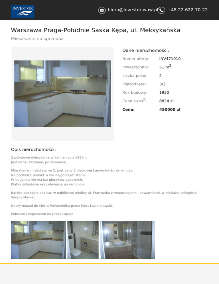 [email protected] +48 22 622-70-22 Warszawa Praga-Południe Saska Kępa, ul. Meksykańska Mieszkanie na sprzedaż Dane nieruchomości: Numer oferty: INV471010 Powierzchnia: 51 m Liczba pokoi: 2 Piętro/Pięter 3/3 Rok budowy: 1950 2 2 Cena za m : 8824 zł Cena: 450000 zł Opis nieruchomości: 2 pokojowe mieszkanie w kamienicy z 1950 r. Jest ciche, zadbane, po remoncie. Mieszkanie mieści się na 2. piętrze w 3 piętrowej kamienicy (brak windy). Na podłodze parkiet w nie najgorszym stanie. W budynku nie ma już piecyków gazowych. Klatka schodowa oraz elewacja po remoncie. Bardzo spokojna okolica, w najbliższej okolicy ul. Francuska z restauracjami i kawiarniami, w niedużej odległości Simply Market. Dobry dojazd do Metra Politechnika przez Most Łazienkowski. Polecam i zapraszam na prezentację! [email protected] +48 22 622-70-22