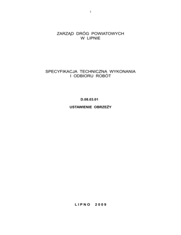 1 ZARZĄD DRÓG POWIATOWYCH W LIPNIE SPECYFIKACJA TECHNICZNA WYKONANIA I ODBIORU ROBÓT D.08.03.01 USTAWIENIE OBRZEŻY LIPNO 2009 2 1. Wstęp 1.1. Przedmiot SST. Przedmiotem niniejszej szczegółowej specyfikacji technicznej (SST) są wymagania dotyczące wykonawstwa i odbioru robót związanych z ustawieniem obrzeży betonowych. 1.2. Zakres stosowania SST Szczegółowa specyfikacja techniczna jest stosowana jako dokument przetargowy przy zlecaniu i realizacji robót wymienionych w p.1.1. 1.3. Zakres robót objętych SST. Ustalenia zawarte w niniejszej specyfikacji stanowią wymagania dotyczące robót związanych z ustawieniem obrzeży betonowych jako obramowania chodnika i obejmują: - ustawienie obrzeży betonowych 6x20 cm z wypełnieniem spoin przez z2lenie piaskiem. 1.4. Ogólne wymagania dotyczące robót. Wykonawca robót jest odpowiedzialny za jakość wykonanych robót oraz za ich zgodność z SST i poleceniami Inżyniera . 2. Materiały. 2.1. Materiałami stosowanymi przy ustawianiu obrzeży betonowej są: 2.1.1. Obrzeża betonowe 6X20 cm – elementy prefabrykowane posiadające atest wytwórcy, powinny odpowiadać normie BN-80/6775-03/04 i BN-80/6775-03/01. 2.1.2. Piasek użyty do wykonania podsypki powinien odpowiadać normie PN-B06711. 2.1.3. Cement stosowany do wykonania podsypki cementowo piaskowej powinien być cementem portlandzkim zwykłym bez dodatków marki 35, powinien odpowiadać wymogom normy PN-B-19701. 2.1.4. Woda stosowana powinna odpowiadać normie PN-B-32250 odmiana 1. Woda powinna być czysta bez zawartości szkodliwych dodatków. Bez badań laboratoryjnych można stosować wodociągową wodę pitną. Gdy pochodzi z wątpliwych źródeł nie może być użyta bez jej przebadania zgodnie z wyżej podaną normą. 2.2. Składowanie materiałów. 2.2.1. Obrzeża powinny być składowana na otwartej przestrzeni, na podłożu wyrównanym i odwodnionym. Obrzeża należy składować w pozycji wbudowania z zastosowaniem przekładek grub. 2,5 cm i szer. 5 cm. 2.2.2. Piasek każdego gatunku należy przechowywać w warunkach zabezpieczających przed zmieszaniem z innymi kruszywami i zanieczyszczeniem. 2.2.3. Cement w workach powinien być składowany w wydzielonych miejscach z2szonych z zabezpieczeniem boków przed opadami. Podłoga składu powinna być twarda i sucha, odpowiednio pochylona, zabezpieczająca cement przed ściekaniem wody deszczowej, zanieczyszczeniem i zawilgoceniem. Cement luzem powinien być składowany w zbiornikach stalowych z2osowanych do pneumatycznego załadunku i wyładunku oraz zaopatrzony w 3 urządzenia do przeprowadzania kontroli objętości i włazy do czyszczenia zbiornika. W zbiorniku należy przechowywać cement jednego rodzaju i marki pochodzący od jednego wykonawcy. 3. Sprzęt Roboty związane z ustawianiem obrzeża mogą być wykonywane ręcznie z z2osowaniem łopat i grabi. Sprzęt powinien być w stanie zapewniającym uzyskanie dobrej jakości robót. 1. Transport. 4.1. Obrzeża betonowe mogą być przewożone dowolnymi środkami transportu. Po osiągnięciu przez beton wytrzymałości min. 0,7 R kostki należy układać na z2adach drewnianych w pozycji pionowej długością w kierunku osi podłużnej środka transportowego. Elementy muszą być zabezpieczone przed przemieszczaniem i uszkodzeniami w czasie transportu. 4.2. Piasek należy przewozić dowolnymi środkami transportu w warunkach zabezpieczających przed zanieczyszczeniem oraz zmieszaniem z innymi materiałami. z2as transportu piasek powinien być zabezpieczony przed wysypaniem i rozpyleniem. 4.3. Cement należy przewozić środkami transportu w warunkach zabezpieczających go przed opadami atmosferycznymi i zawilgoceniem, uszkodzeniem opakowań i z2eczyszczeniem. Do przewozu cementu luzem należy używać wagonów i samochodów z z2osowanymi do tego celu pojemnikami zamkniętymi. 5. Wykonanie robót W przygotowanym wykopie liniowym o wyprofilowanym i zagęszczonym z2ży rozścielić podsypkę cementowo piaskową. Na wyrównanej podsypce ustawić edustawić obrzeża, wyregulować. Obrzeża mogą wystawać ponad poziom chodnika na wysokość 2-5 cm, znajdować się na poziomie chodnika lub 1-2 cm niżej dla z2wnienia należytego odwodnienia chodnika. Po ustawieniu i wyregulowaniu obrzeży należy je oczyścić oraz wypełnić z2y piaskiem. Zewnętrzną ścianę obrzeży obsypać ziemia wraz z jej ubiciem. 1. Kontrola jakości robót 1.1.Badania i kontrola przed przystąpieniem do robót. Przed przystąpieniem do robót Wykonawca powinien wykonać badanie materiałów przeznaczonych do wykonania robót i przedstawić wyniki tych badań Inżynierowi według zasad określonych w punkcie 2 niniejszej SST. 1.2.Badania i pomiary ustawionego obrzeża. Badania i pomiary ustawionego obrzeża przeprowadza się dla: - linii obrzeża, - wypełnienia spoin. 4 1.2.1. Linia obrzeża. Profil podłużny górnej powierzchni obrzeża powinien być zgodny z projektowaną niweletą. Dopuszczalne odchylenie linii obrzeża w planie od linii projektowanej może wynosić 1 cm na każde 100 ustawionego obrzeża. 1.2.2. Wypełnienie spoin bada się na każde 10 m ustawionego obrzeża. Spoiny muszą być wypełnione całkowicie na pełną głębokość. 2. Obmiar robót Jednostką obmiaru robót jest metr ustawionych obrzeży betonowych. Obmiar należy wykonać na budowie w obecności Inżyniera. Obmiar polega na określeniu rzeczywistej ilości ustawionego obrzeża. 3. Odbiór robót. 3.1. Odbiorowi podlega ustawione obrzeże na podsypce cementowo piaskowej. Obrzeża betonowe uznaje się za wykonany zgodnie z dokumentacja projektową jeśli wszystkie wyniki badań i pomiary okazały się zgodne z wymaganiami określonymi w pkcie 2,5,6 niniejszej SST. 3.3. W przypadku stwierdzenia wad Inżynier ustali zakres robót poprawkowych lub poleci rozbiórkę wykonanego chodnika i ponowne ułożenie według zasad określonych w niniejszej SST. Inżynier może uznać wadę za nie mającą zasadniczego wpływu 