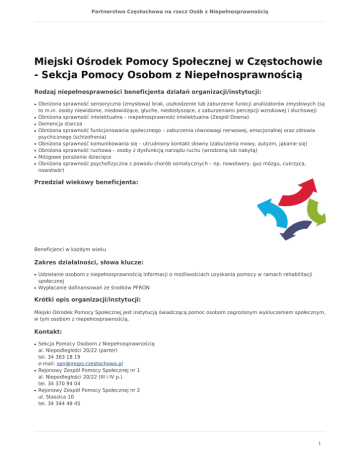 Partnerstwo Częstochowa na rzecz Osób z Niepełnosprawnością Miejski Ośrodek Pomocy Społecznej w Częstochowie - Sekcja Pomocy Osobom z Niepełnosprawnością Rodzaj niepełnosprawności beneficjenta działań organizacji/instytucji: ● ● ● ● ● ● ● ● Obniżona sprawność sensoryczna (zmysłowa) brak, uszkodzenie lub zaburzenie funkcji analizatorów zmysłowych (są to m.in. osoby niewidome, niedowidzące, głuche, niedosłyszące, z zaburzeniami percepcji wzrokowej i słuchowej) Obniżona sprawność intelektualna – niepełnosprawność intelektualna (Zespół Downa) Demencja starcza Obniżona sprawność funkcjonowania społecznego – zaburzenia równowagi nerwowej, emocjonalnej oraz zdrowia psychicznego (schizofrenia) Obniżona sprawność komunikowania się – utrudniony kontakt słowny (zaburzenia mowy, autyzm, jąkanie się) Obniżona sprawność ruchowa – osoby z dysfunkcją narządu ruchu (wrodzoną lub nabytą) Mózgowe porażenie dziecięce Obniżona sprawność psychofizyczna z powodu chorób somatycznych – np. nowotwory, guz mózgu, cukrzyca, nowotwór) Przedział wiekowy beneficjenta: Beneficjenci w każdym wieku Zakres działalności, słowa klucze: ● ● Udzielanie osobom z niepełnosprawnością informacji o możliwościach uzyskania pomocy w ramach rehabilitacji społecznej Wypłacanie dofinansowań ze środków PFRON Krótki opis organizacji/instytucji: Miejski Ośrodek Pomocy Społecznej jest instytucją świadczącą pomoc osobom zagrożonym wykluczeniem społecznym, w tym osobom z niepełnosprawnością. Kontakt: ● ● ● Sekcja Pomocy Osobom z Niepełnosprawnością al. Niepodległości 20/22 (parter) tel. 34 363 18 19 e-mail: [email protected] Rejonowy Zespół Pomocy Społecznej nr 1 al. Niepodległości 20/22 (III i IV p.) tel. 34 370 94 04 Rejonowy Zespół Pomocy Społecznej nr 2 ul. Staszica 10 tel. 34 344 49 45 1 Partnerstwo Częstochowa na rzecz Osób z Niepełnosprawnością www.mops.czestochowa.pl 2