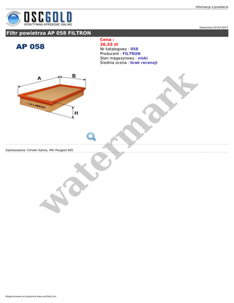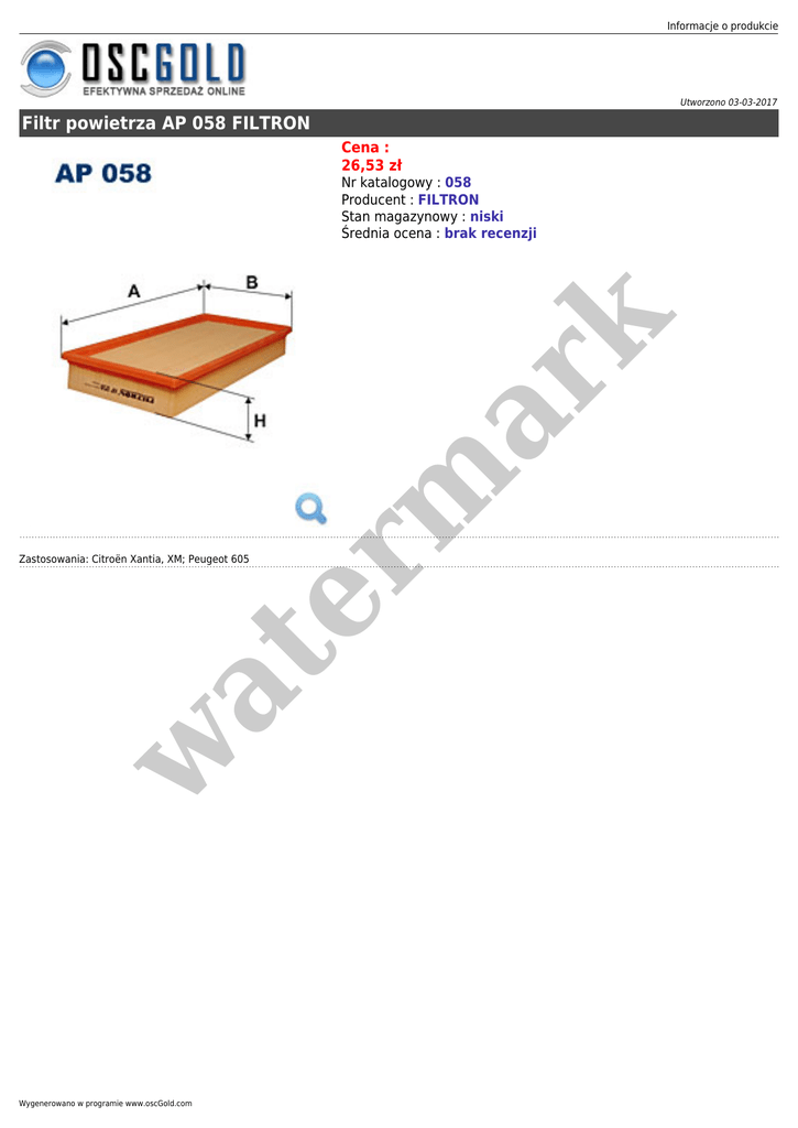 Informacje o produkcie Utworzono 03-03-2017 Filtr powietrza AP 058 FILTRON Cena : 26,53 zł er m ar k Nr katalogowy : 058 Producent : FILTRON Stan magazynowy : niski Średnia ocena : brak recenzji w at Zastosowania: Citroën Xantia, XM; Peugeot 605 Wygenerowano w programie www.oscGold.com